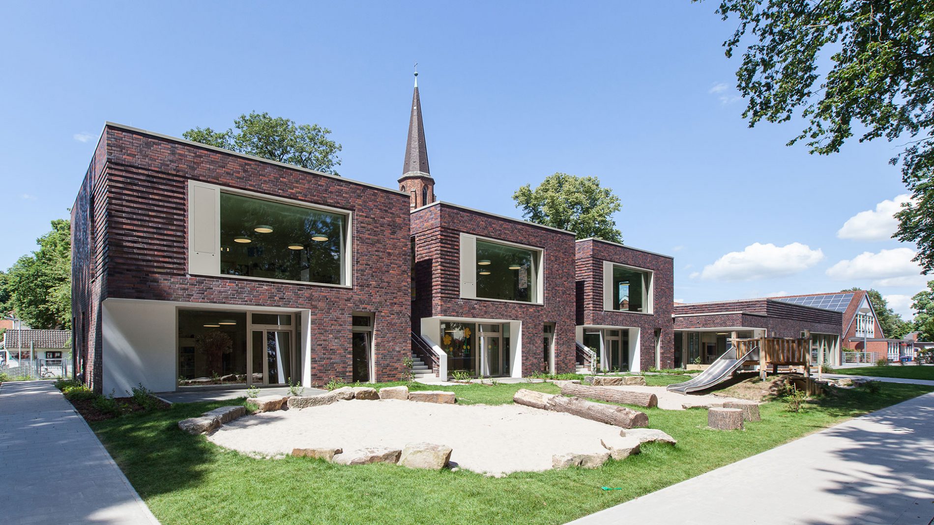 Der 2010 prämierte Wettbewerbsentwurf wurde 2013 fertig gestellt. An prominenter Lage in der Ortsmitte bildet die Kindertageseinrichtung zusammen mit der Kirche und dem Gemeindehaus ein Ensemble. In der Begründung der Jury heißt es dazu: In seiner städtebaulichen Proportionierung – nämlich Aufteilung des gesamten Volumens in drei bzw. vier Einzelhäuser – bildet sich eine differenzierte Volumetrie aus. So entsteht eine Maßstäblichkeit, die einem Kindergarten angemessen ist, ohne die Bauaufgabe zu verniedlichen.