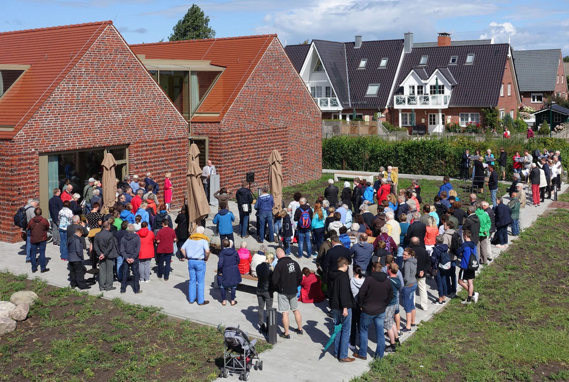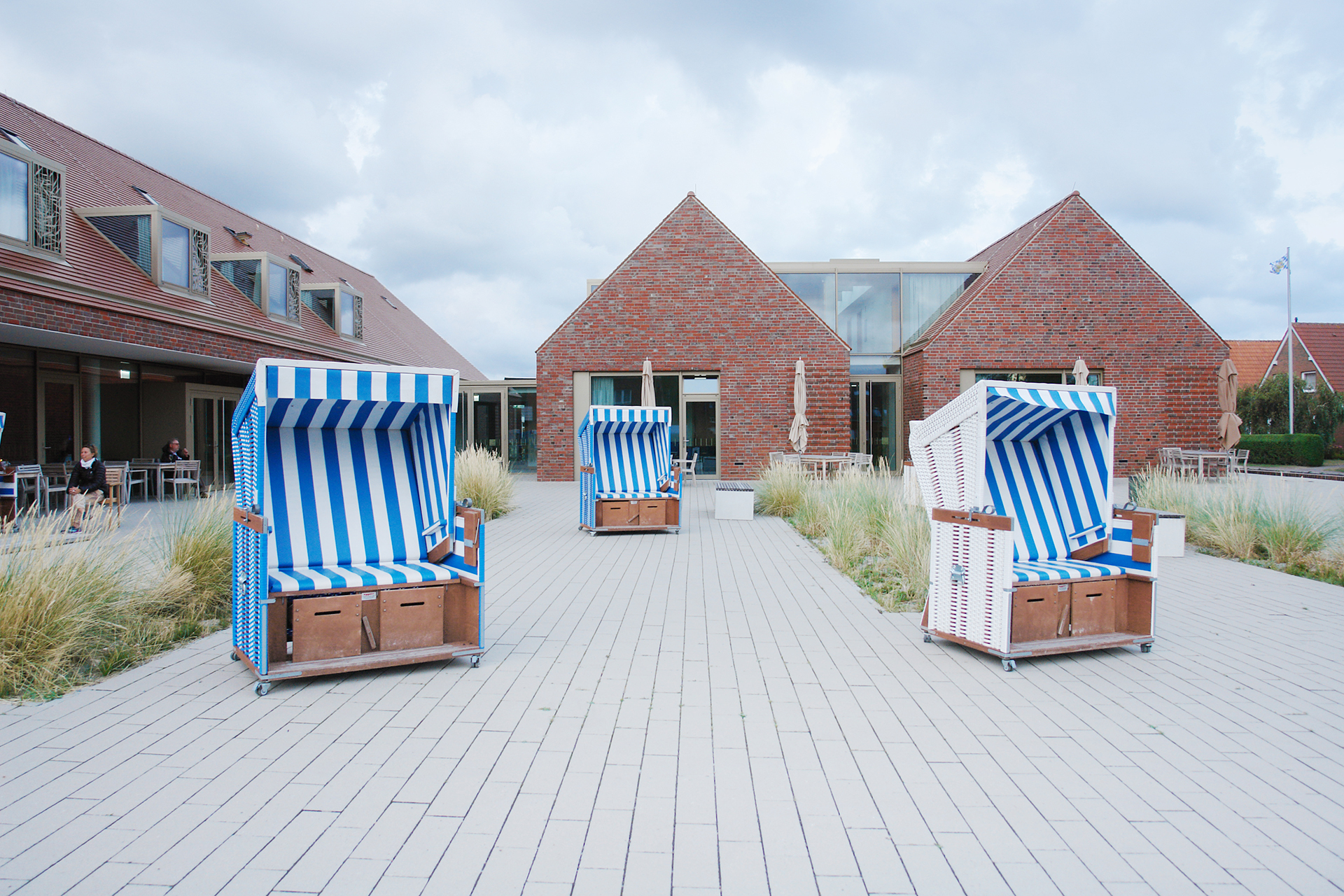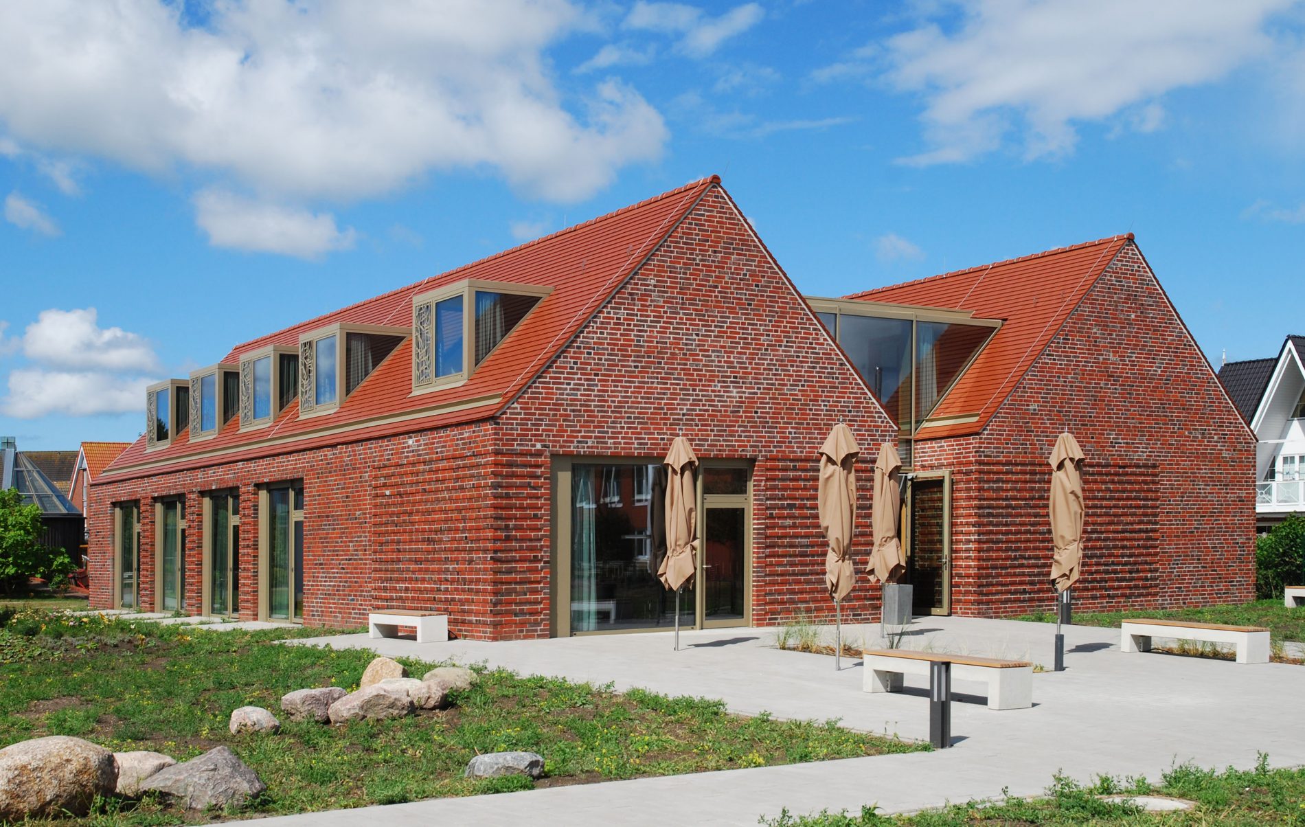 Der Gegensatz der massiven Klinkerfassaden und Ziegeldächer zu den großen Verglasungen und gläsernen Dachgauben fällt auf. Die Hausform mit ihren Giebeln und langgestreckten Satteldächern dagegen wirkt vertraut.