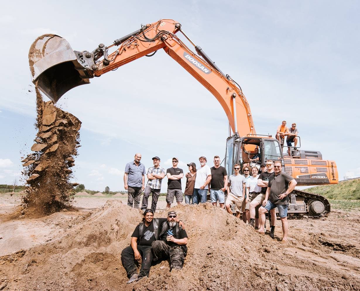 Mit einer zünftigen Baggerschaufel Aushub wurde der Baustart für den Neubau der Containermanufaktur in Herzfelde begangen. Alle Mitarbeiter der Containermanufaktur konnten als Baggerfahrer mit einer Schaufel Aushub etwas dazu beitragen.