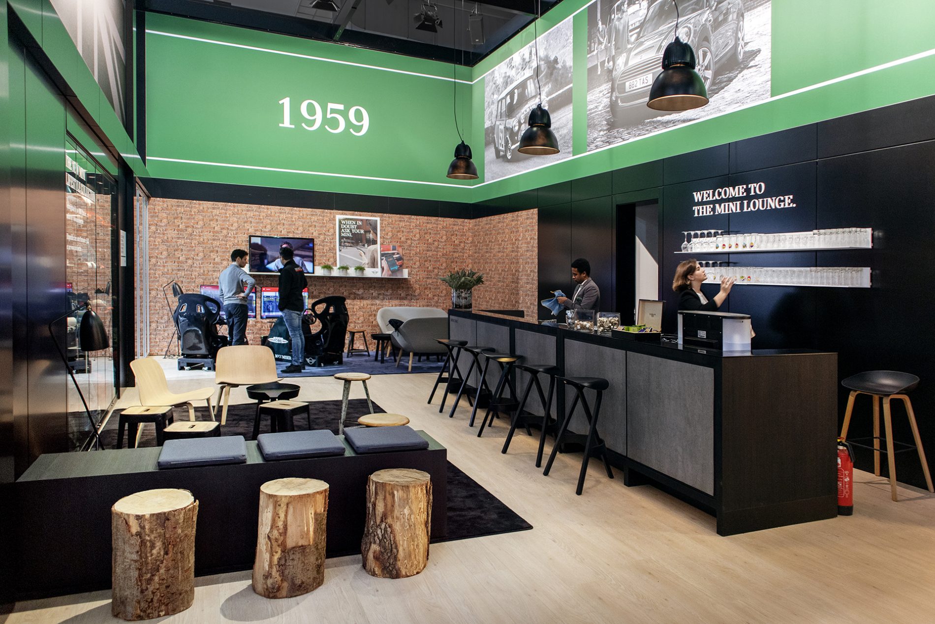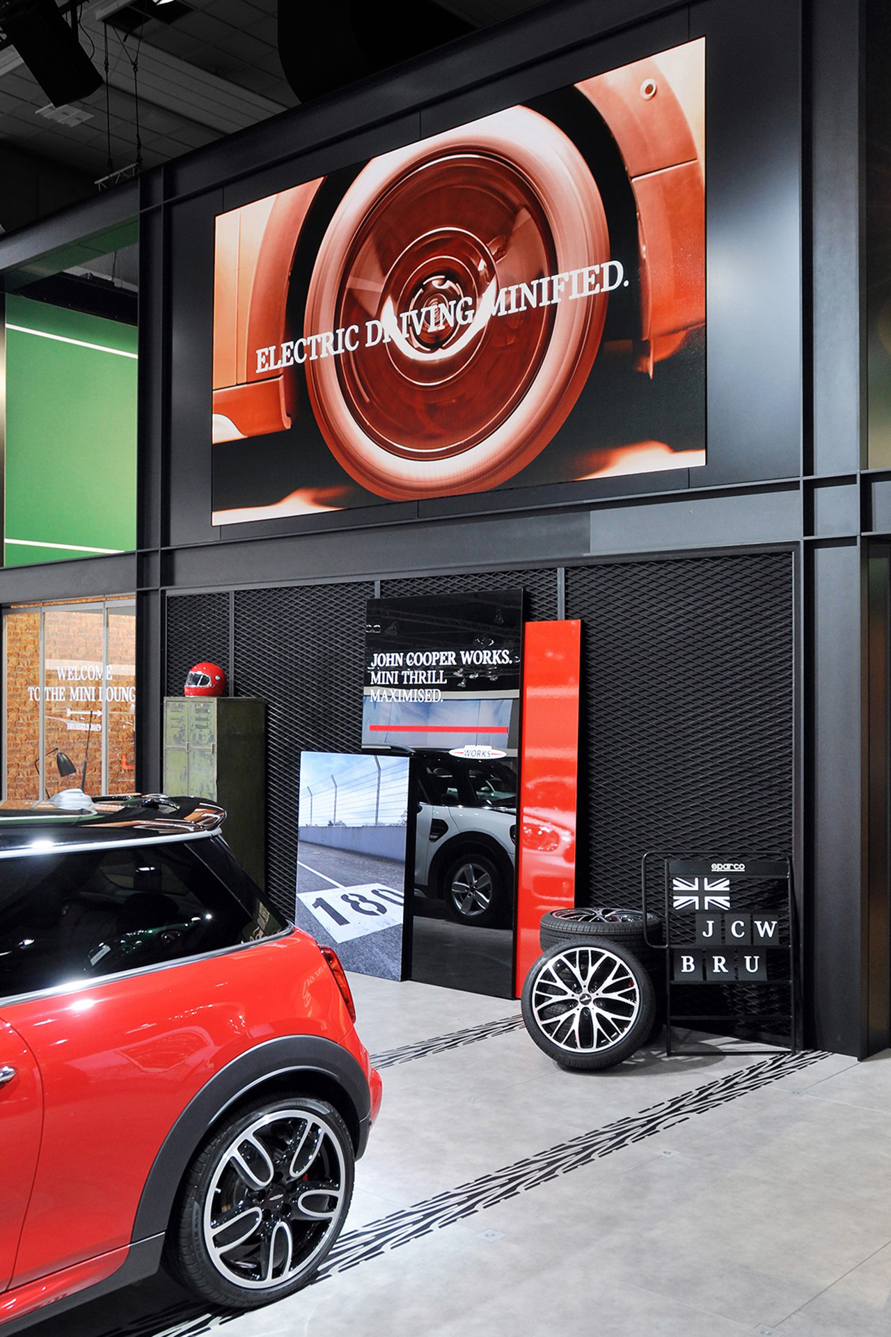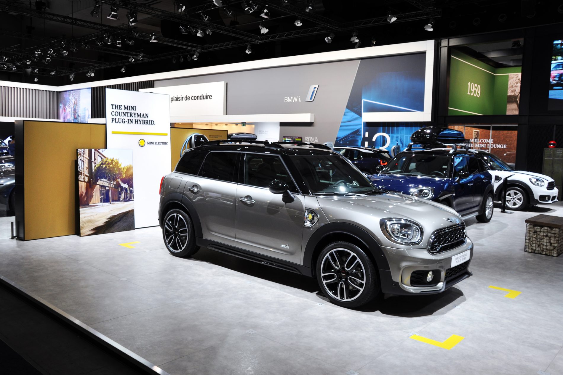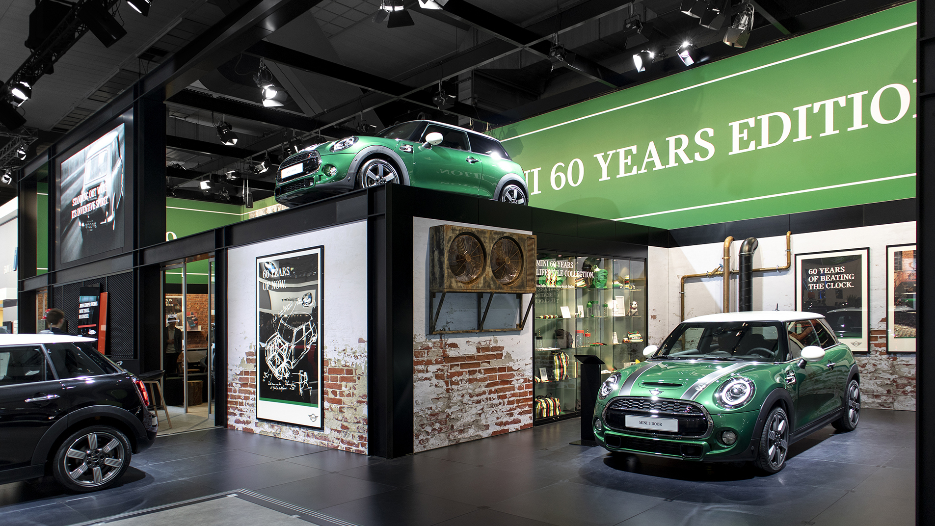 Um den Fokus auf die Marke und ihr Jubiläum zu unterstreichen, wird der Stand von einem umarmenden Band im „British Racing Green“ eingefasst, welches auch als Zeitachse von 1959 bis 2019 fungiert.