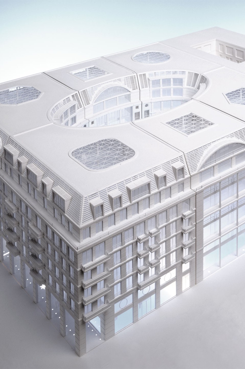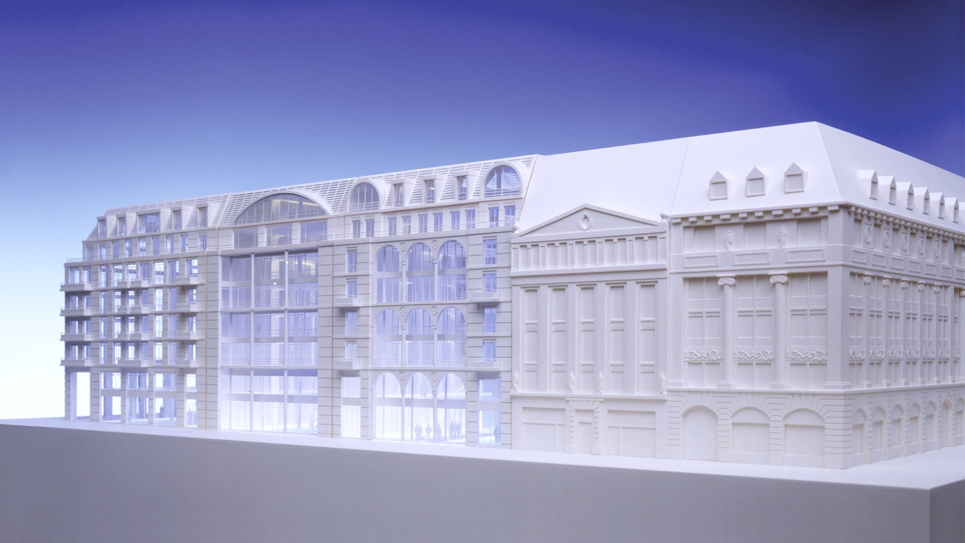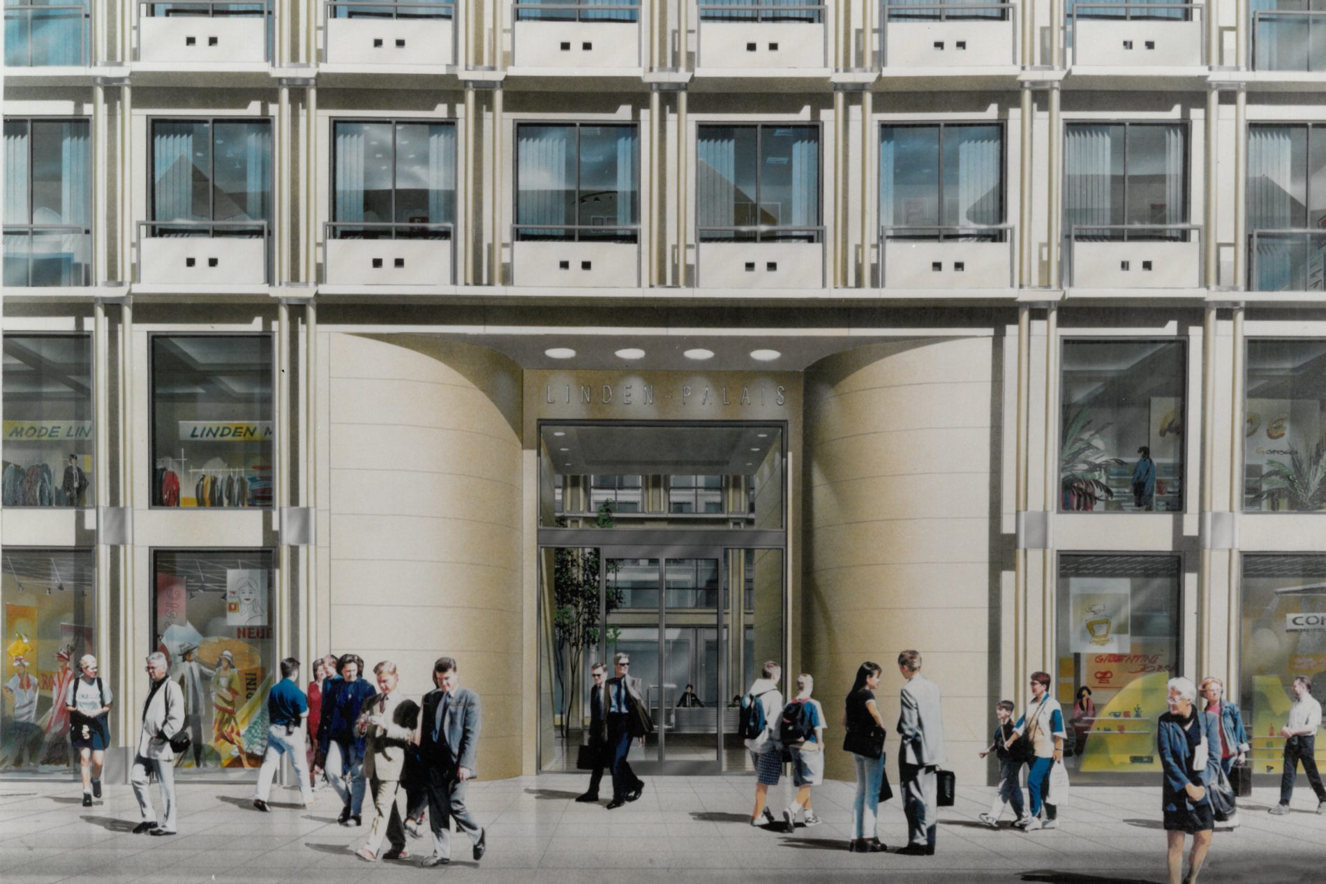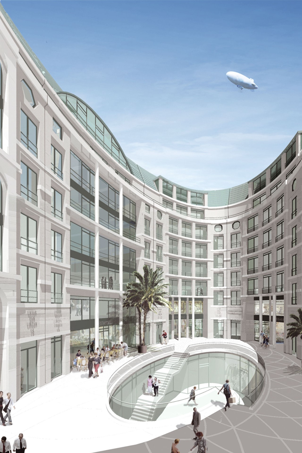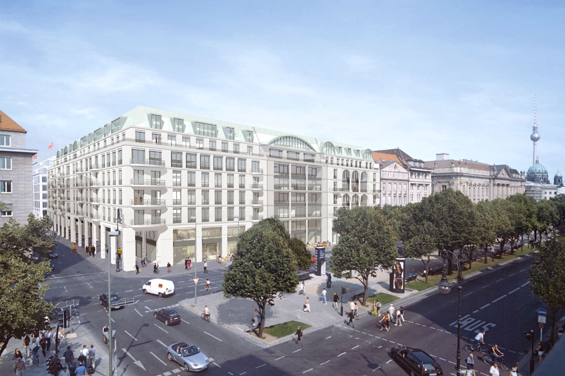 Der Entwurf setzt an die Stelle des Hotels Unter den Linden eine neue Bebauung aus sechs repräsentativen Stadtpalais, welche die historische Bauflucht aufnehmen. Ein ovaler, öffentlich zugänglicher Platz in der Mitte des Quartiers ist das verbindende Element der Stadtpalais. Die Palais mit repräsentativen Wohnungen, Büroflächen, Gastronomie und Handelsflächen bieten Adressen für höchste Ansprüche in einem historisch geprägten Stadtraum höchster Qualität.