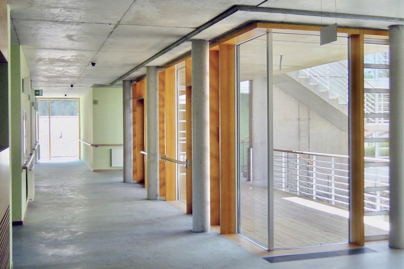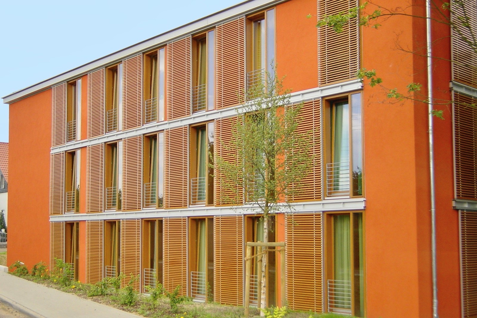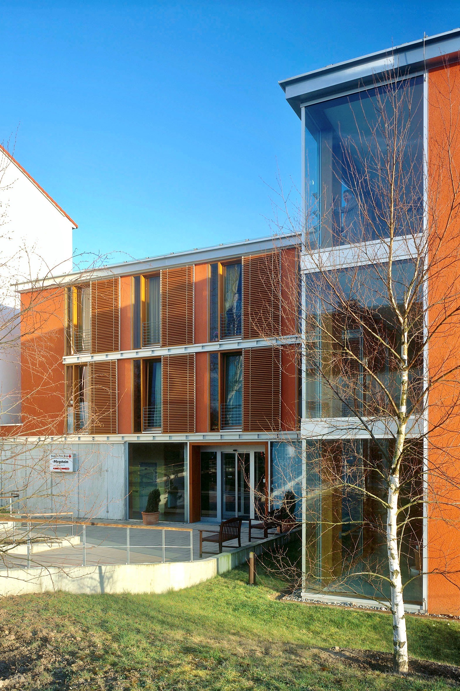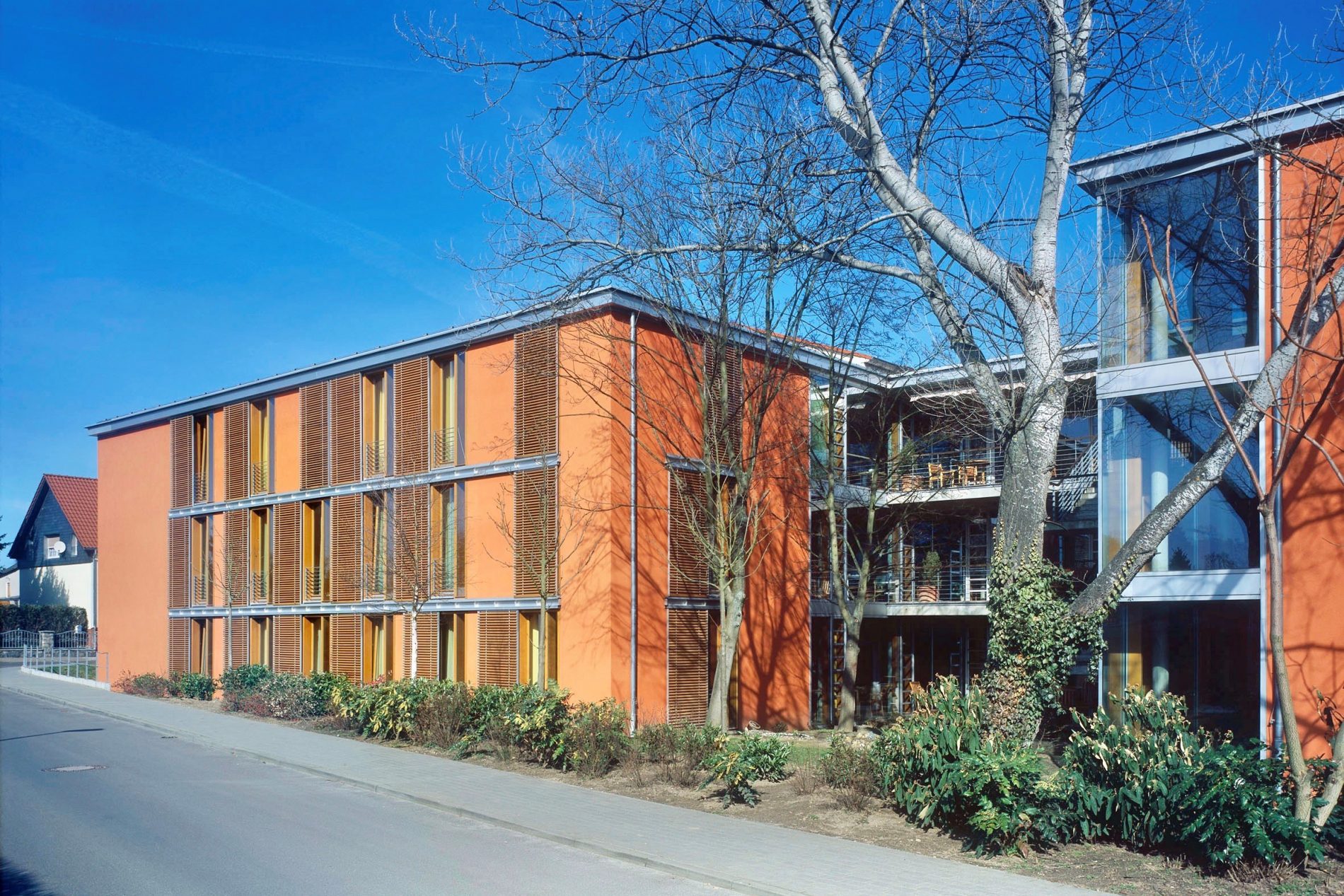 Der Erweiterungsbau der Seniorenresidenz in Althaldensleben öffnet sich mit leichter Geste dem Besucher. Der Blick fällt von den Korbstühlen im Foyer auf die ersten Blüten des Frühlings. Menschen sind selbstbestimmte Individuen und suchen zugleich Gemeinschaft, im Bedarfsfall auch Hilfe. Diesen Grundbedürfnissen folgt das Raumkonzept zwanglos und selbstverständlich. Das Farbkonzept der Etagen in Orange, Gelb und Grün wird in den textilen Bezügen der Möbel und der Stores weitergeführt. Dadurch wird den Bewohnern die Orientierung in der Residenz erleichtert. Große Glasflächen in den Gemeinschaftsbereichen ermöglichen Lichtbeziehungen zu Vorplatz und Garten. Die Atmosphäre der Residenz ist sympathisch und offen. Bewohner, Pflegepersonal und Gäste fühlen sich gut aufgehoben und erfahren zugleich spannende Raumeindrücke in einem Haus mit Zukunft.