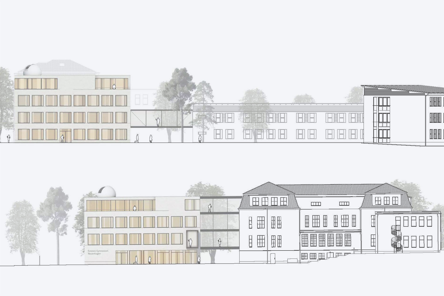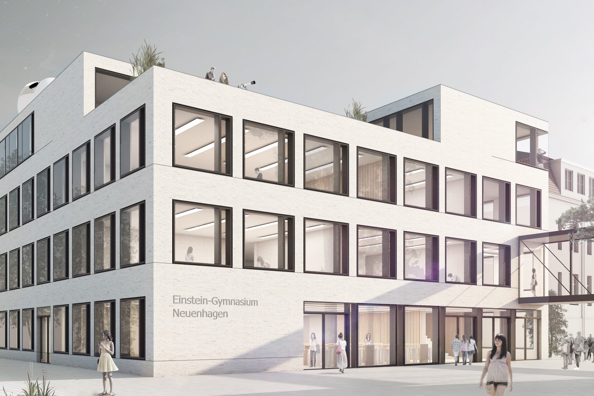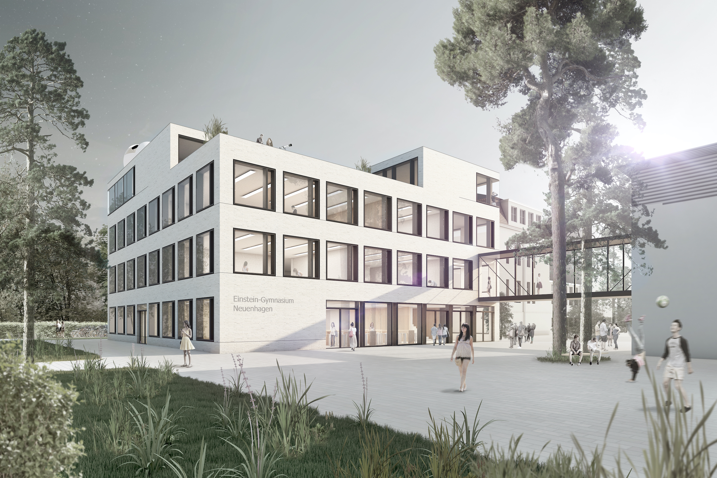 Die Gartenstadt Neuenhagen ist durch frei stehende Ein- und Mehrfamilienhäuser und einen hohen Grünanteil geprägt. Dieses Prinzip wird im Entwurf in einem größeren Maßstab aufgenommen und interpretiert. Drei Gebäude, welche über Brücken, Aufzüge und die neue zentrale Treppe barrierefrei verbunden werden, bestimmen zukünftig das Bild des Einstein-Gymnasiums und spiegeln die baugeschichtliche Entwicklung des Areals wieder.