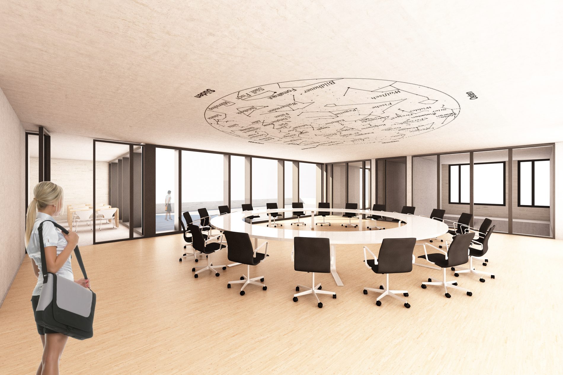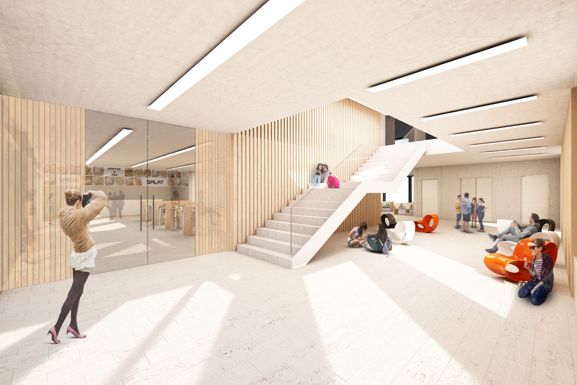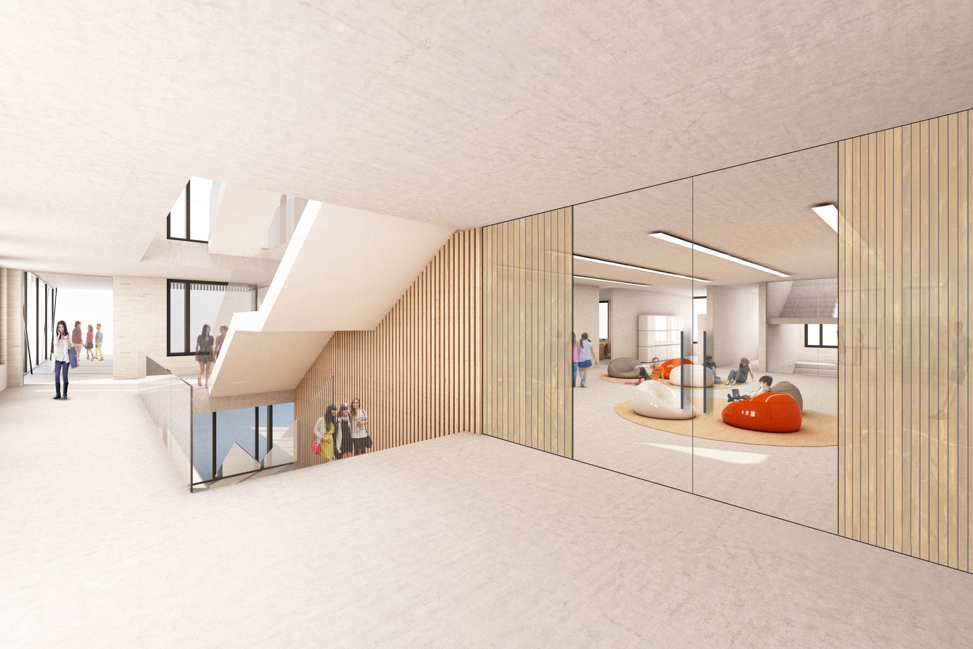 Die Gartenstadt Neuenhagen ist durch frei stehende Ein- und Mehrfamilienhäuser und einen hohen Grünanteil geprägt. Dieses Prinzip wird im Entwurf in einem größeren Maßstab aufgenommen und interpretiert. Drei Gebäude, welche über Brücken, Aufzüge und die neue zentrale Treppe barrierefrei verbunden werden, bestimmen zukünftig das Bild des Einstein-Gymnasiums und spiegeln die baugeschichtliche Entwicklung des Areals wieder.