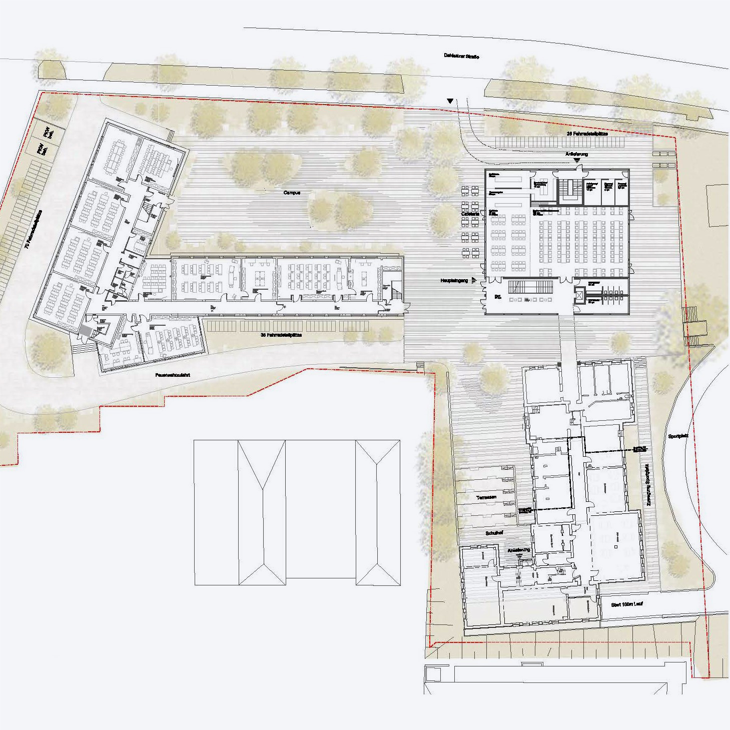 Ziel des Entwurfs ist es, mit der Setzung des Erweiterungsbau an der Dahlwitzer Straße die heterogene Struktur des bestehenden Gebäudeensembles in einer neuen Qualität zu ordnen und dem Gymnasium eine moderne und zugleich wertige Identität zu geben, die dem Anspruch eines humanistisch-naturwissenschaftlichen Gymnasiums gerecht wird und die Zukunftsfähigkeit des Standortes sichert.