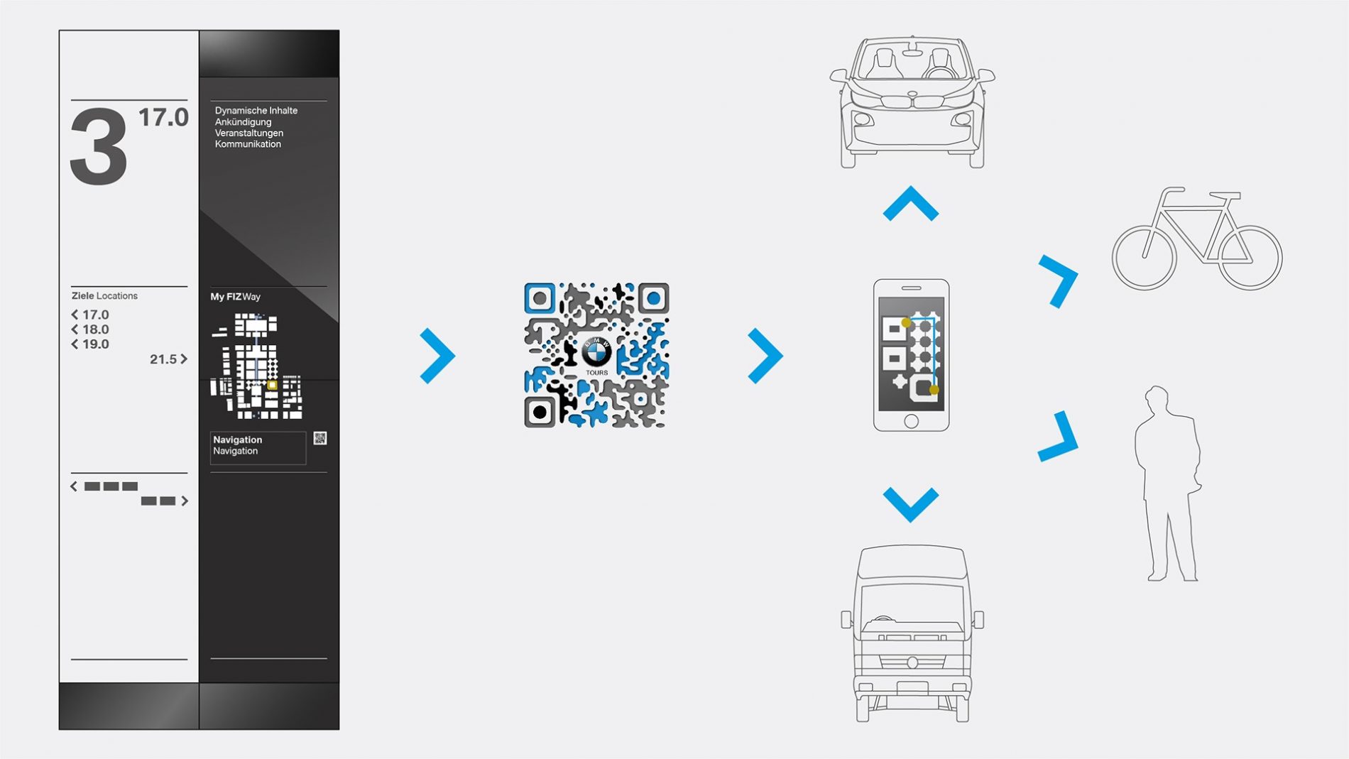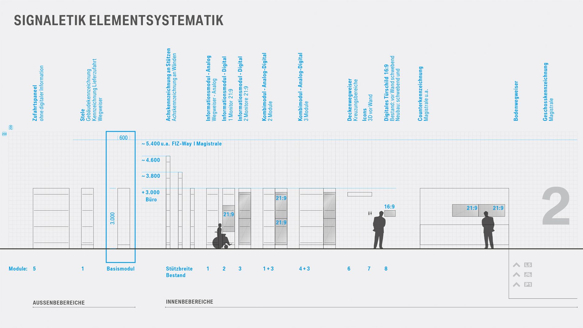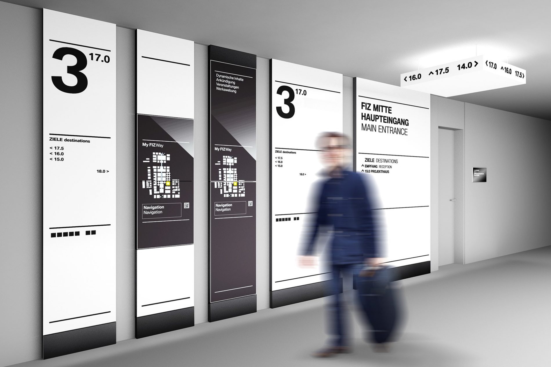 Die Erweiterung des FIZ Areals erfordert ein übergreifendes Navigations- und Signaletik-Konzept für Außen- und Innenräume, das Personen-, Waren- und Informationsströme effizient, eindeutig und verständlich organisiert werden.