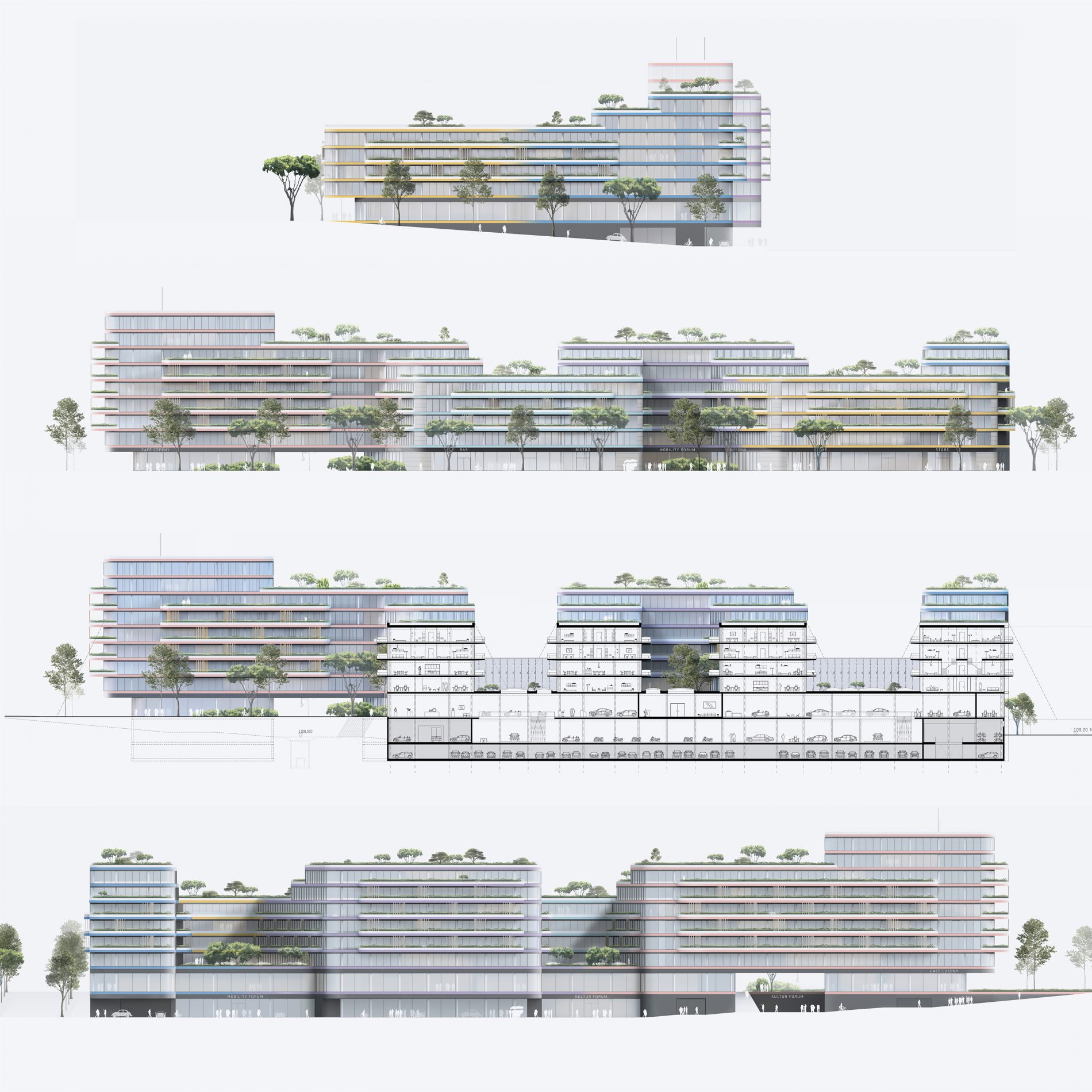 Arbeiten und Wohnen werden im Entwurf in ein grundlegend neues Verhältnis gesetzt, welches die traditionelle starre Trennung zwischen den Nutzungen aufhebt und ein zeitgemäßes Arbeits- und Lebenskonzept mit digitalen Angeboten und einem hohen Maß an Kommunikation und Gemeinschaftsflächen anbietet. Das hybride Gebäudeensemble vereint Wohnungen, Studios, Ateliers, Gemeinschafts-, Büro- und Gewerbeflächen.