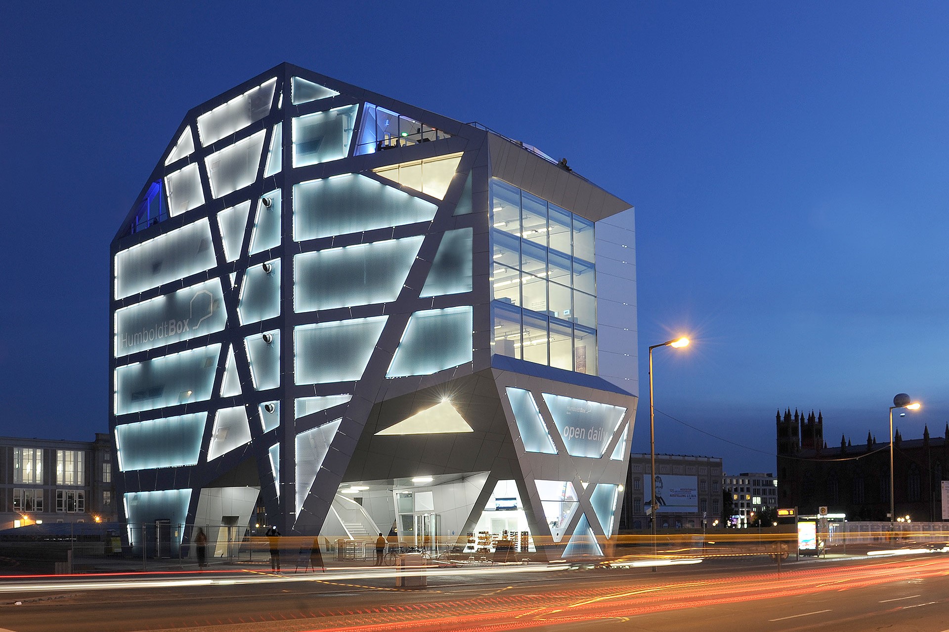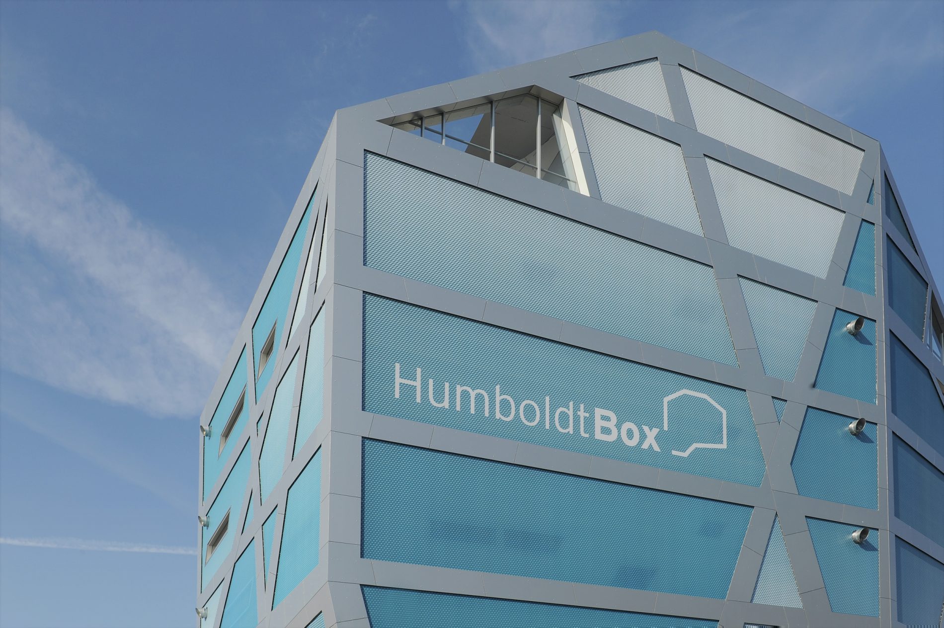 Die Humboldt-Box ist ein Kunstobjekt und hebt sich als universaler Werbeträger für den Neubau des Humboldtforums deutlich von den historischen Fassaden des Umfeldes ab. Die Fassaden bestehen aus bedruckten, flexibel austauschbaren Membranen, welche die Flächen zwischen den mit Aluminium verkleideten geneigten Stützen füllen und der Humboldtbox ihre unverwechselbare Gestalt geben. Die innovative Membranfassade wird in der Nacht künstlerisch über Leuchten in der Fassade illuminiert. Künstler, Nutzer und Eventveranstalter können zusätzlich, über eine LED Wall in der Fassade, Videoclips mit Botschaften in den Stadtraum senden.