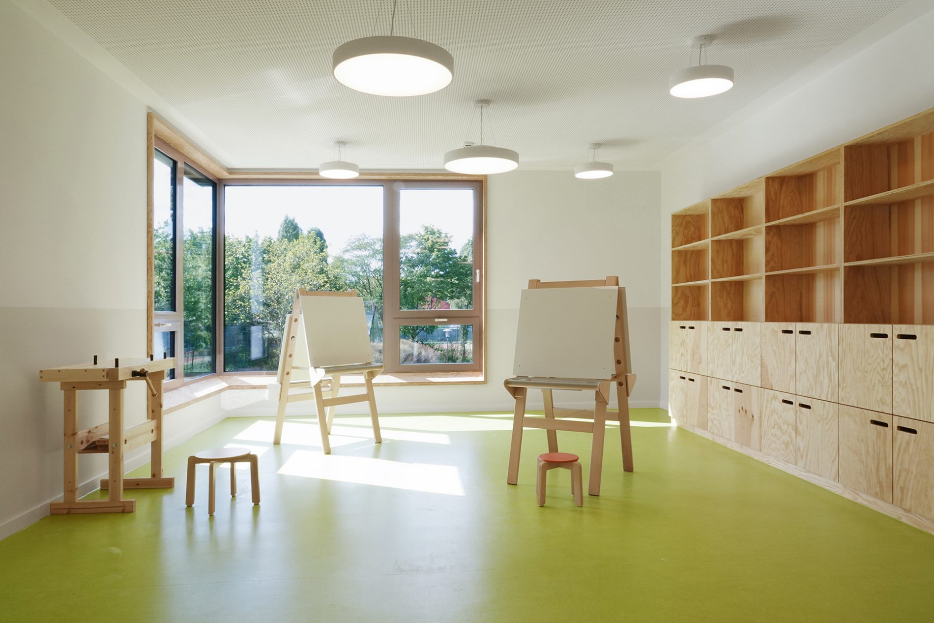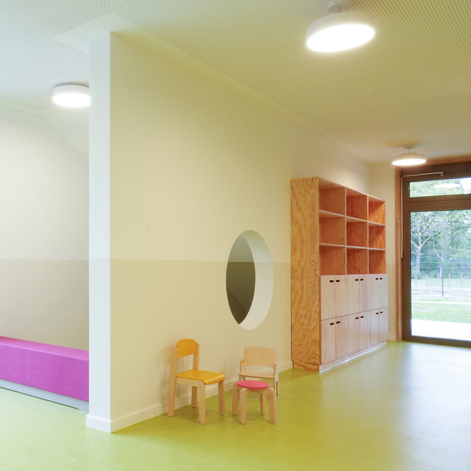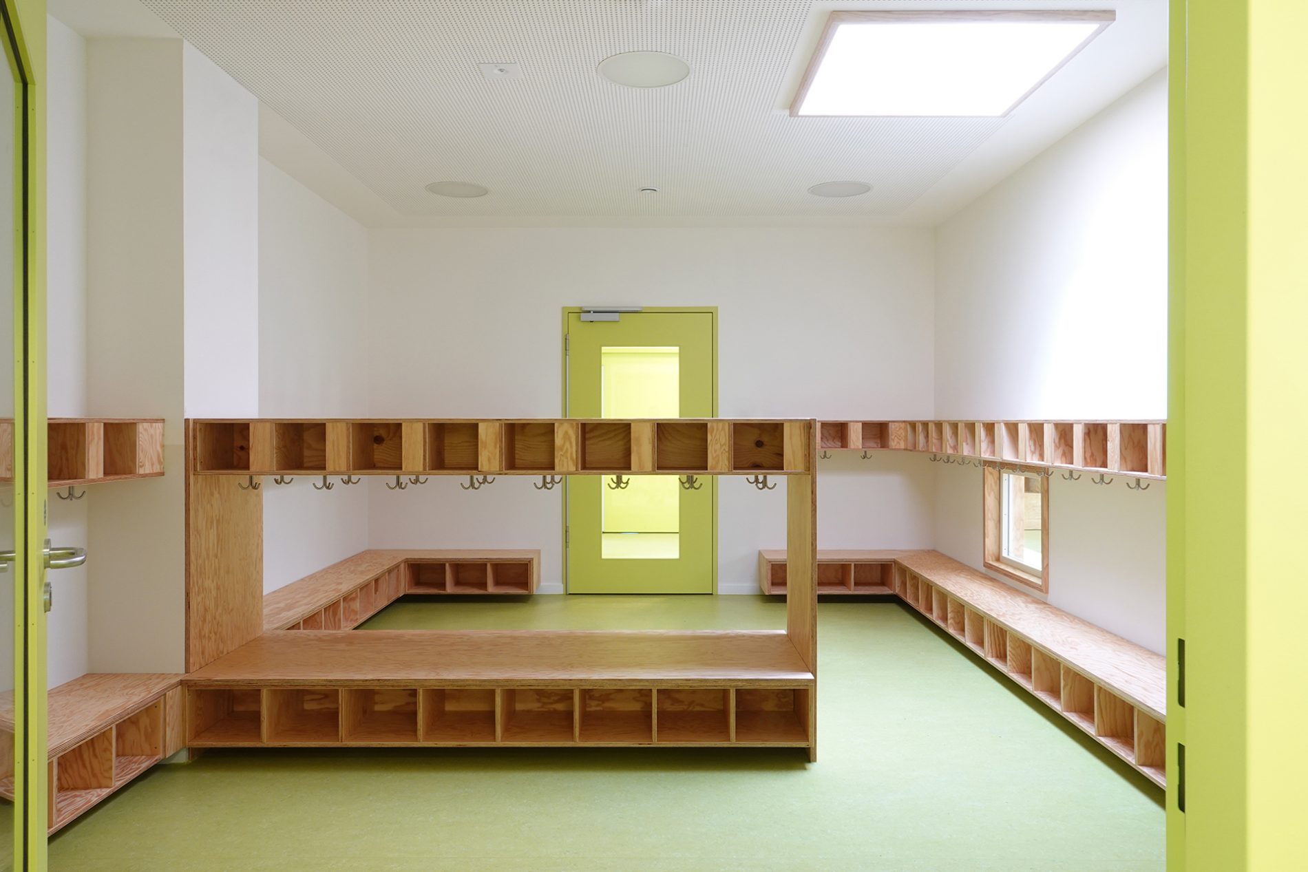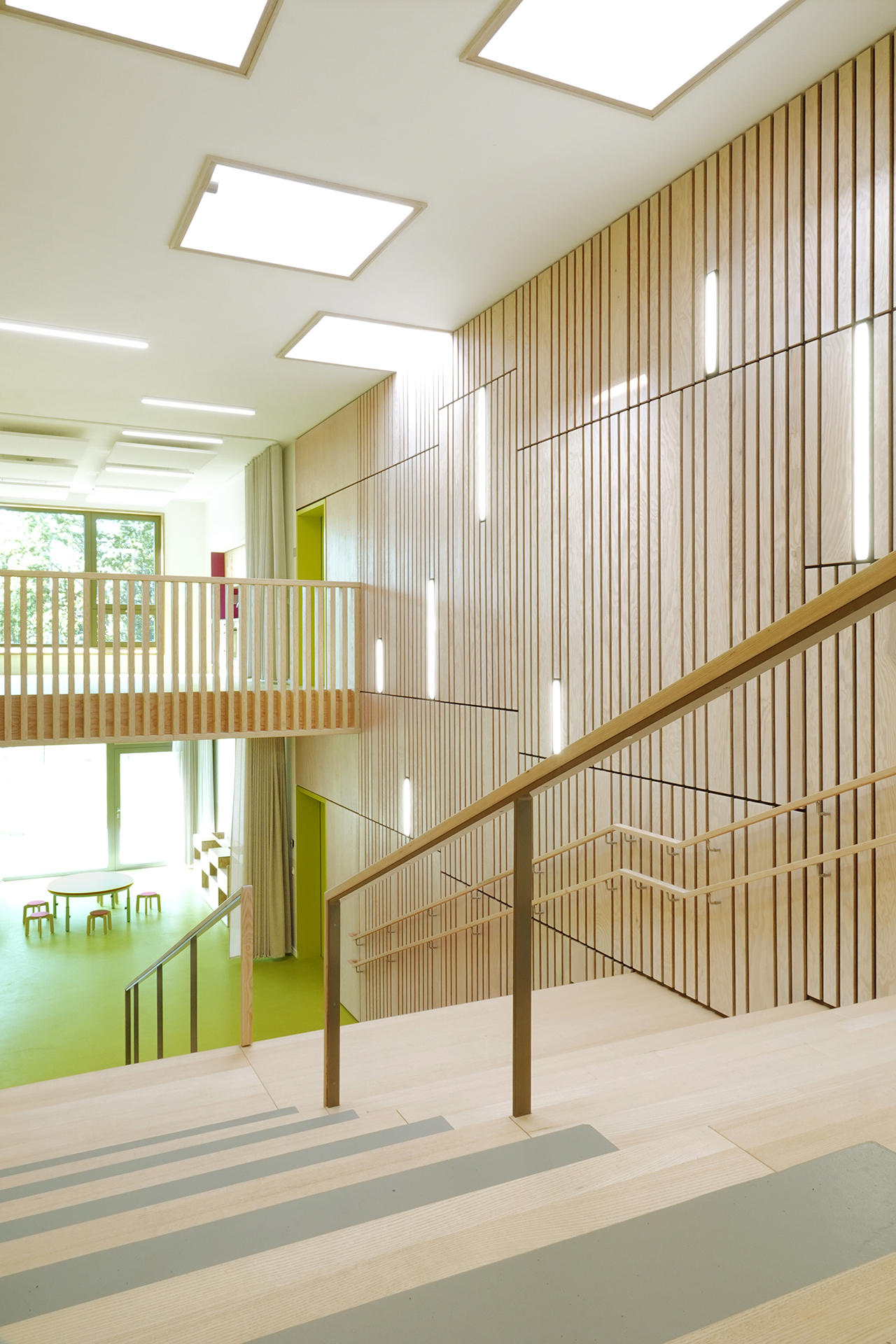 Der Baukörper ist in vier Zonen unterteilt. Nach Norden orientieren sich die Nebenbereiche und im Süden sind die Gruppenräume mit Bezug auf den Spielgarten positioniert. Gruppenräume, Sanitärbereiche und Garderoben bilden jeweils eine Funktionseinheit. Das Kinderrestaurant und die Differenzierungsbereiche sind nach Osten und Westen orientiert. Jeder Raum hat eine große, tief eingeschnittene Verglasung, die einen starken visuellen Bezug nach außen ermöglicht.