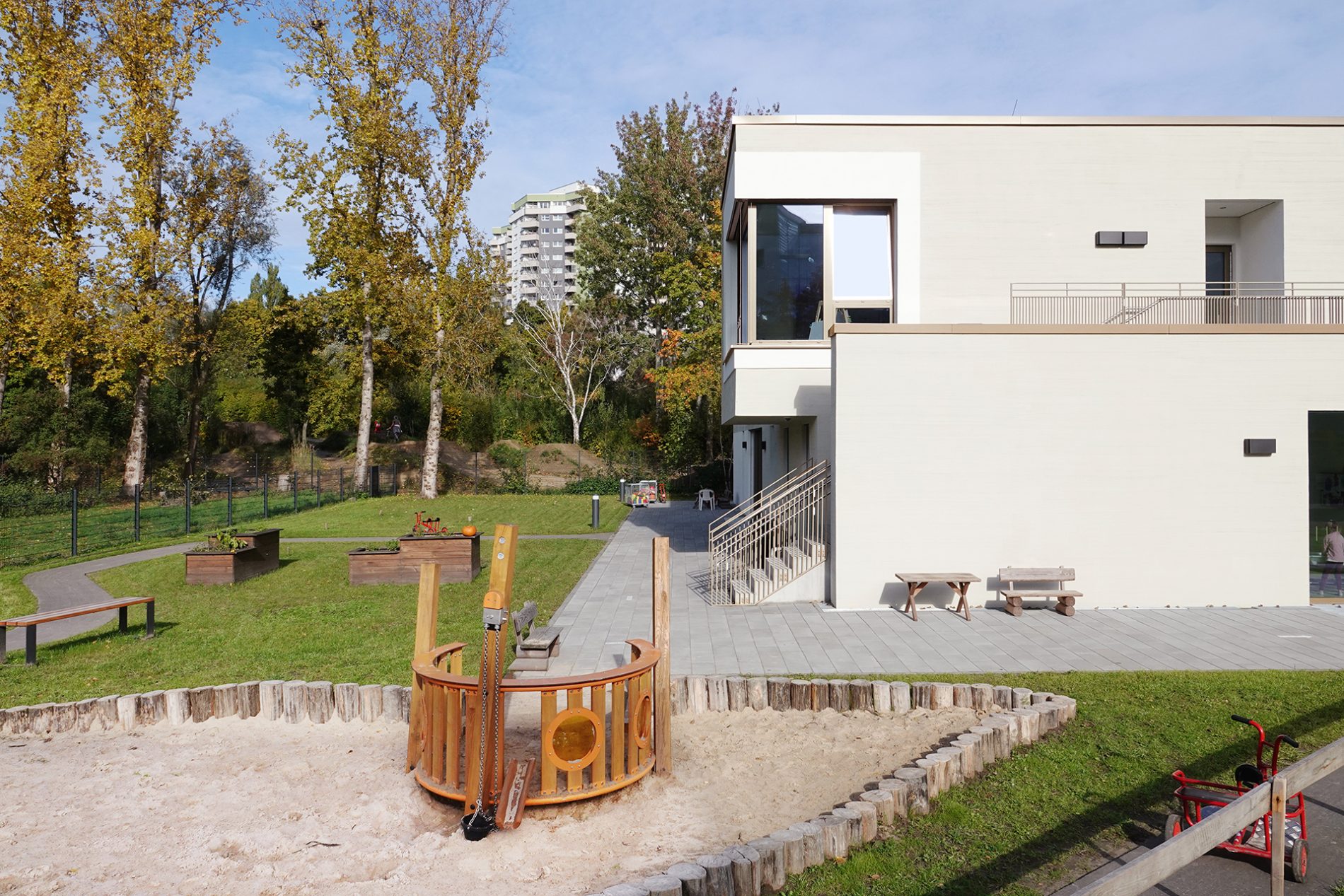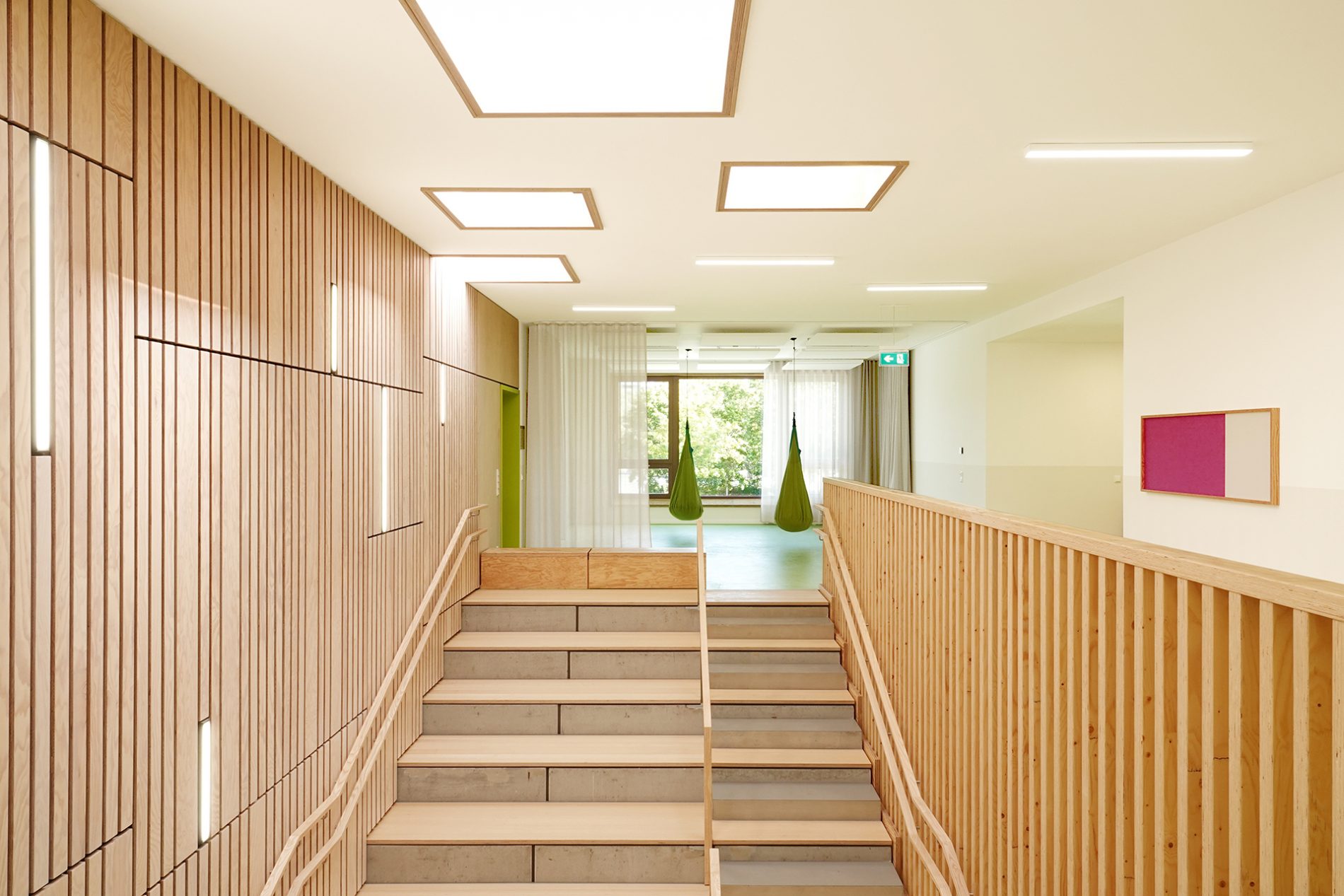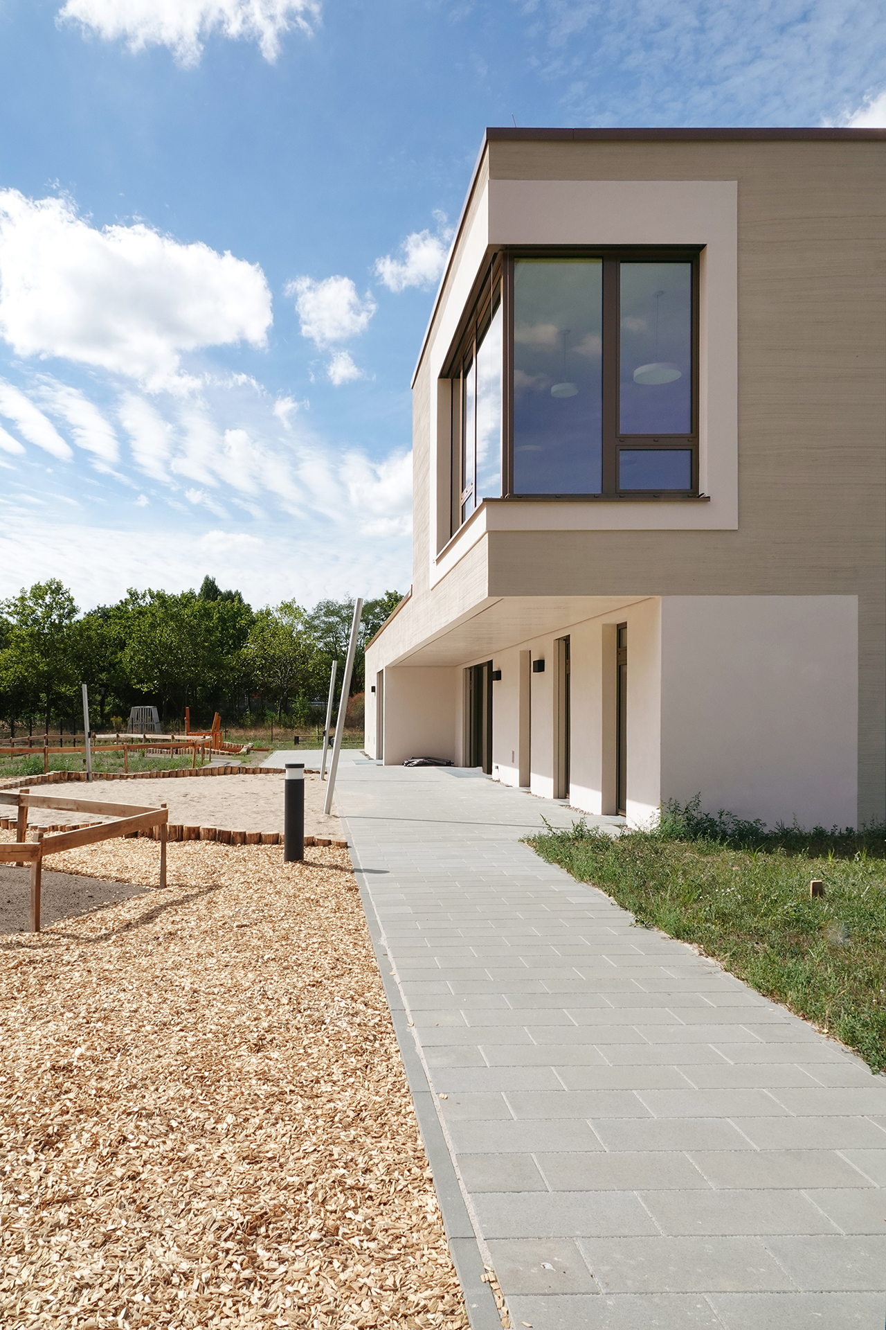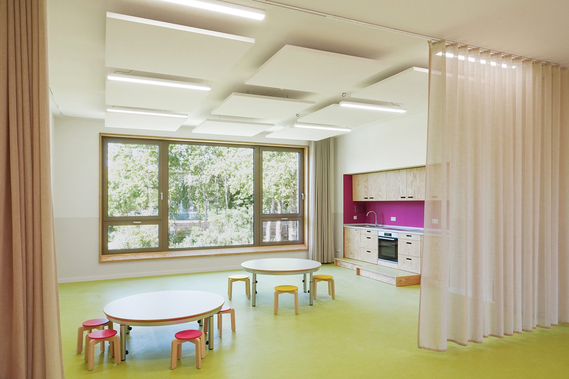 Der Baukörper ist in vier Zonen unterteilt. Nach Norden orientieren sich die Nebenbereiche und im Süden sind die Gruppenräume mit Bezug auf den Spielgarten positioniert. Gruppenräume, Sanitärbereiche und Garderoben bilden jeweils eine Funktionseinheit. Das Kinderrestaurant und die Differenzierungsbereiche sind nach Osten und Westen orientiert. Jeder Raum hat eine große, tief eingeschnittene Verglasung, die einen starken visuellen Bezug nach außen ermöglicht.