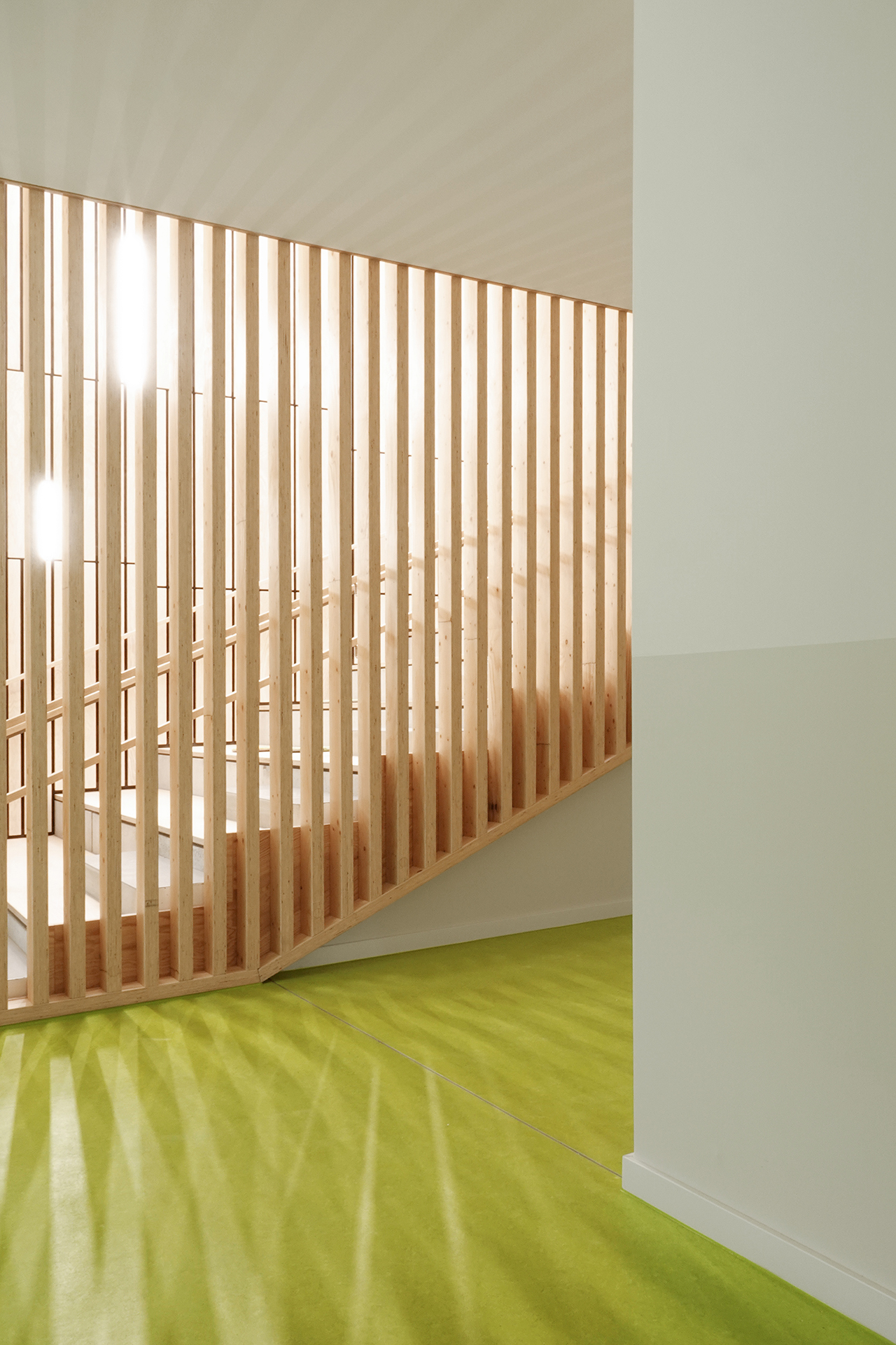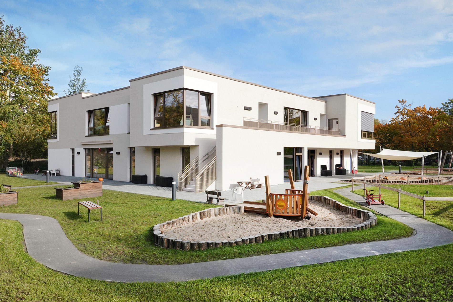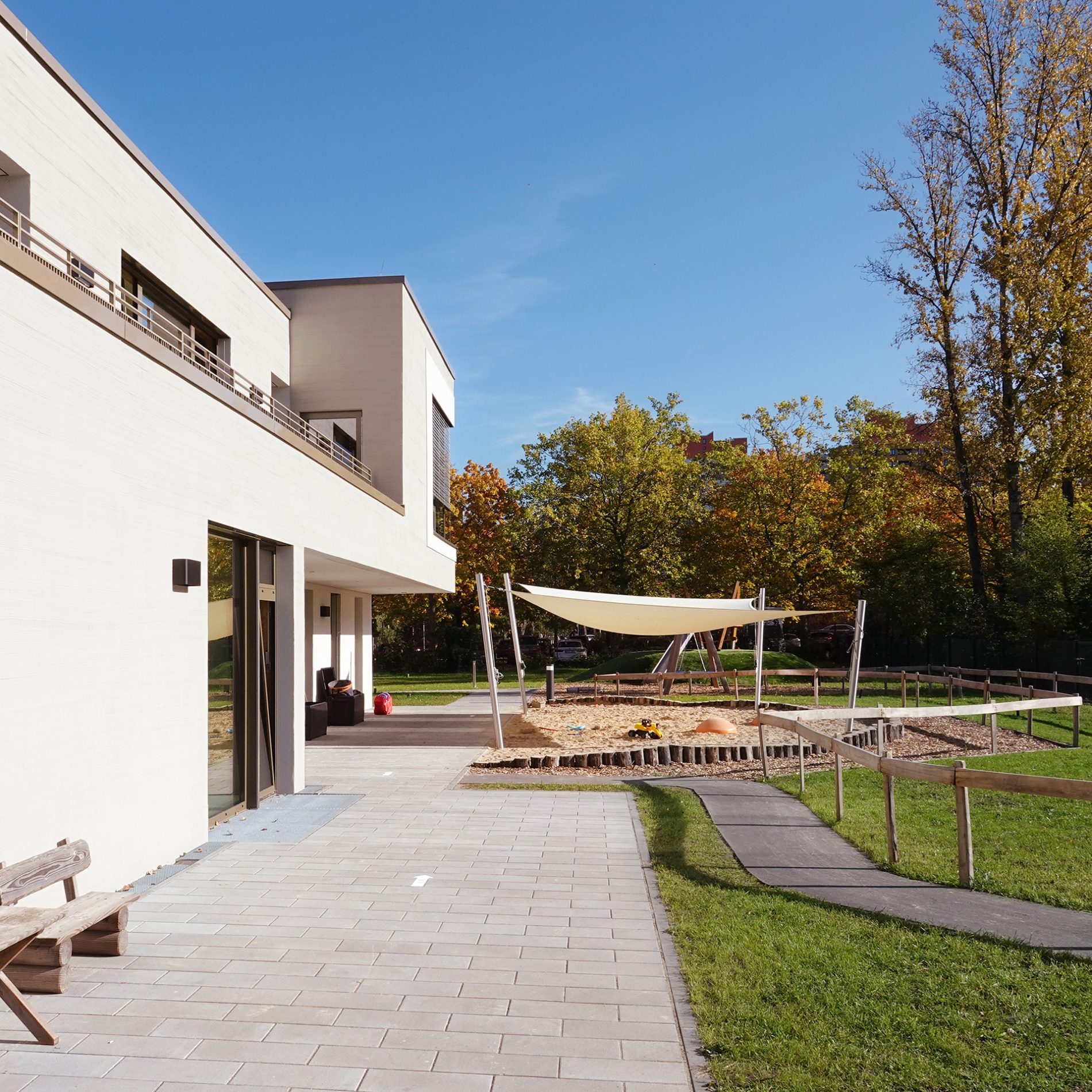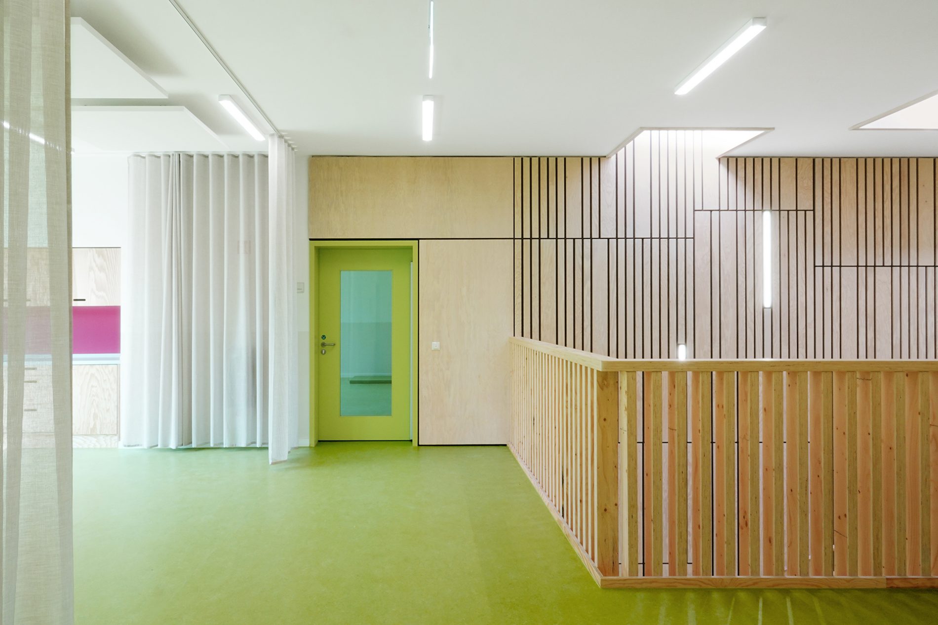 Der Baukörper ist in vier Zonen unterteilt. Nach Norden orientieren sich die Nebenbereiche und im Süden sind die Gruppenräume mit Bezug auf den Spielgarten positioniert. Gruppenräume, Sanitärbereiche und Garderoben bilden jeweils eine Funktionseinheit. Das Kinderrestaurant und die Differenzierungsbereiche sind nach Osten und Westen orientiert. Jeder Raum hat eine große, tief eingeschnittene Verglasung, die einen starken visuellen Bezug nach außen ermöglicht.