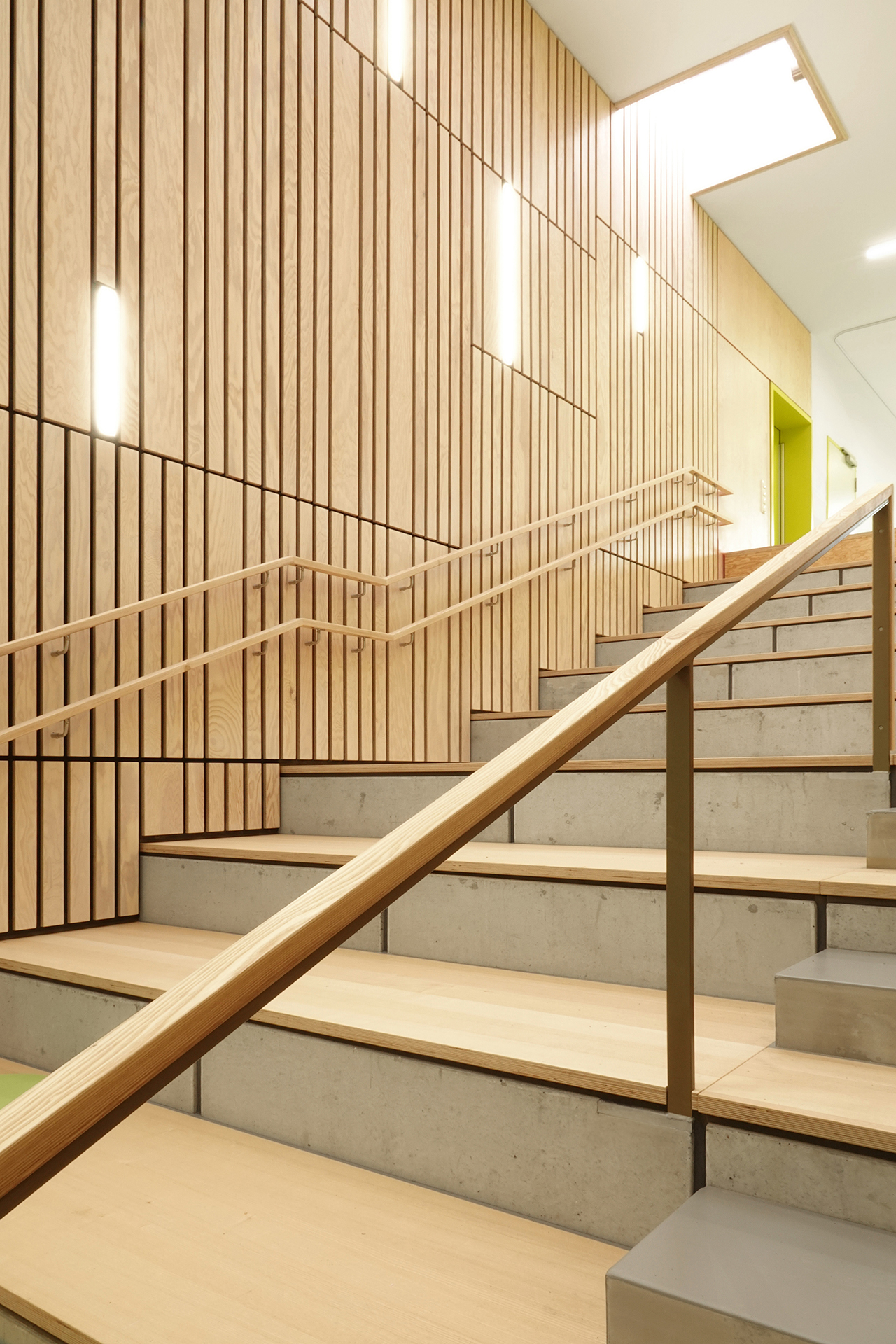 Für die Kinder der Kita Märkolino wird im Neubau zum ersten Mal Gemeinschaft außerhalb der eigenen Familie erlebbar. Die Integration einer kommunikativen, spielerisch nutzbaren Mitte in das Raumprogramm einer Kita, war der entscheidende Ansatz für einen neuen Kita-Typus: Ein Haus ohne Flure. Eine helle Halle mit einer terrassierten offenen Spiellandschaft verbindet alle Geschosse und Funktionsbereiche in der Kita. Das integrative pädagogische Konzept lässt sich dadurch ideal umsetzen. Im Erdgeschoss quert eine Raumachse die Halle und verbindet sie mit dem Außenraum.