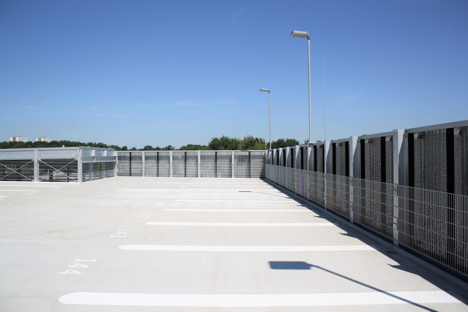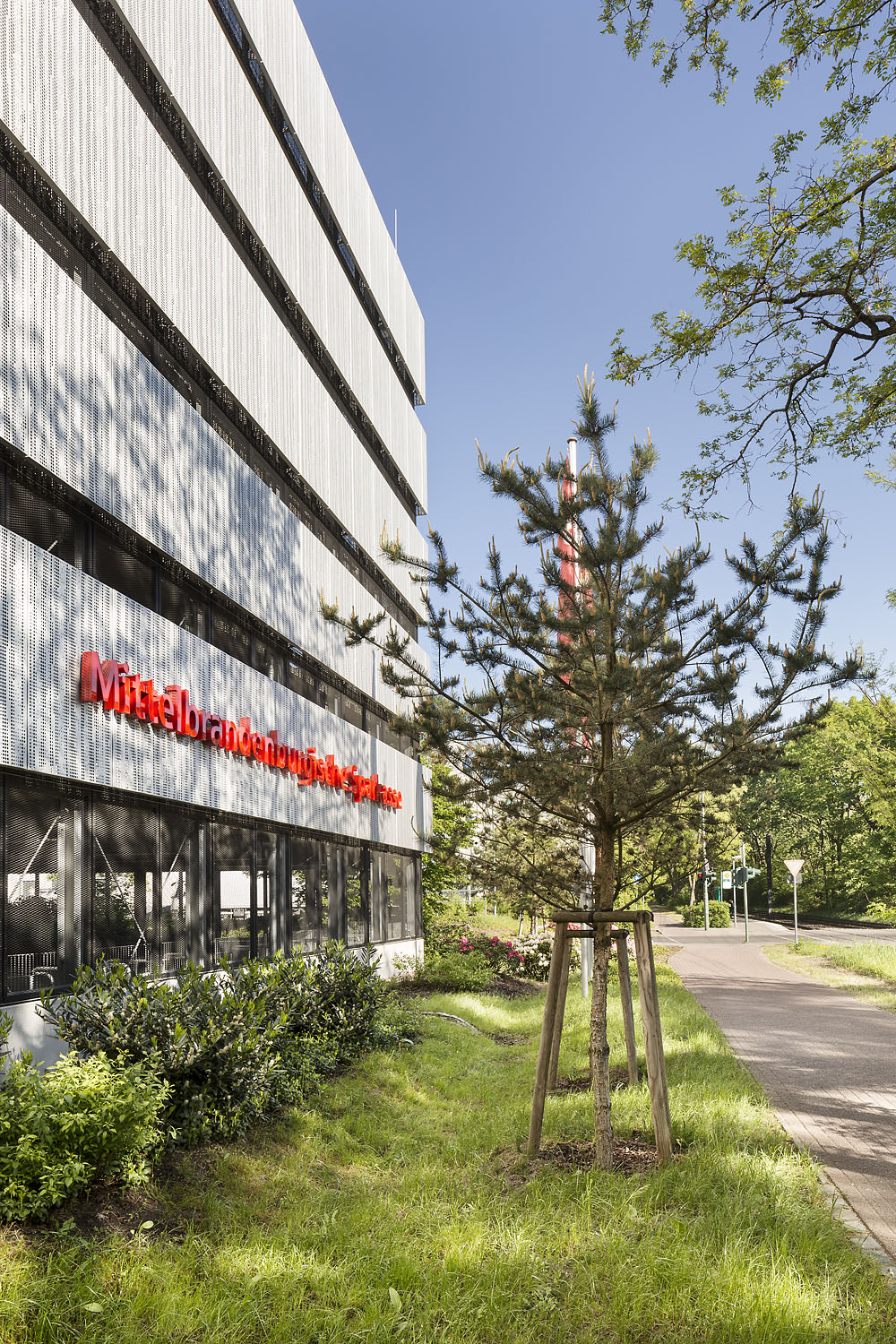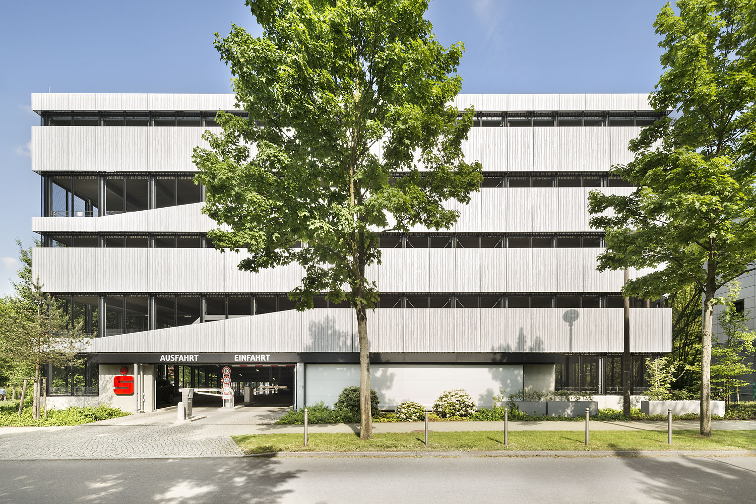 Parkhäuser sind Bestandteil der Verkehrsinfrastruktur im urbanen Stadtraum. In der Gestaltung orientieren sich Parkhäuser am Kontext des Umfeldes oder etablieren ein eigenes, von den Gestaltungsprinzipien der Büro- oder Wohnhäuser unabhängiges Form- und Materialkonzept. Das Parkhaus für Mitarbeiter und Gäste der Mittelbrandenburgischen Sparkasse ist Bestandteil eines Gebäudeensembles an der Hauptverwaltung. Die Bestandsgebäude haben Fassaden aus grauem Naturstein, die Neubauten aus silbernem Aluminium, welche gut miteinander harmonieren. Das Parkhaus fügt sich mit dem Fassadenmaterial Aluminium im Farbton der Neubauten in diesen Kontext ein. Die perforierte silberne Aluminiumfassade wickelt sich spiralförmig in einer freien Interpretation der aufsteigenden Rampen um den Baukörper des Parkhauses und symbolisiert das Funktionsprinzip eines Parkhauses, welches auf der Kombination von Rampen und Stellflächen für Autos und Fahrräder beruht.