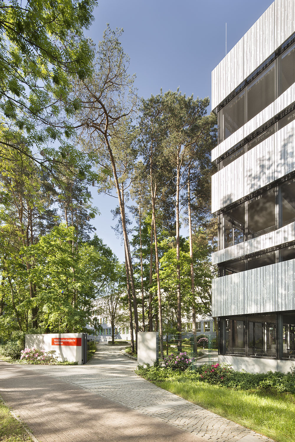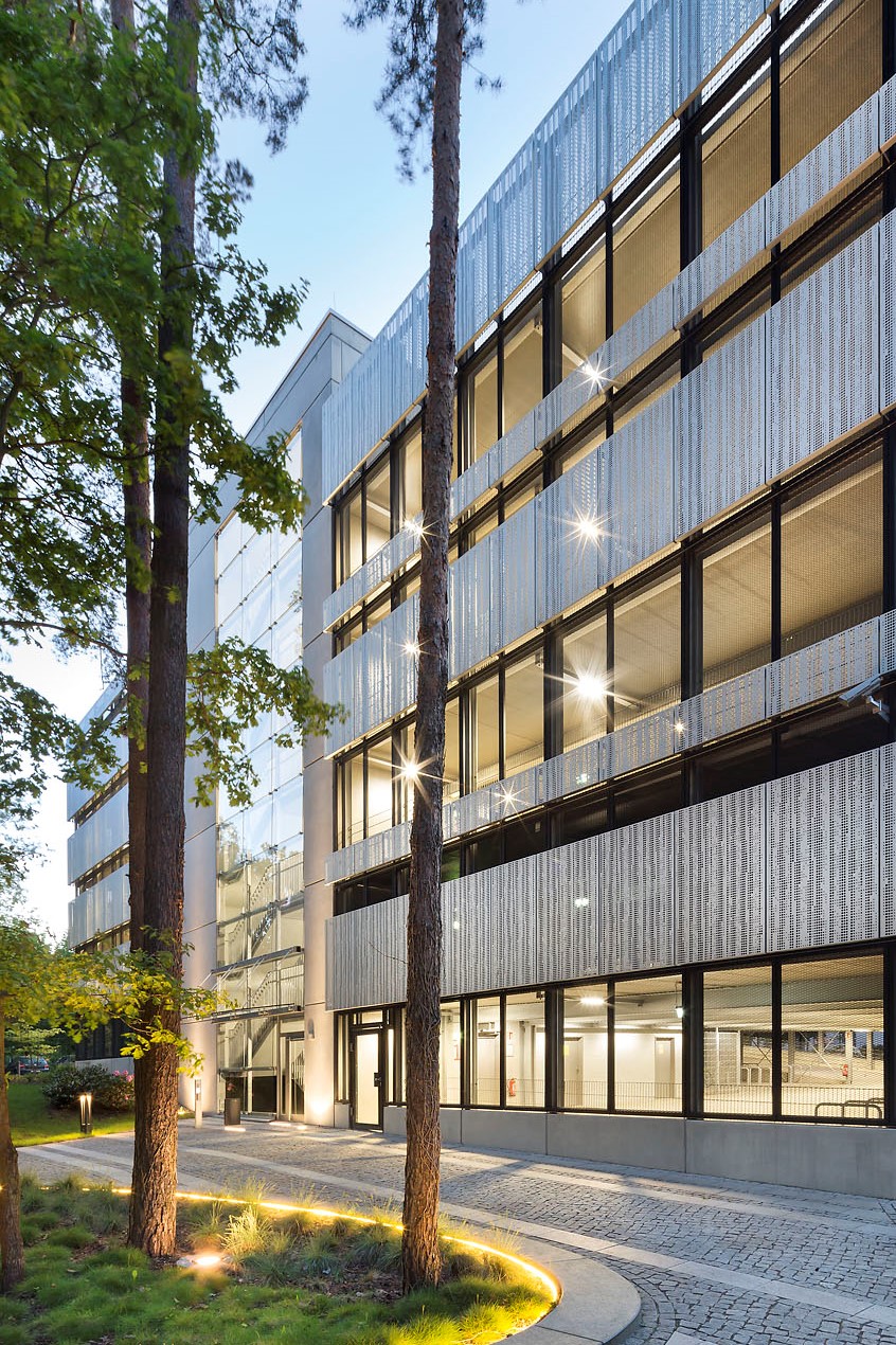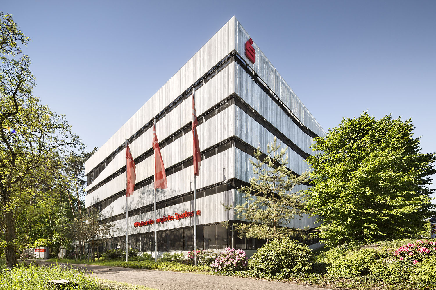 Parkhäuser sind Bestandteil der Verkehrsinfrastruktur im urbanen Stadtraum. In der Gestaltung orientieren sich Parkhäuser am Kontext des Umfeldes oder etablieren ein eigenes, von den Gestaltungsprinzipien der Büro- oder Wohnhäuser unabhängiges Form- und Materialkonzept. Das Parkhaus für Mitarbeiter und Gäste der Mittelbrandenburgischen Sparkasse ist Bestandteil eines Gebäudeensembles an der Hauptverwaltung. Die Bestandsgebäude haben Fassaden aus grauem Naturstein, die Neubauten aus silbernem Aluminium, welche gut miteinander harmonieren. Das Parkhaus fügt sich mit dem Fassadenmaterial Aluminium im Farbton der Neubauten in diesen Kontext ein. Die perforierte silberne Aluminiumfassade wickelt sich spiralförmig in einer freien Interpretation der aufsteigenden Rampen um den Baukörper des Parkhauses und symbolisiert das Funktionsprinzip eines Parkhauses, welches auf der Kombination von Rampen und Stellflächen für Autos und Fahrräder beruht.