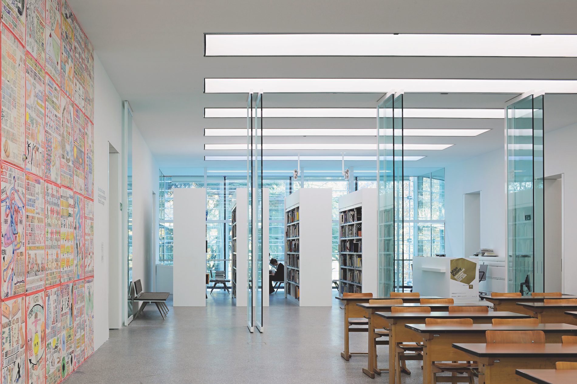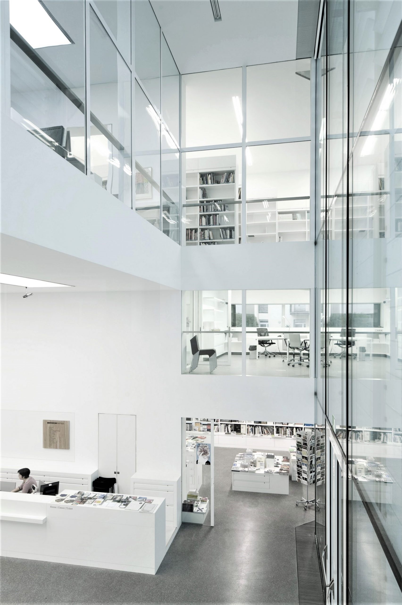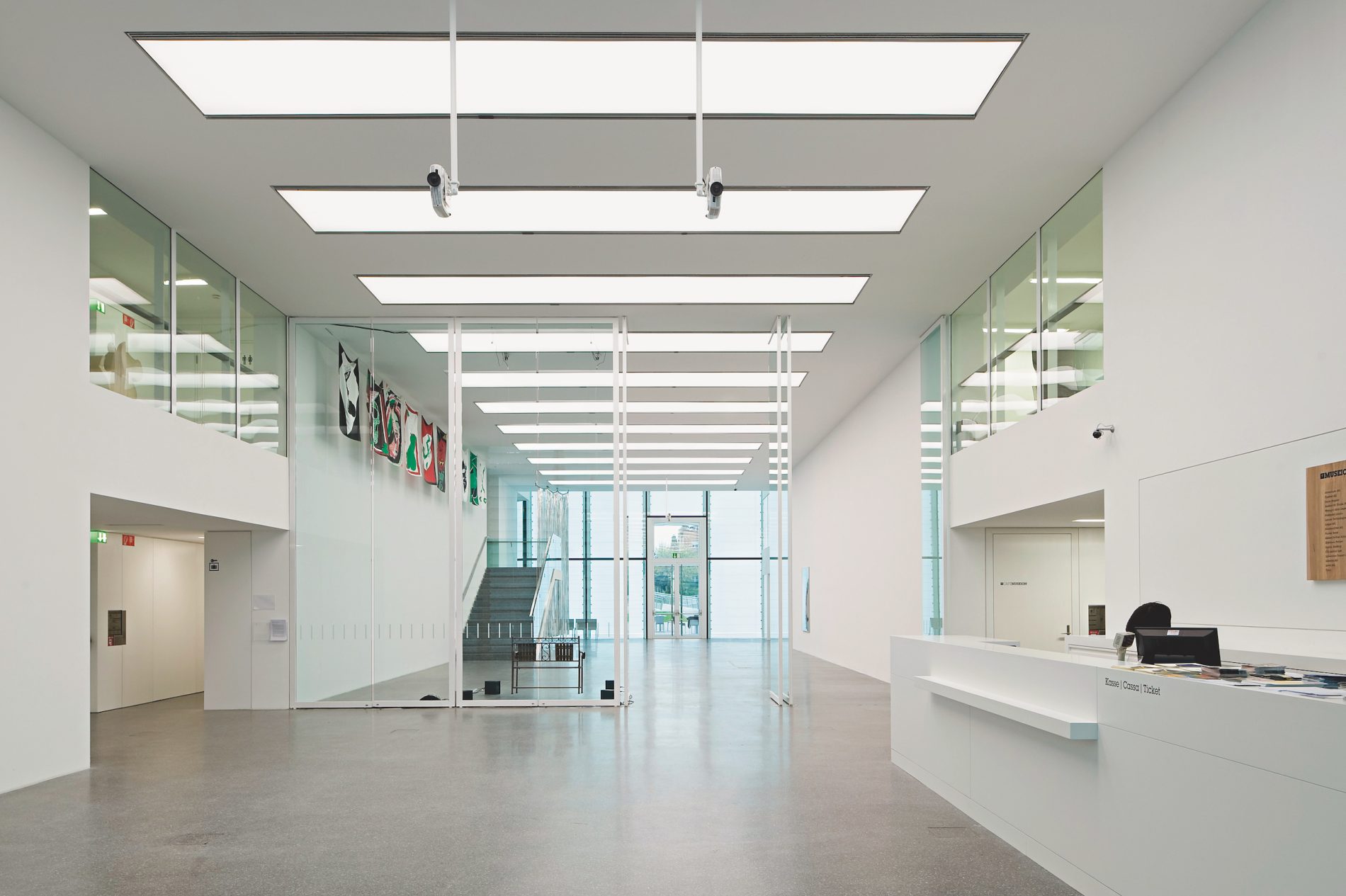 Über die Gestaltung und Modellierung des Lichts gewinnen die Innenräume ihren Charakter und ihre Eigenheiten. Deshalb ist das Innere des Gebäudes mit seinen Wänden und Einbauten sowie Möbeln weiß. Weiß, weil es dem Licht am nächsten kommt, den Raum weitet, Objekte und Menschen zu Akteuren macht. Nur die unmittelbar zu berührenden Dinge wie Geländer, Türgriffe, Möbel behalten ihre konkrete Materialität. Die Möbel sind Teil der Architektur, klar, einfach, neutral und flexibel in jedem Bereich einsetzbar. Die markante Struktur der Lichtfelder an der Decke folgt der dreischiffigen Struktur des Hauses und lässt das Museum aus sich heraus leuchten. Der Terrazzoboden verändert seine Farbe beginnend von schwarz im Veranstaltungsbereich im Untergeschoss über grau zu weiß in der oberen Tageslichtebene.