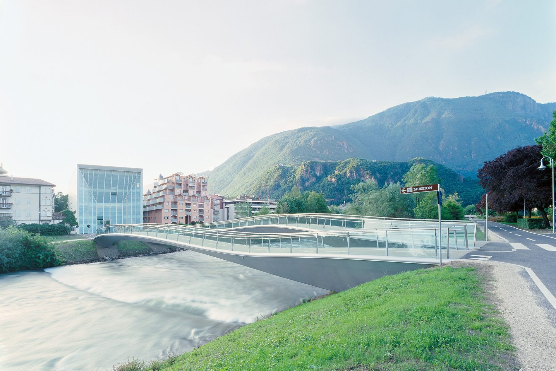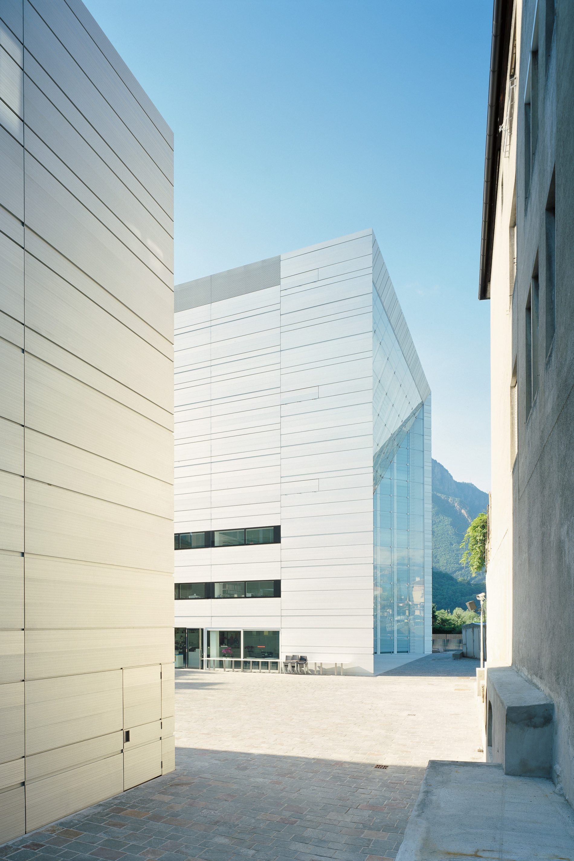 Die weißen Wände und die großen Lichtdecken bilden das räumliche Kontinuum des Museion Museum für moderne und zeitgenössische Kunst in Bozen. Bewegliche Elemente ermöglichen Verwandlungen räumlicher und atmosphärischer Art: im Untergeschoss durch Wandelemente, die aus dem neutralen Ausstellungsraum einen Veranstaltungsort werden lassen. Die Seiten der Wandelemente haben unterschiedliche Oberflächen aus Filz und Schultafelfarbe. Je nachdem, welche Seite zum Innenraum orientiert ist verändert sich die Akustik und die Optik. Im Foyer und im Bibliotheksgeschoss ermöglichen raumhohe Glaselemente die Verbindung oder Trennung von Raumbereichen. So kann zum Beispiel der Ausstellungsbereich mit der Bibliothek verbunden werden. Wenn am Wochenende das Museum geöffnet, aber die Bibliothek geschlossen ist, lassen sich über bewegliche Elemente die Bücherregale der Ausleihe verschließen.