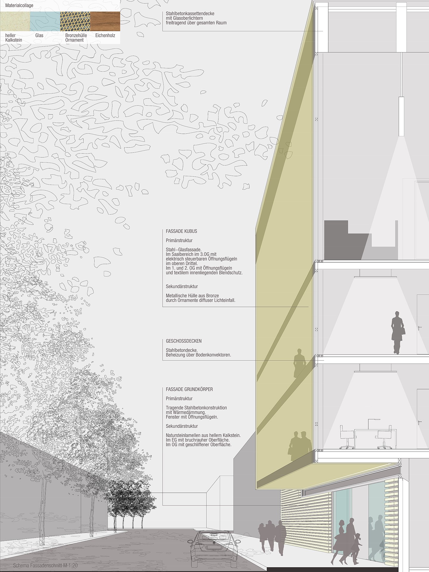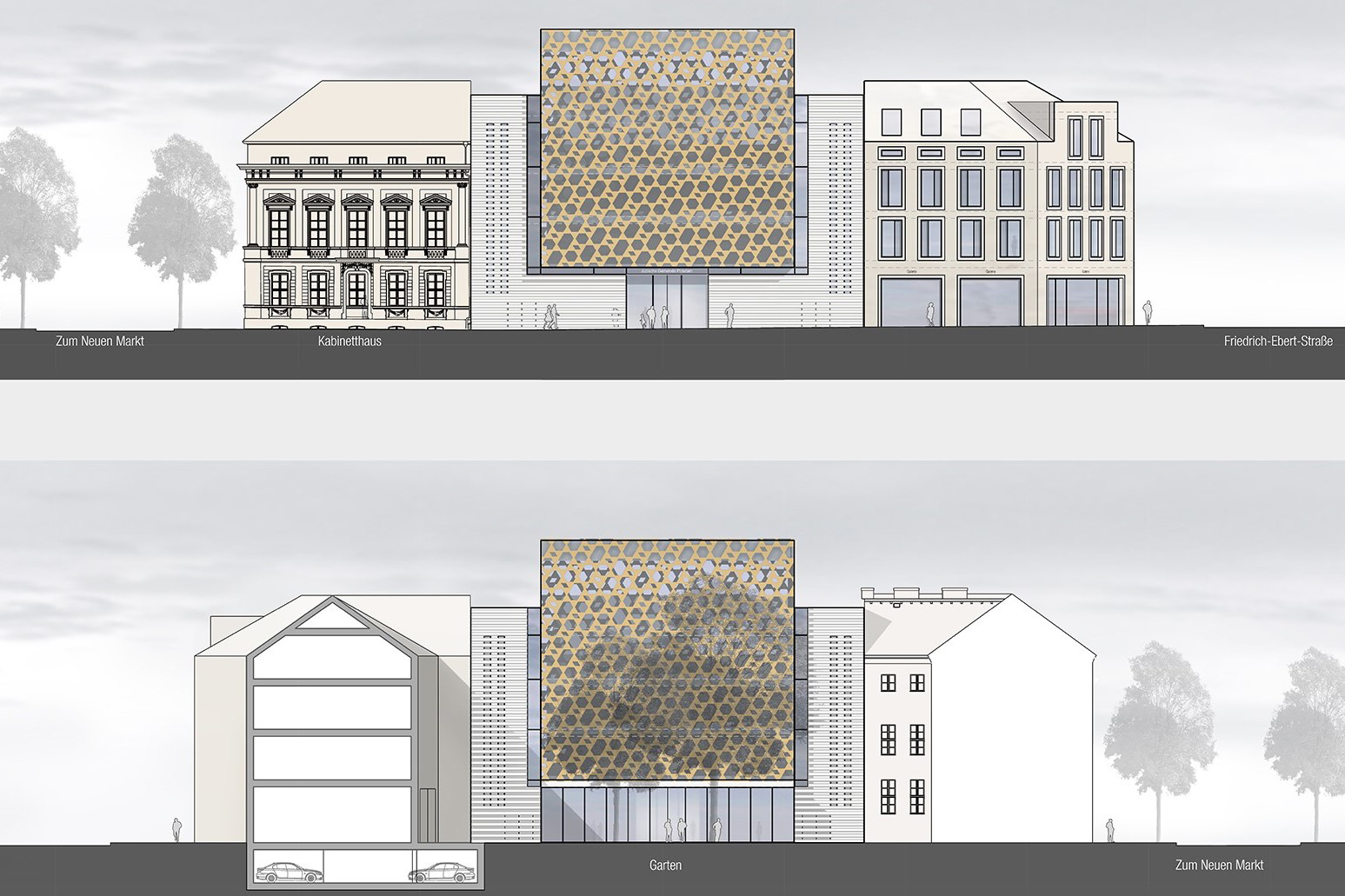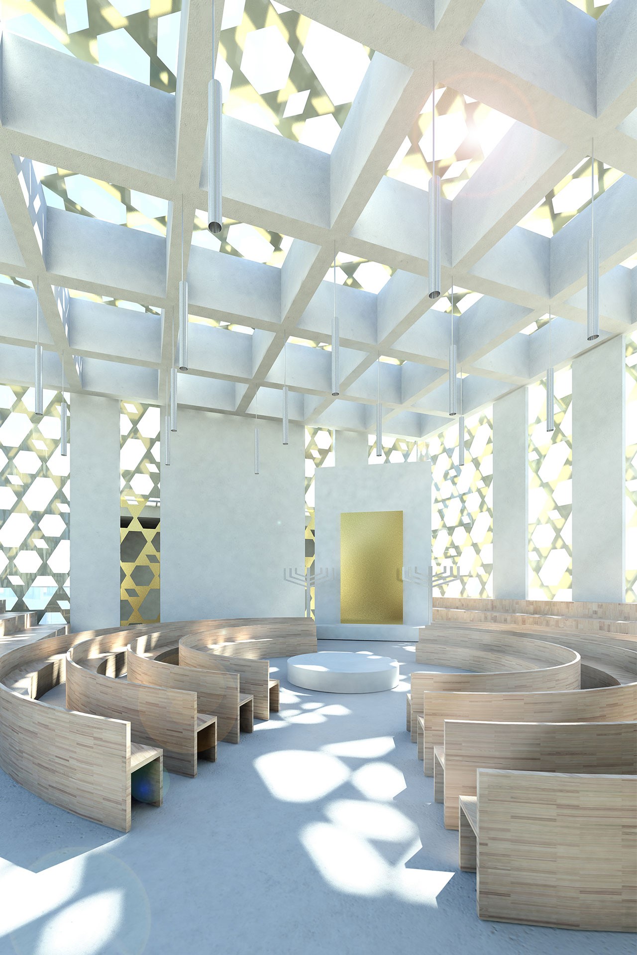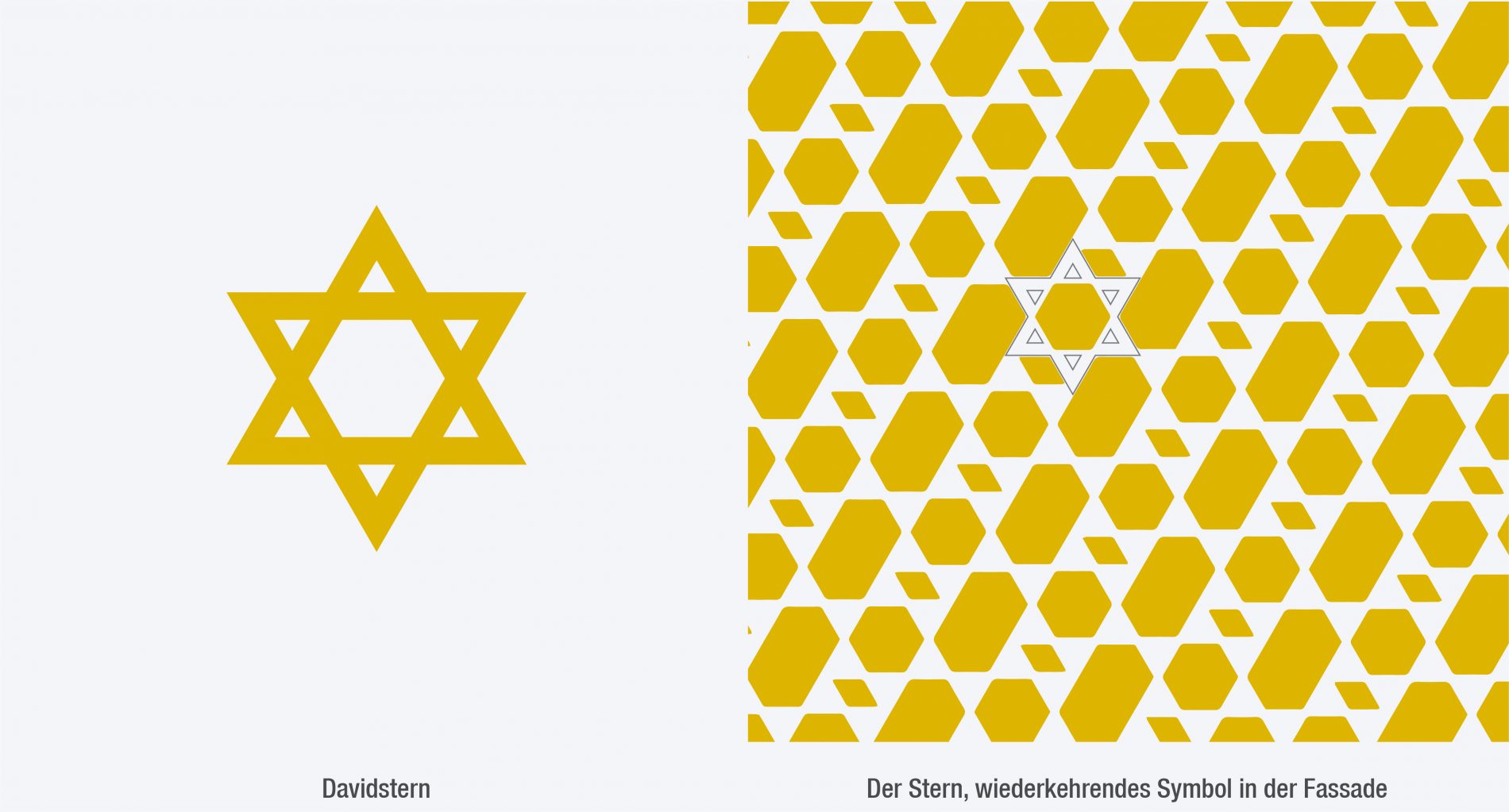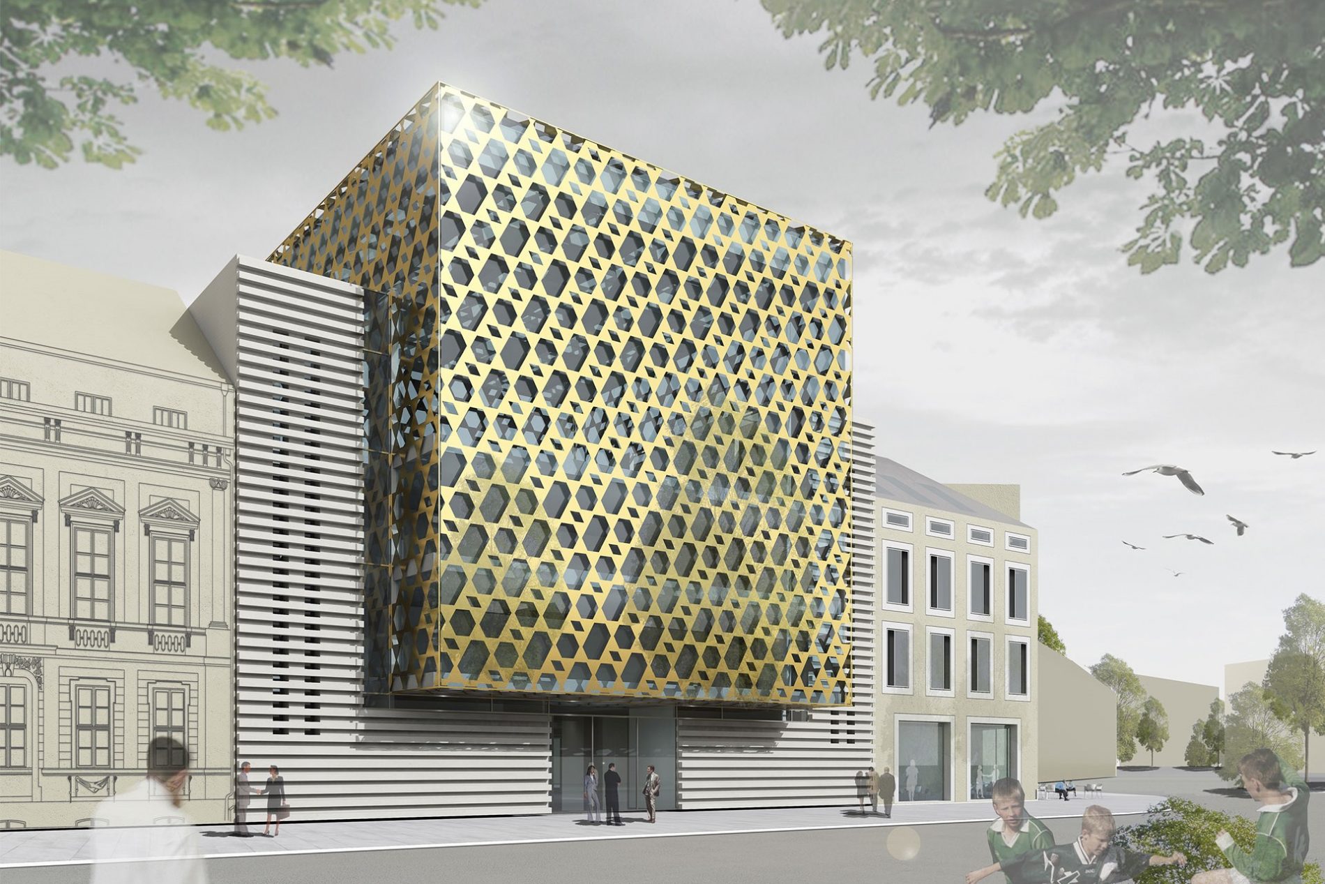 Der Standort für die neue Synagoge in Potsdam liegt innerhalb eines Blocks auf einem engen Grundstück in der historischen Altstadt. Der Entwurf wertet den städtebaulich unprätentiösen Ort auf, indem er die Synagoge wie einen Diamanten im Collier mit dem städtischen Block fasst. Die Synagoge tritt gegenüber der Bauflucht mit einem verglasten Gebetssaal hervor, den eine zweite Fassade aus goldglänzenden Aluminiumpaneelen einhüllt, welche den Innenraum vor direkter Einsichtnahme schützt und zugleich durch das flirrende Lichtspiel belebt. Die Aluminiumstruktur wird durch ein Pattern gebildet, welches aus dem Davidstern abgeleitet ist. Dadurch wird die Fassade zum subtilen Träger des Religionssymbols.