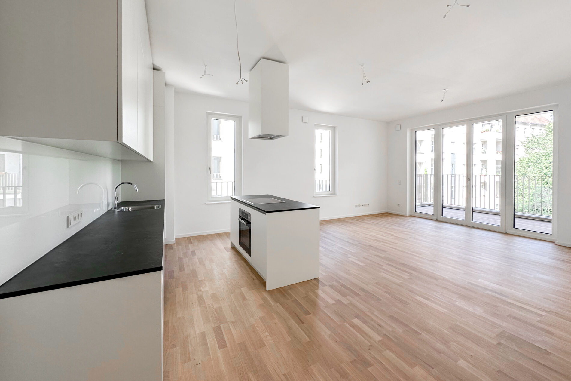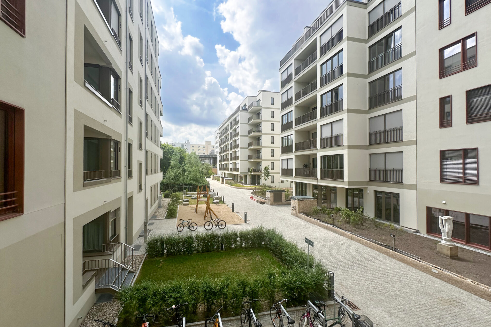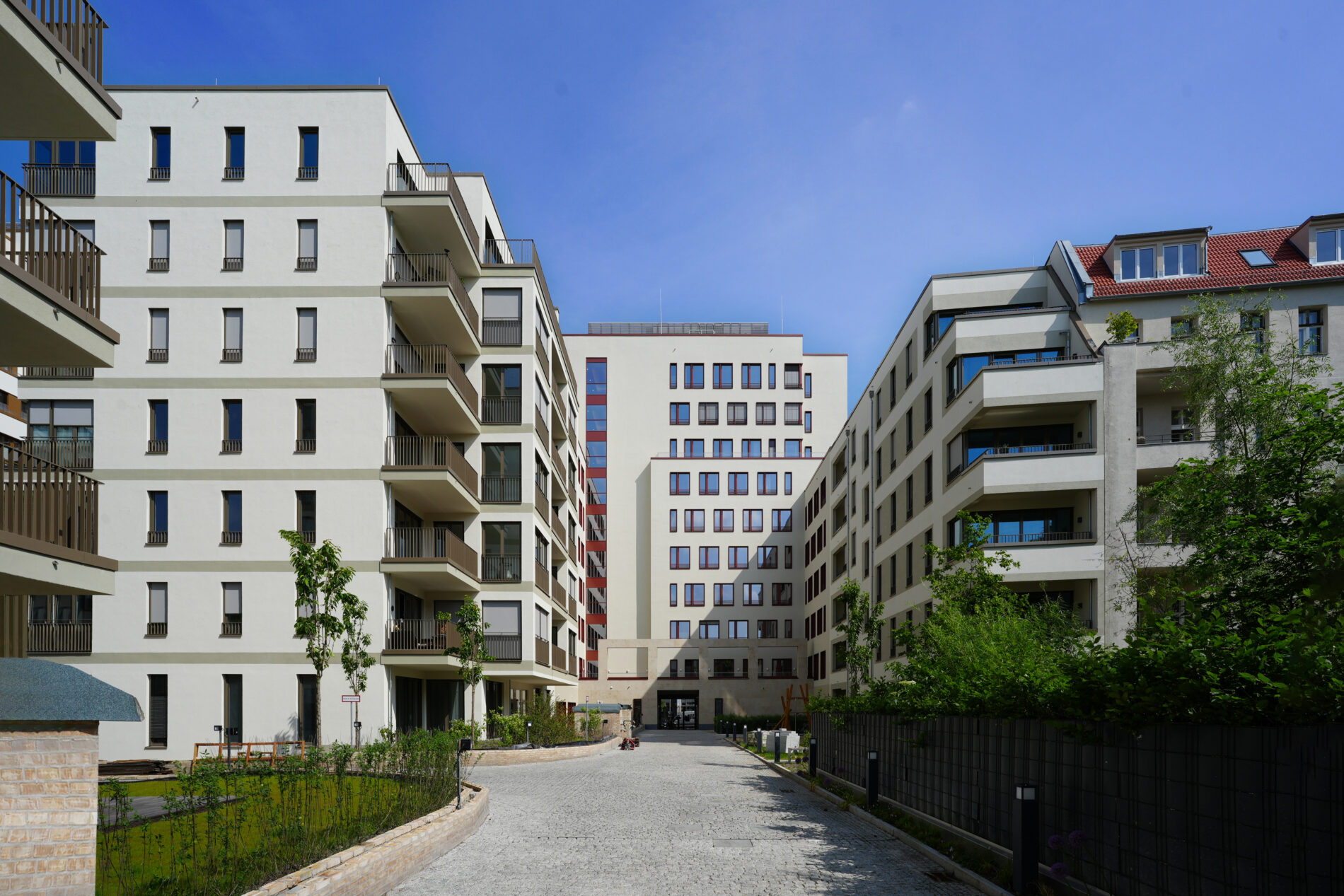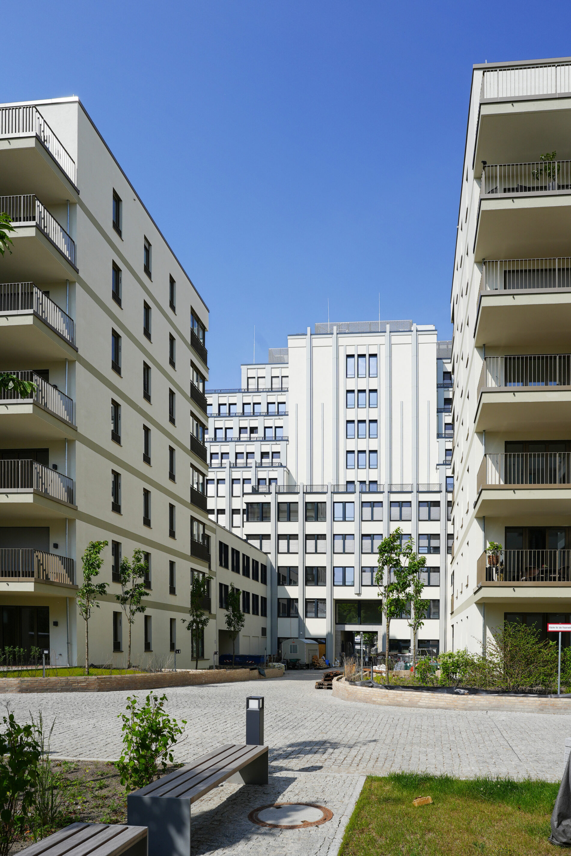 Der Entwurf knüpft an die Bebauungsstruktur der Gründerzeit an und verbindet die angrenzenden Gebäude mit den Neubauten zu einem hochwertigen Stadtraum mit vielen Angeboten. Der Mittelpunkt des Quartiers ist die neue Hauptverwaltung der Berliner Volksbank. Die Büroflächen entsprechen neuesten Standards und schaffen eine lebendige und innovative Arbeitswelt mit flexiblen Ausbauoptionen. Die Wohnungen sind zu den ruhigen Innenhöfen und der Parkanlage in der Mitte des großen Quartiers orientiert. In den Erdgeschossen der Häuser sind gewerbliche Flächen für die Nahversorgung des Quartiers untergebracht.