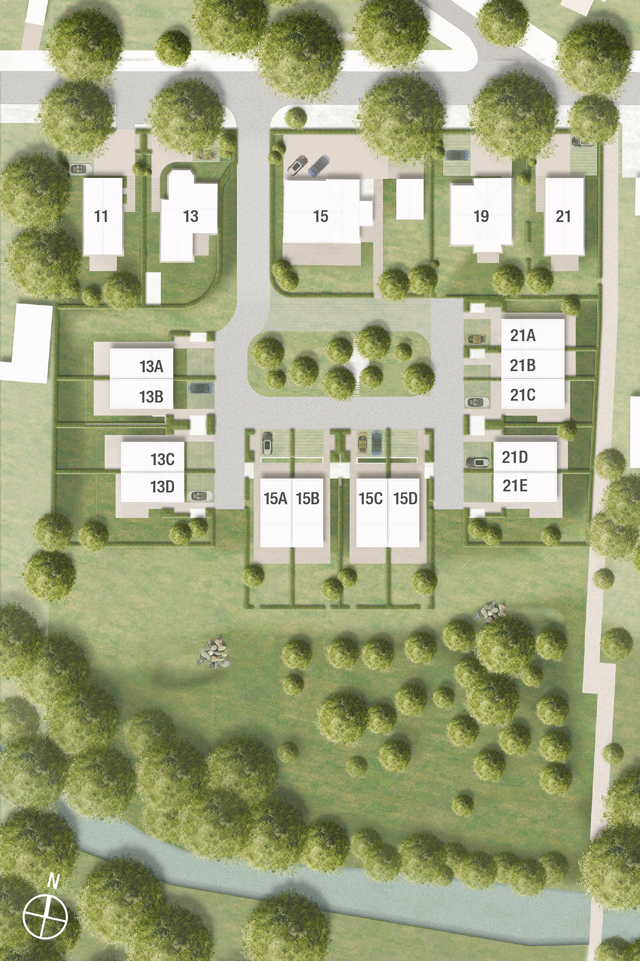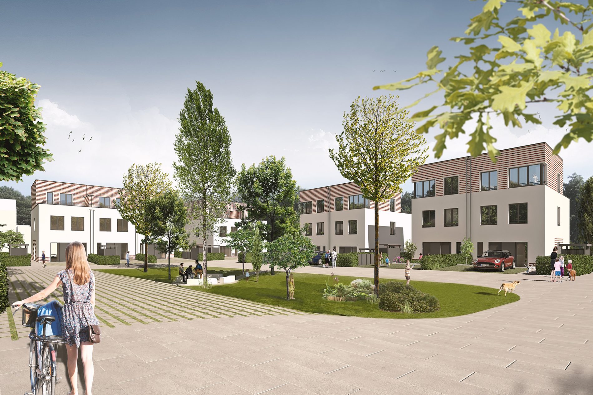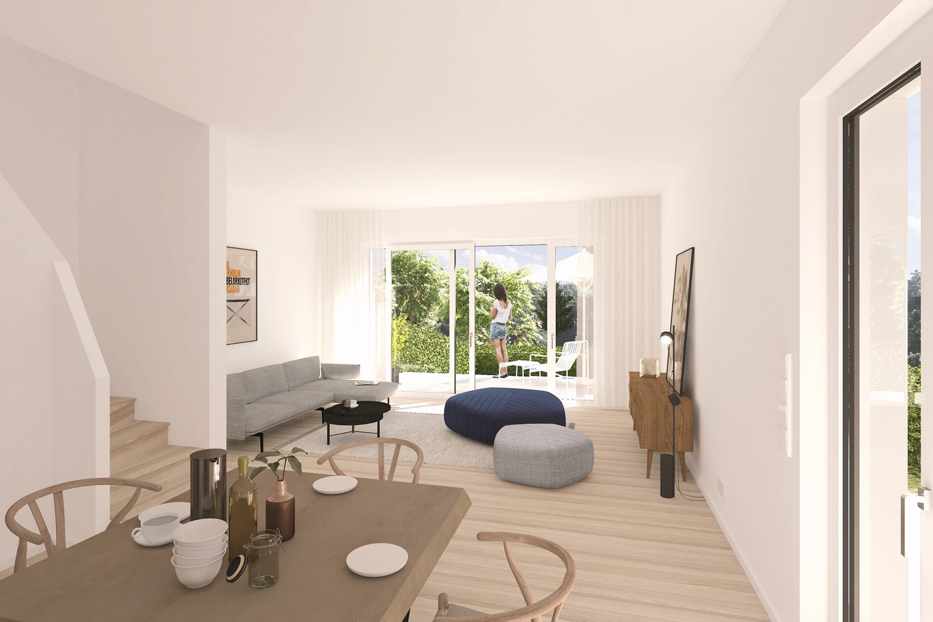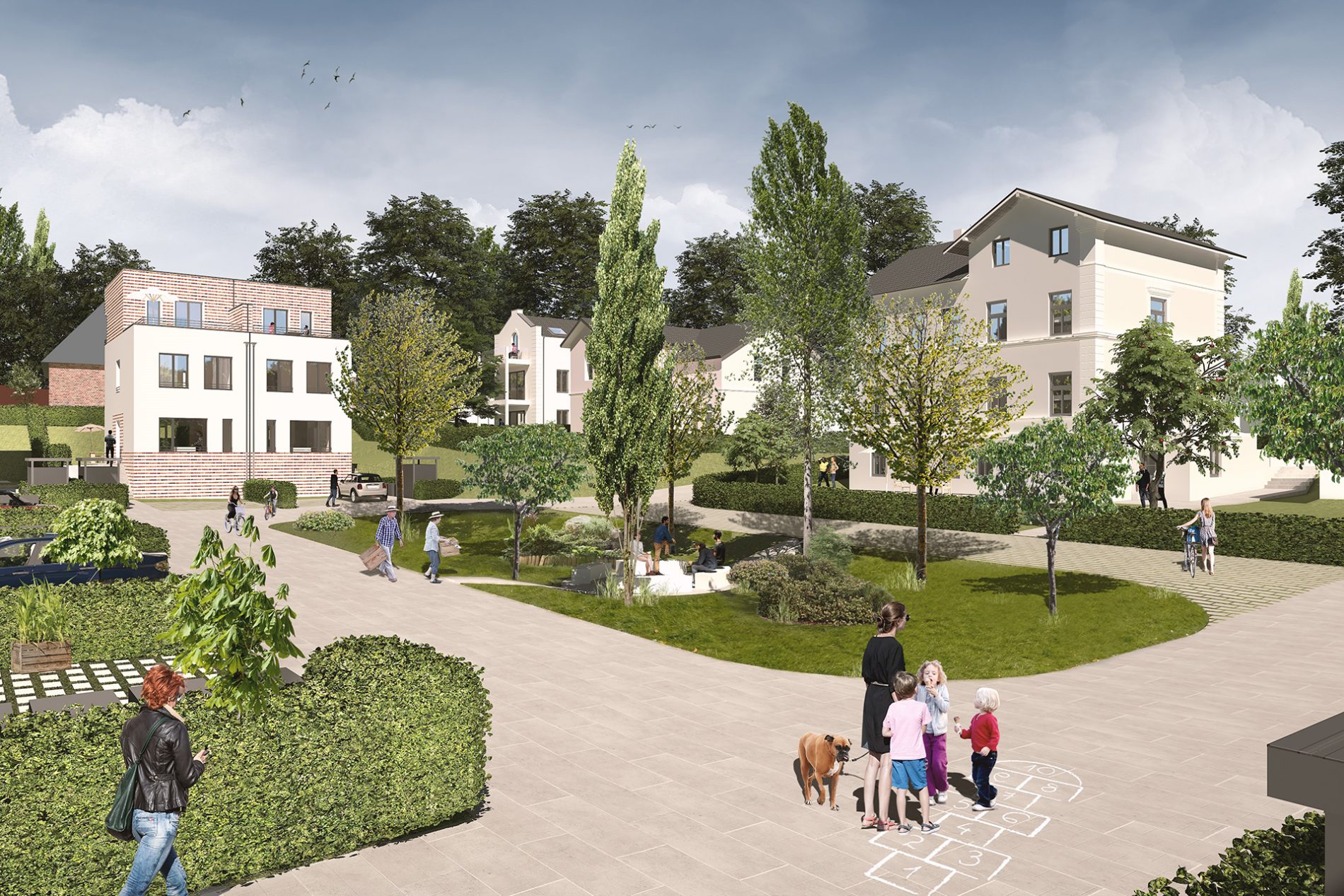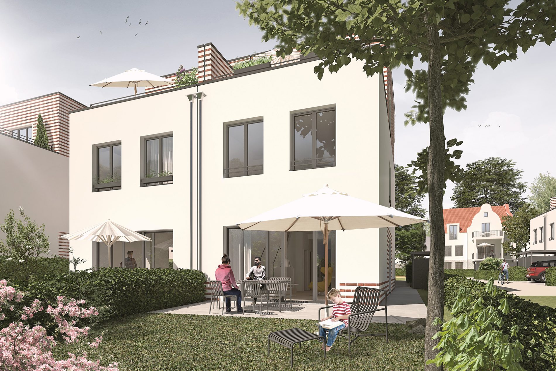 Der »Grüne Platz« bildet die Mitte der Salinengärten. Er ist kommunikativer Treffpunkt der Bewohner im Quartier. Die Neubauten der Gartenhäuser auf eigenen Parzellen am Platz bieten ein modernes Wohnambiente. Im Erdgeschoss empfängt ein Loft mit Wohnen, Kochen und Essplatz den Besucher. Die Gartenterrasse mit dem Blick in den Landschaftsraum der Beste verbindet Haus und Garten. Die Grundrisse der Gartenhäuser können unterschiedliche Familien- und Nutzungsszenarien abbilden.