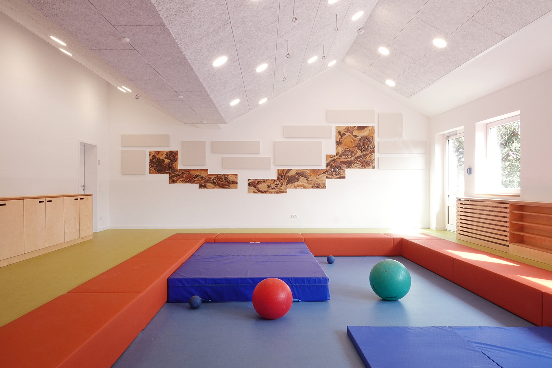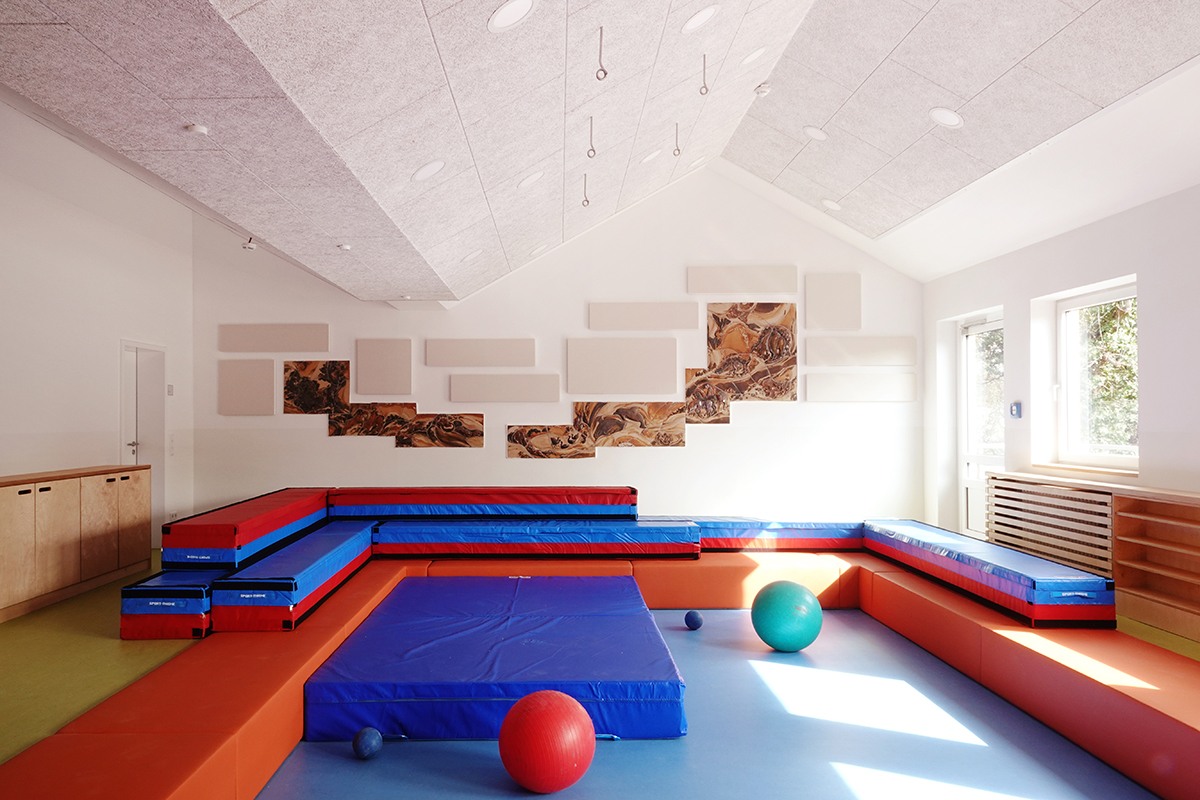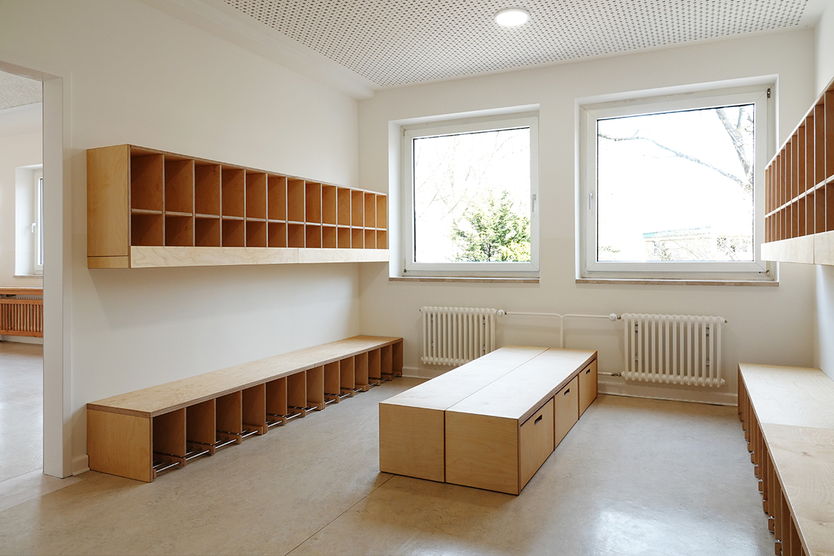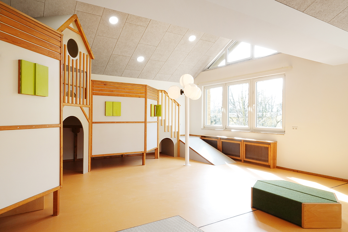 Im Zuge der Umbau- und Sanierungsmaßnahmen wurden alle Sanitärbereiche erneuert. Gruppenräume und Flure erhielten Akustikdecken. Mit zwei neuen Stahl-Außentreppen wurden zusätzliche Wege vom Obergeschoss in den Garten geschaffen. Die in zwei Funktionsräumen vorhandenen detailreich gestalteten Spiellandschaften wurden ebenfalls aufgearbeitet.