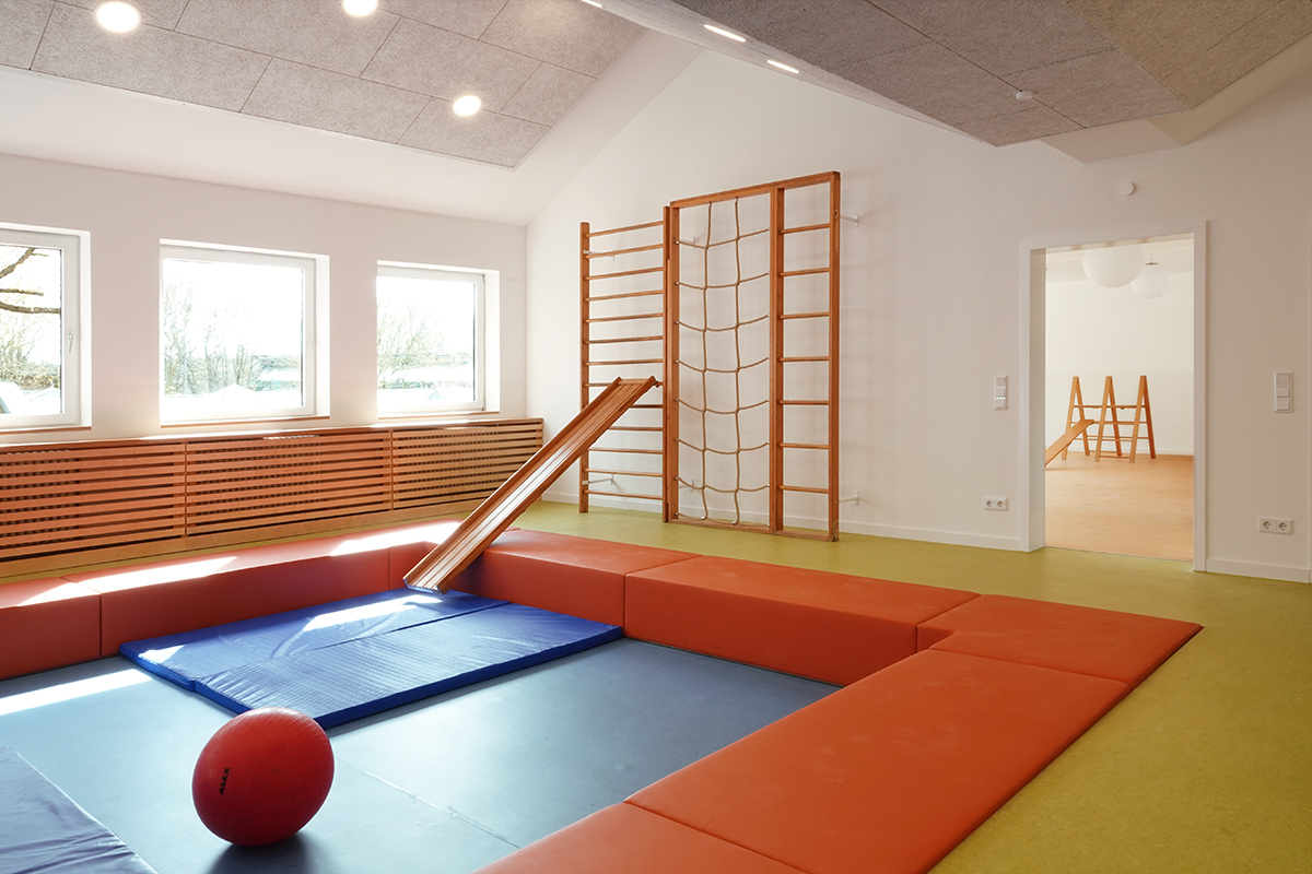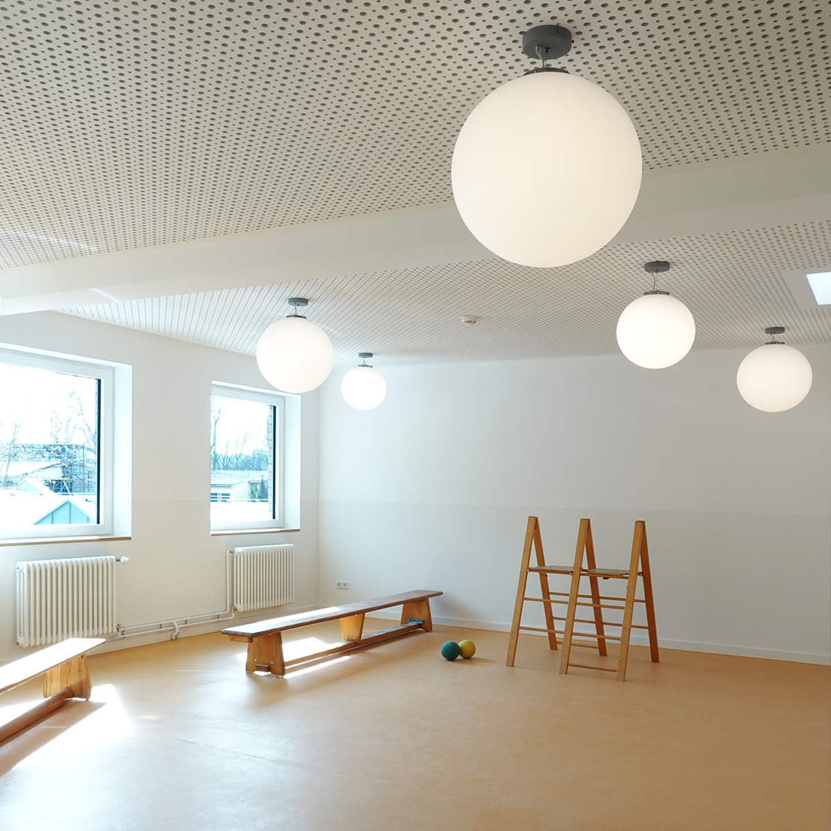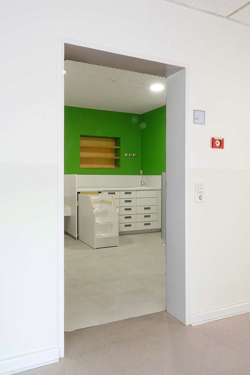 Im Zuge der Umbau- und Sanierungsmaßnahmen wurden alle Sanitärbereiche erneuert. Gruppenräume und Flure erhielten Akustikdecken. Mit zwei neuen Stahl-Außentreppen wurden zusätzliche Wege vom Obergeschoss in den Garten geschaffen. Die in zwei Funktionsräumen vorhandenen detailreich gestalteten Spiellandschaften wurden ebenfalls aufgearbeitet.