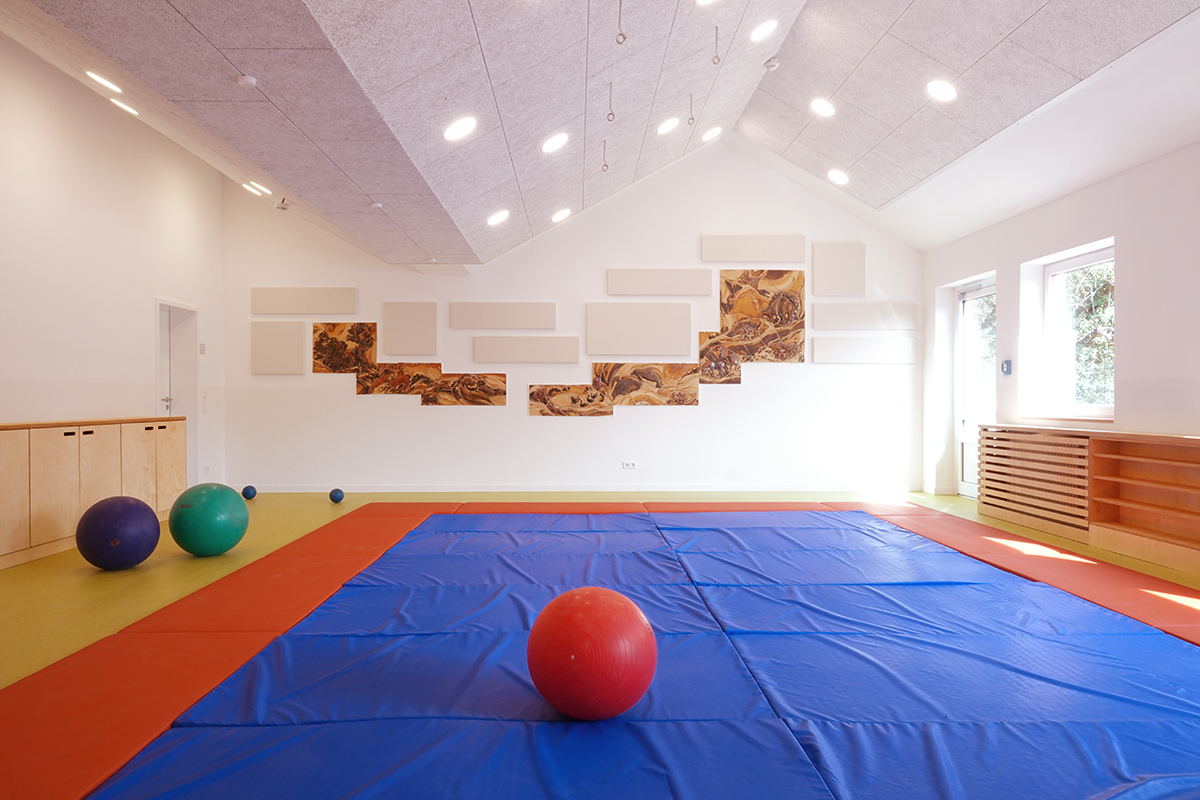 Das ehemalige Schwimmbecken wurde durch eine neueingezogene Decke zu einem 50cm tiefen „Mattenbecken“ transformiert. Aus verschieden großen und dicken Turnmatten kann hier eine ebene Fläche als Sport- und Bewegungsfläche geschaffen werden. Das große Keramikrelief des Schwimmbads wurde in die Gestaltung des neuen Bewegungsraums integriert. Ebenso wurde im Innern die typische Satteldachform beibehalten ergänzt durch eine neue Akustikdecke.
