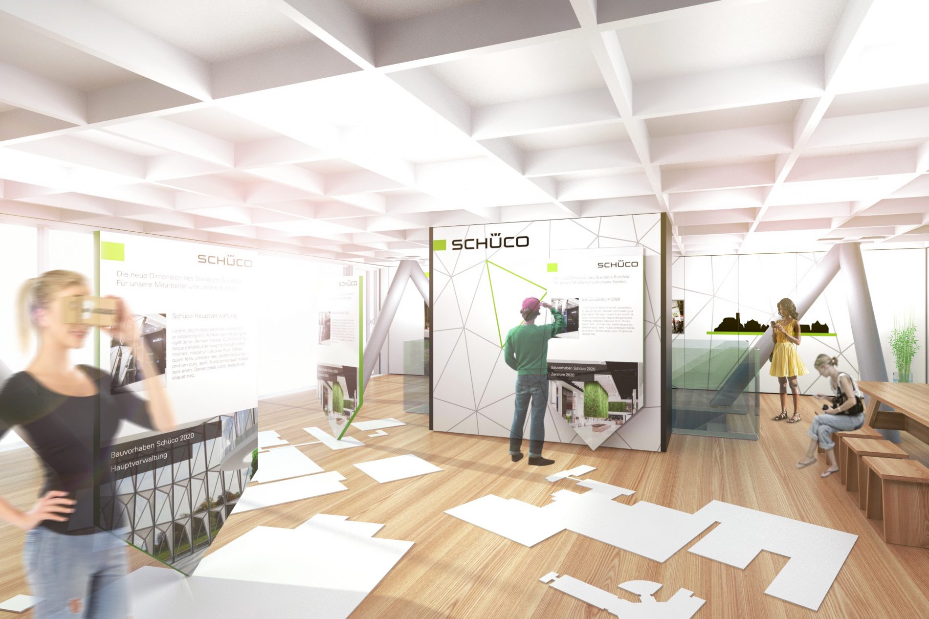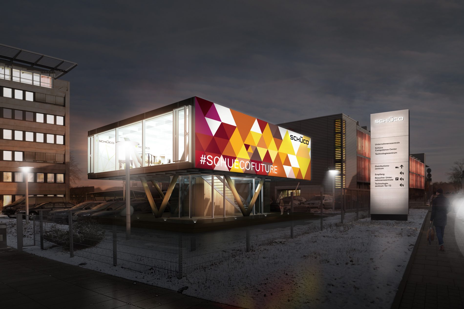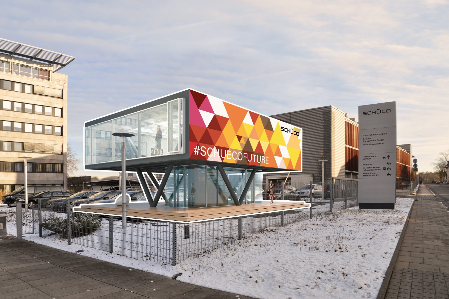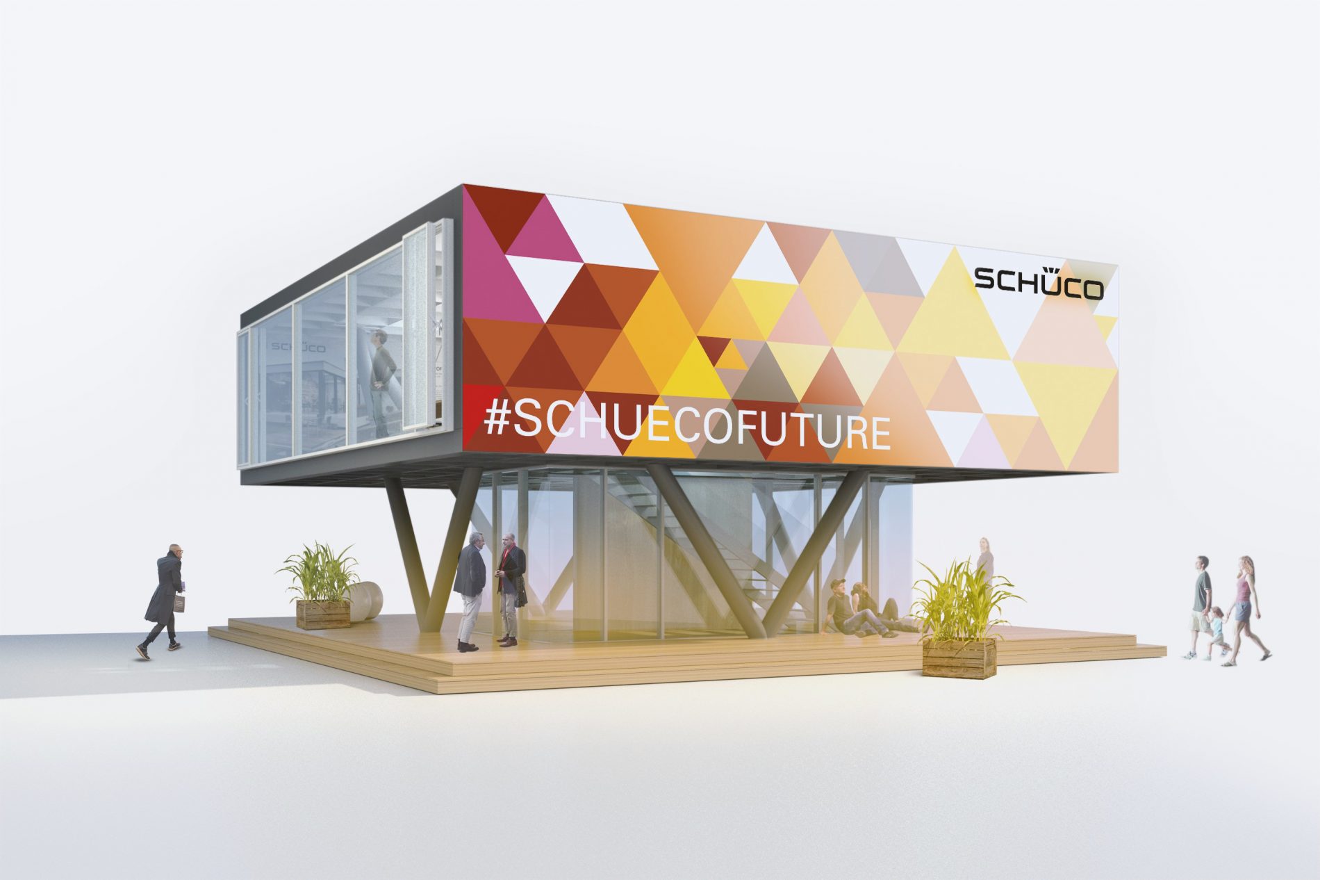 Schüco wird den Standort der Hauptverwaltung in Bielefeld in den nächsten Jahren deutlich ausbauen und mehrere Neubauvorhaben umsetzen. Die Bereiche Forschung und Entwicklung, Verwaltung und Logistik sowie die zur Haupterschließung gerichteten öffentlichen Bereiche des Unternehmens werden deutlich aufgewertet. Das Unternehmen bekennt sich damit zum Standort Bielefeld und Deutschland. Die Kommunikation der Investitionsmaßnahmen am Hauptquartier in Bielefeld bis 2020 an Mitarbeiter und Gäste ist das Ziel des Pavillons. Zugleich werden die Kernkompetenzen der Marke öffentlichkeitswirksam kommuniziert.
