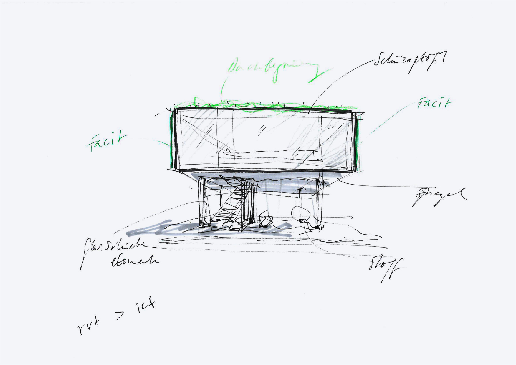 Die Betonung der konstruktiven Struktur verweist auf die technisch konstruktive Kompetenz von Schüco. Der Begriff Levitation bezeichnet im englischen den Zustand des freien Schwebens, der Kontemplation, der Selbstreflexion, der im Konzept durch die Pilotis ermöglicht wird.