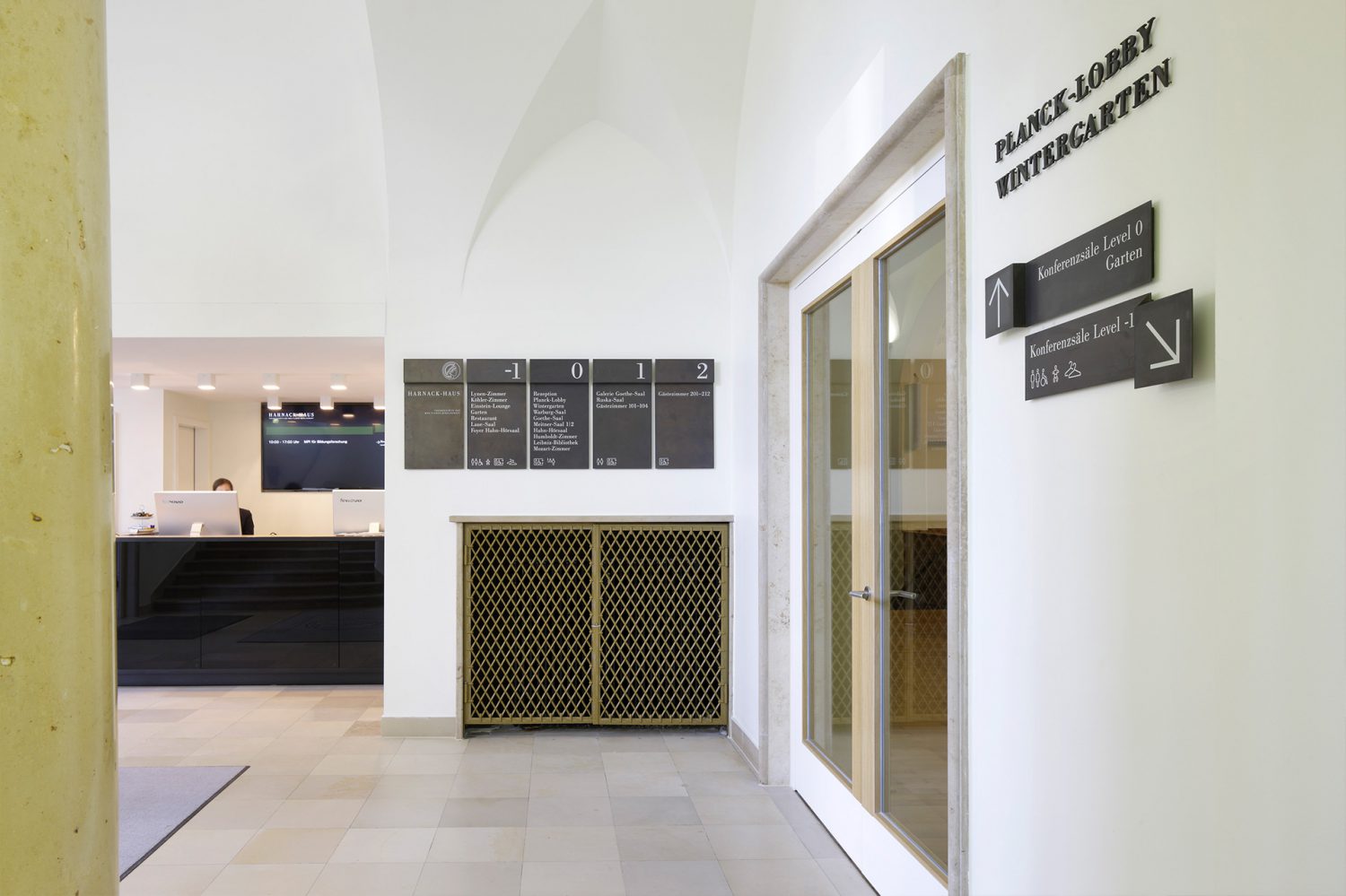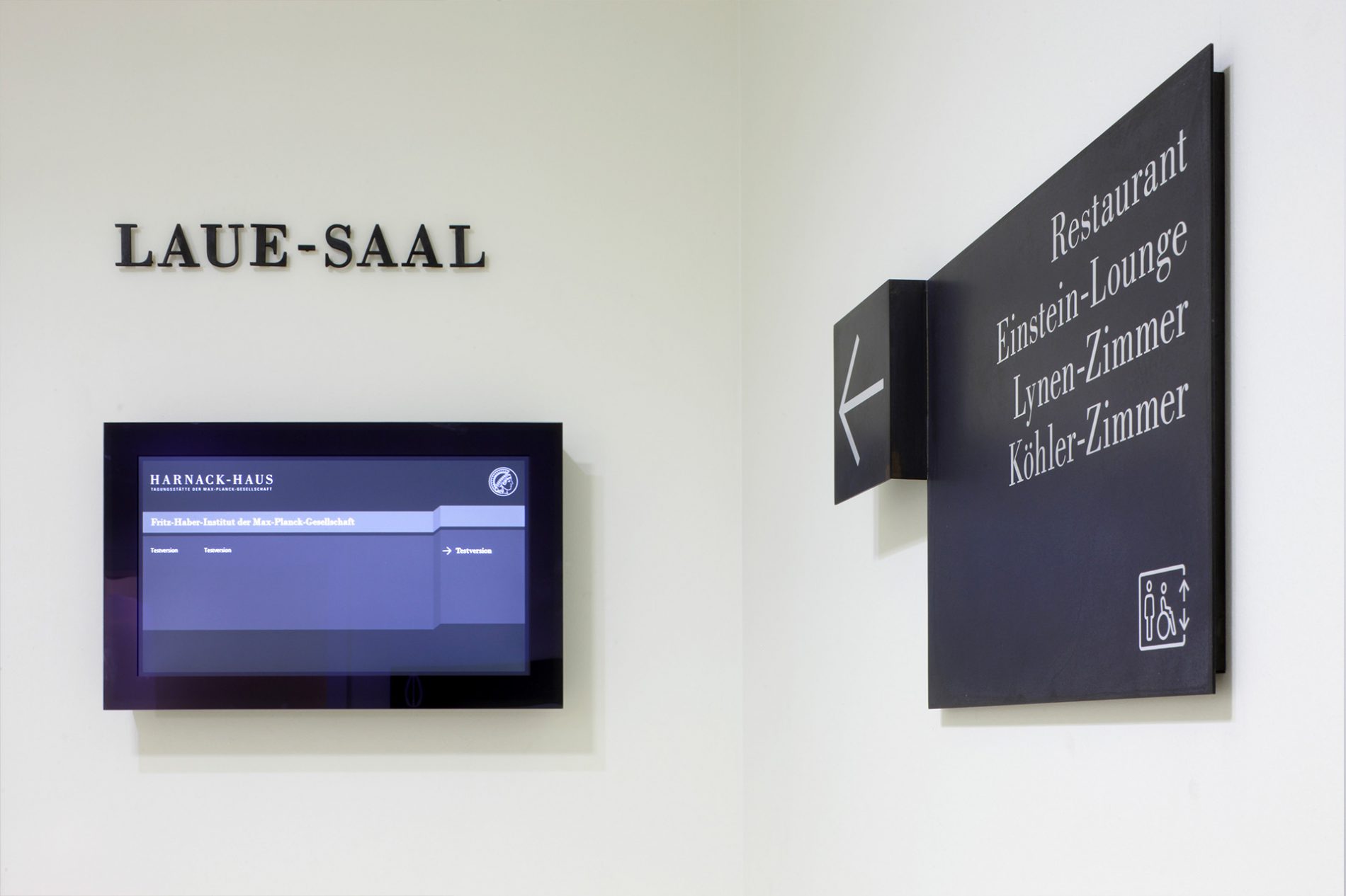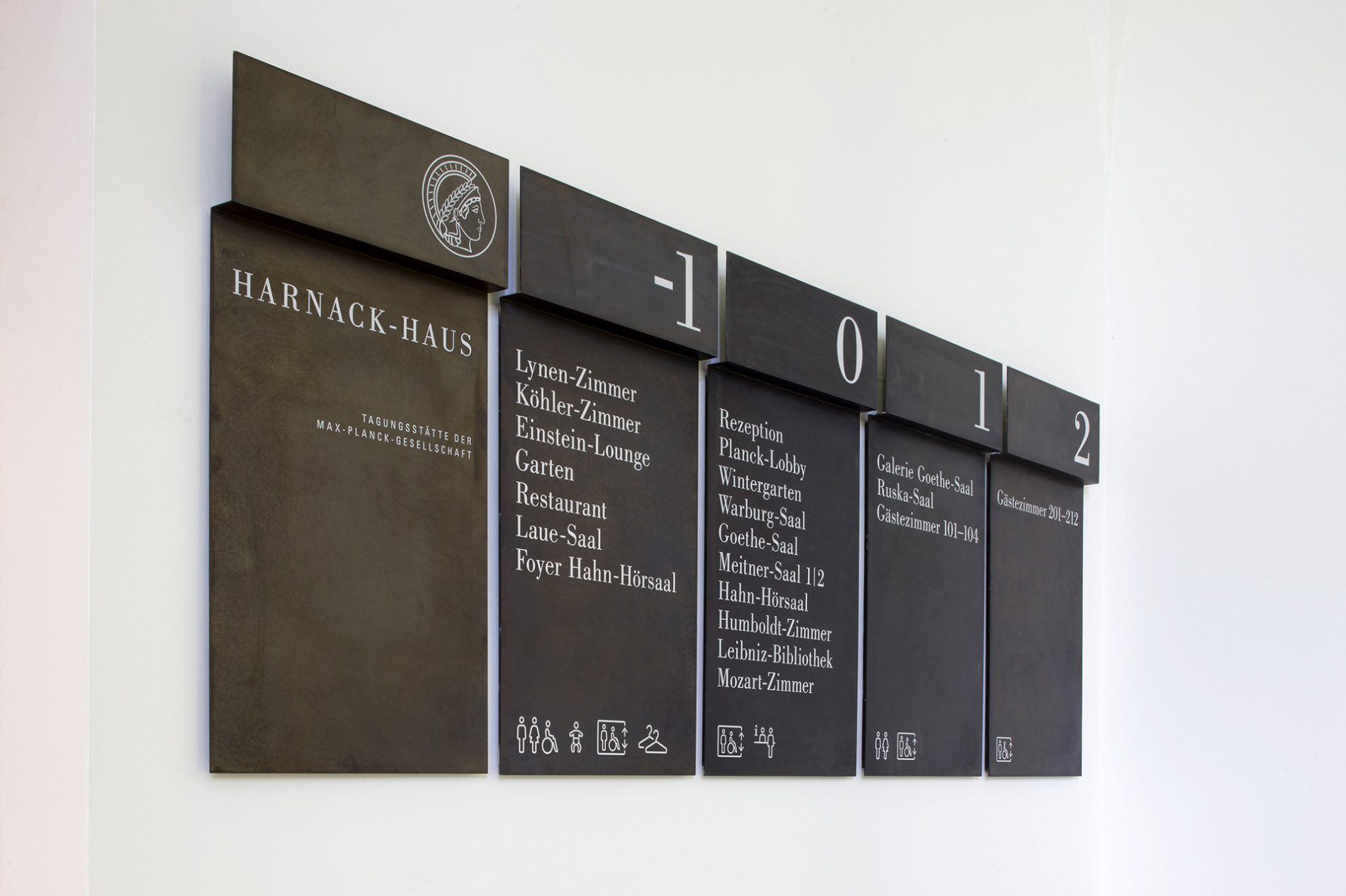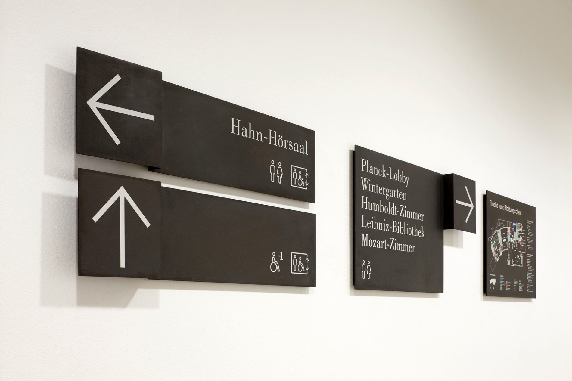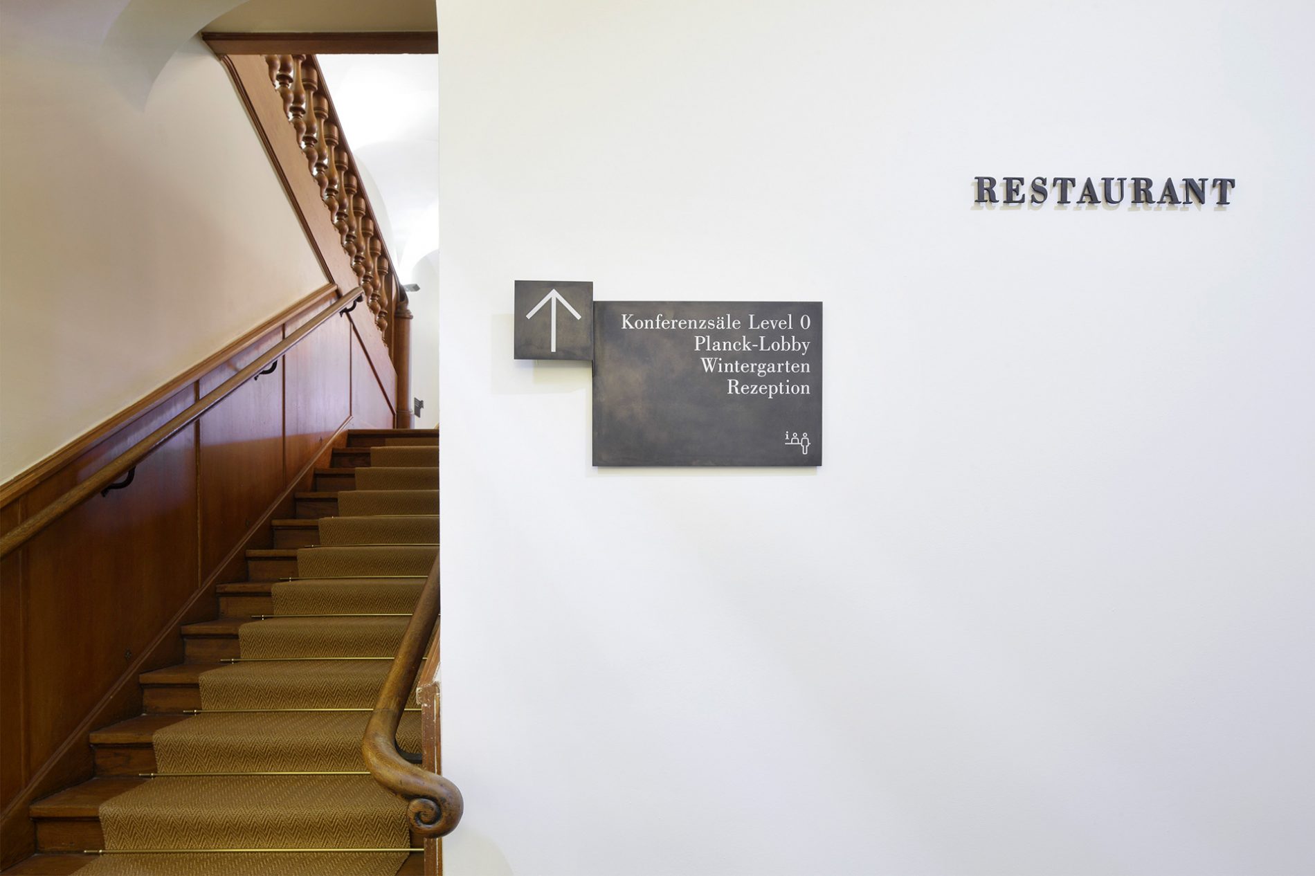 Die Signaletik nimmt die Schwingungen des Gebäudes auf und entwickelt im Kontext vorhandener, identitätsgebender Materialien ein analoges und digitales Leit-, Orientierungs- und Informationssystem. Die Leitsystematik organisiert eine komplizierte Raum-in-Raum-Wegeführung mit wechselnden Belegungen. Die Leitinformationen der analogen Signaletik sind auf gefalteten Bronzeträgern mit Informationen in Siebdruck abgebildet. Ziffern zur Kennzeichnung der Geschosse sowie Piktogramme wurden aus Bronzeflachmaterial gelasert. Die Bronze wurde brüniert und roh belassen. Die Flucht- und Rettungspläne wurden als Siebdruck auf brünierter Bronze ausgeführt. Um sowohl feststehende als auch flexible Informationen umsetzen zu können, sind Brandschutzsymbole als Digitaldruck in Folienschnitt umgesetzt. Nachlaufend wurden festinstallierte und verfahrbare Monitore sowie digitale Türschilder physisch und in der Gestaltung der Screens integriert. Die Monitore sind im System der analogen Signaletik integriert. Die digitalen Inhalte im Gestaltungsraster der analogen Signaletik kündigen Veranstaltungen an und präsentieren im Rahmen des Ausstellungskonzeptes Persönlichkeiten und Namensgebungen der Räume über Bild und Text. Als einzelne Loops konzipiert, bespielen die Ausstellungsmodule je einen Monitor an einem Saal.