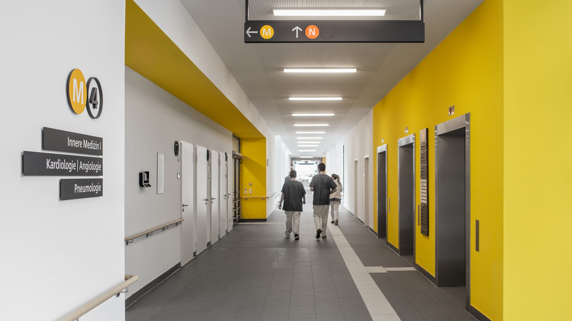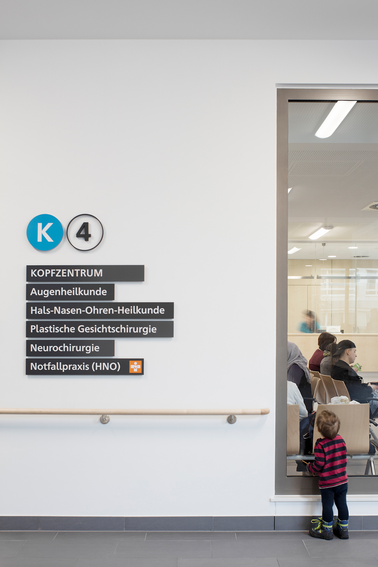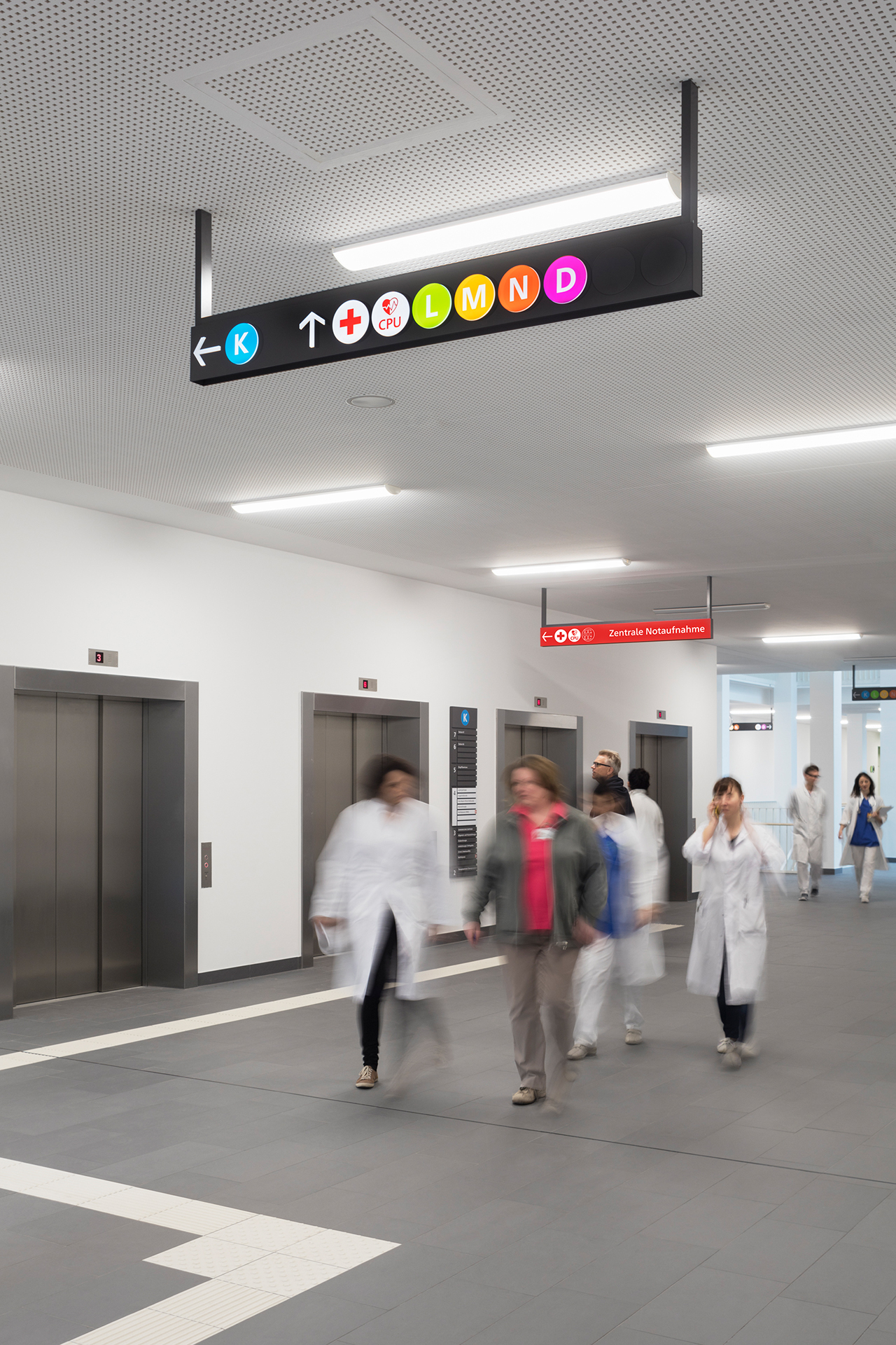 Die Signaletik basiert auf dem Konzept, komplexe Informationen in einfache und modulare Piktogramme, Symbole und Elemente zu übersetzen. Auf Basis der modularen Elementgruppen kann das Konzept auf unterschiedliche Kliniken angewendet werden.