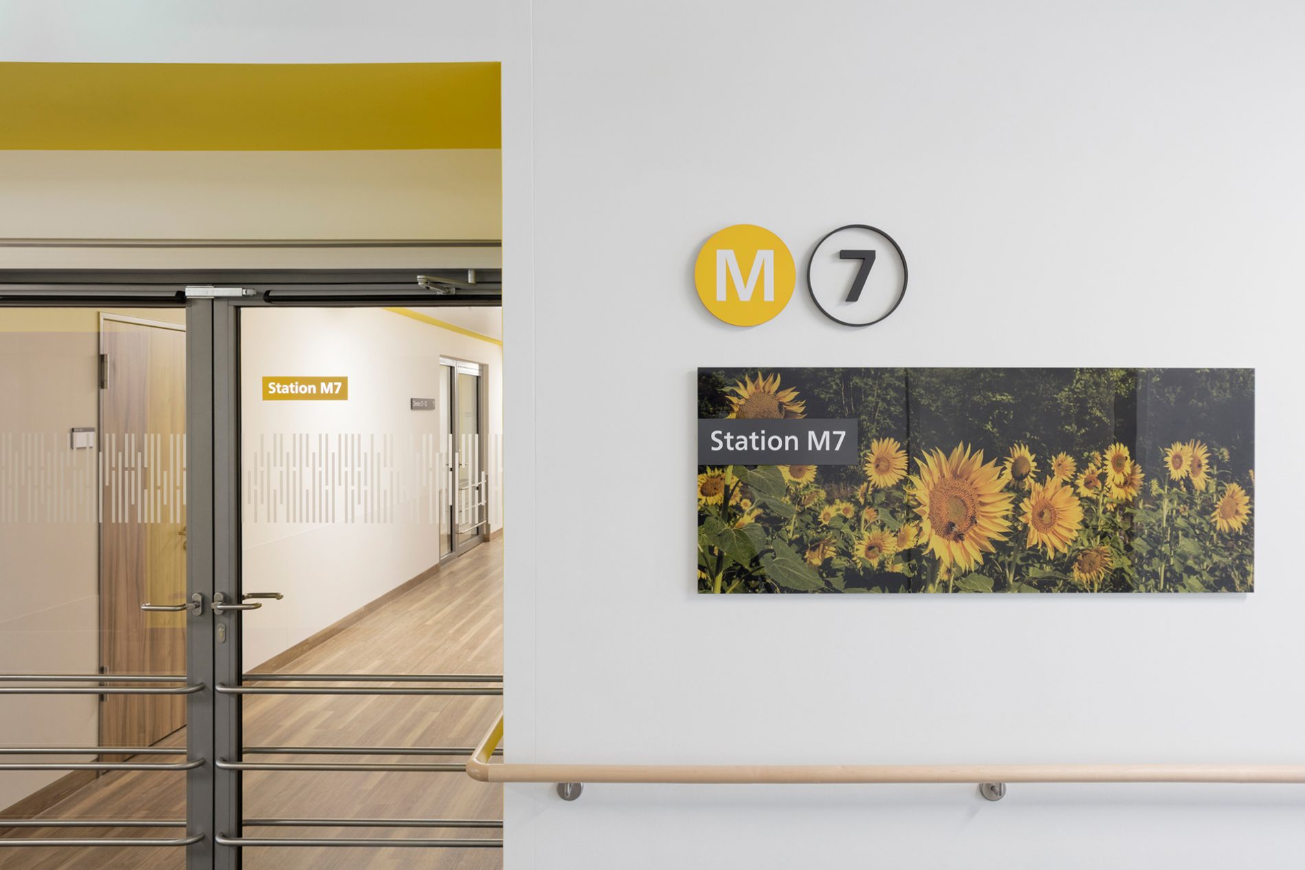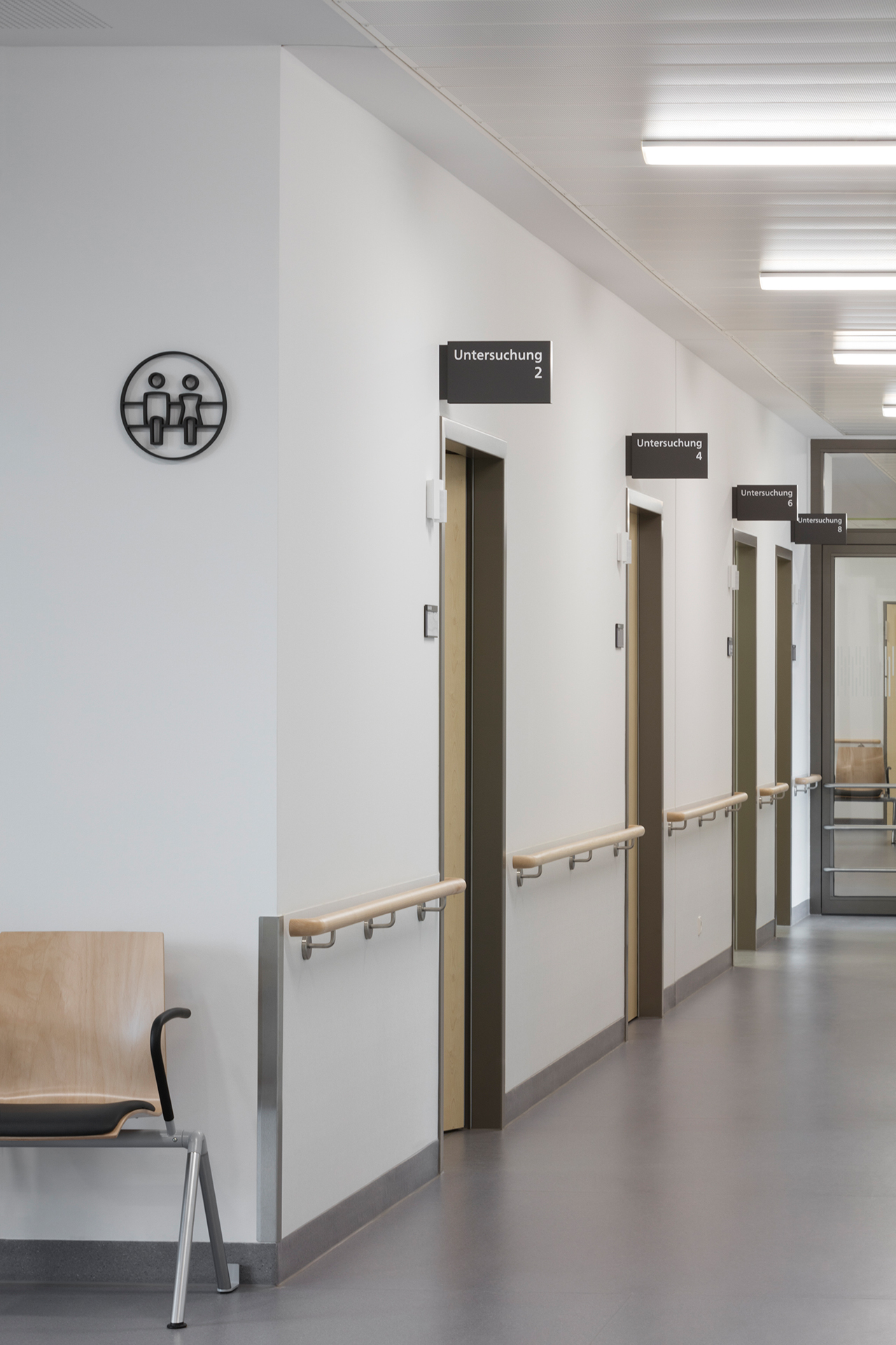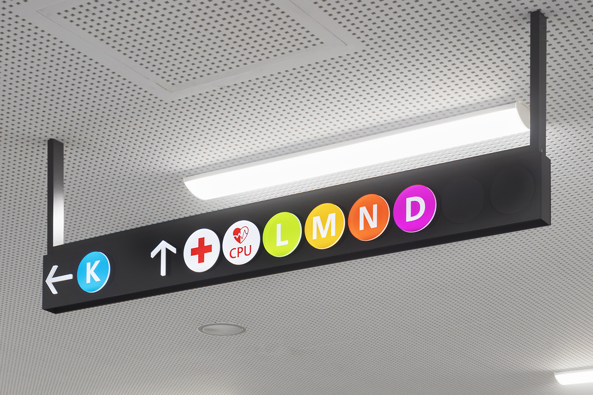 Die Signaletik basiert auf dem Konzept, komplexe Informationen in einfache und modulare Piktogramme, Symbole und Elemente zu übersetzen. Auf Basis der modularen Elementgruppen kann das Konzept auf unterschiedliche Kliniken angewendet werden.