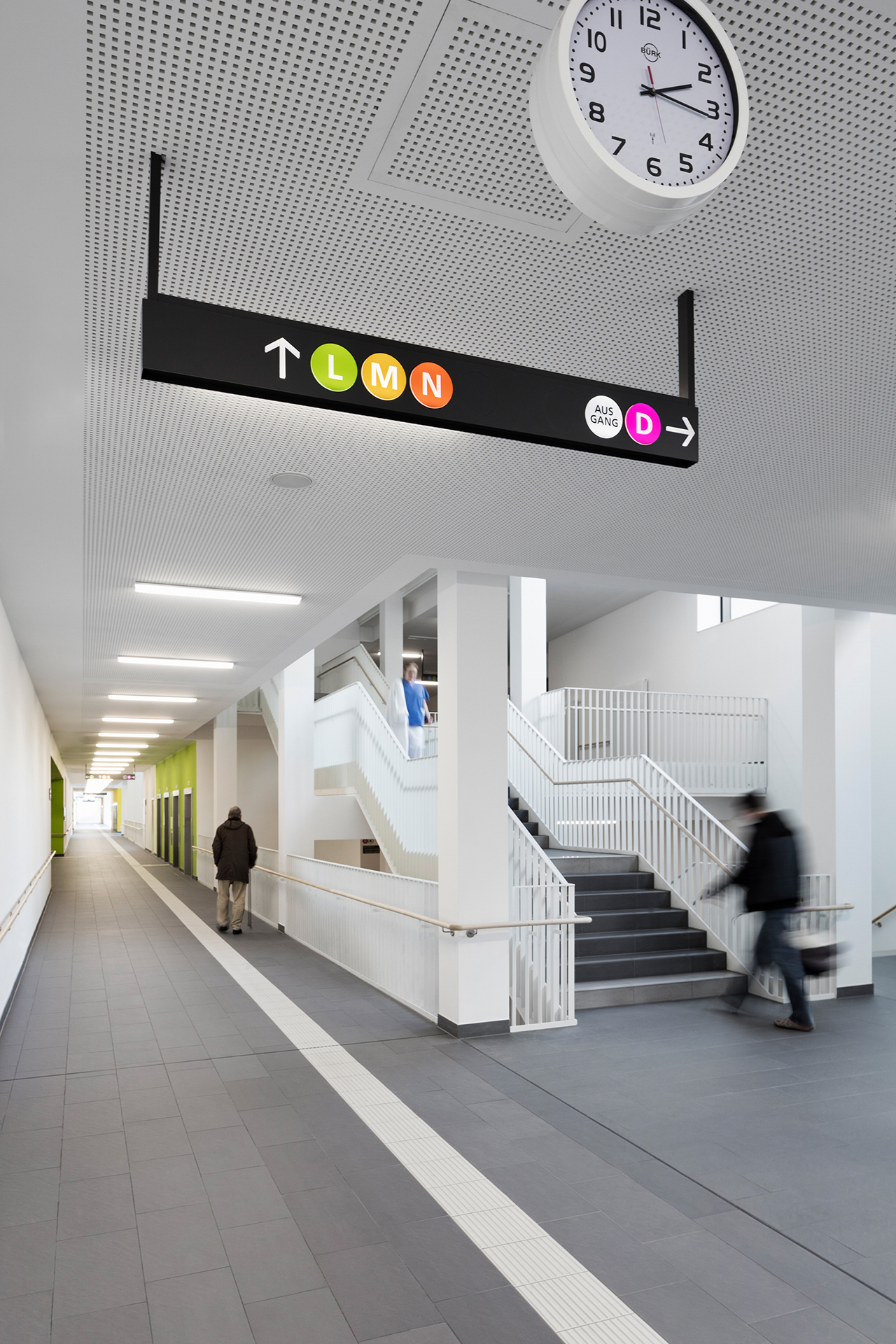 Die kreisrunden Zielpunkte der beleuchteten Tracks sind in Farbe, Größe und Typografie auf die Bedürfnisse stark Sehbehinderter mit Hilfe des Sehbehinderten-Simulators des ABSV eingeregelt worden. Die Farbcodierung der Icons erfolgte in Abstimmung mit dem Farbkonzept der Architektur und des Interior Design.