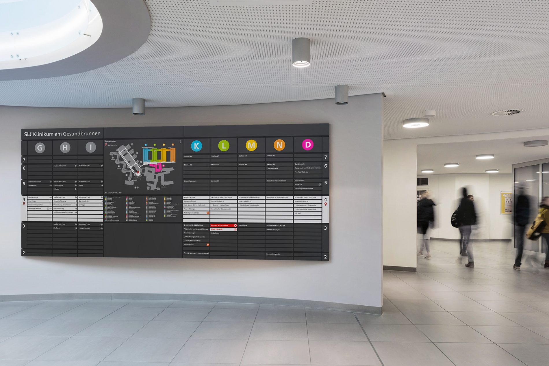 Ziel der SLK-Kliniken ist eine moderne und zukunftsfähige Klinikgruppe, welche die Gesundheitsvorsorge, die Fürsorge und die umfassende Betreuung der Patienten und Ihrer Angehörigen sicherstellt. Das Klinikum am Gesundbrunnen ist ein heterogenes, historisch gewachsenes Ensemble aus verschiedenen Bauepochen. In einem 1. Bauabschnitt wurde das Klinikum umfassend erweitert. Ein 2. Bauabschnitt ist geplant. Die neue Signaletik hat die Aufgabe die differenzierte bauliche Struktur unter Beachtung der provisorischen Zwischenlösungen zwischen den Bauabschnitten sowie der Struktur nach Fertigstellung des 2. Bauabschnittes abzubilden. Das Konzept der Signaletik ist aus diesem Grund für die einzelnen Phasen des Projektes modular angelegt. Im Klinikum am Gesundbrunnen nimmt die Signaletik die Farbcodierung einzelner Bauteile auf. Schrittweise wird nach Inbetriebnahme oder Abriss einzelner Bauabschnitte die Signaletik angepasst, ohne dass das Gesamtkonzept geändert werden muss.