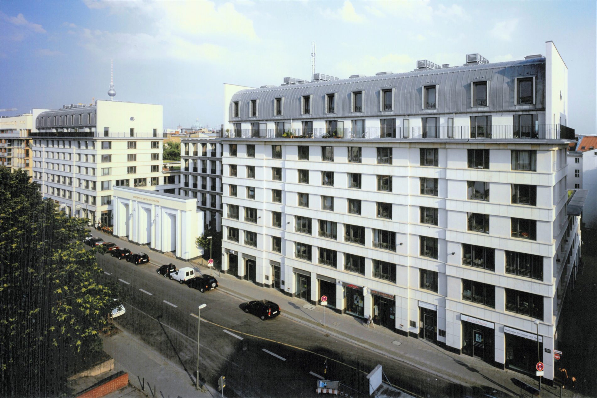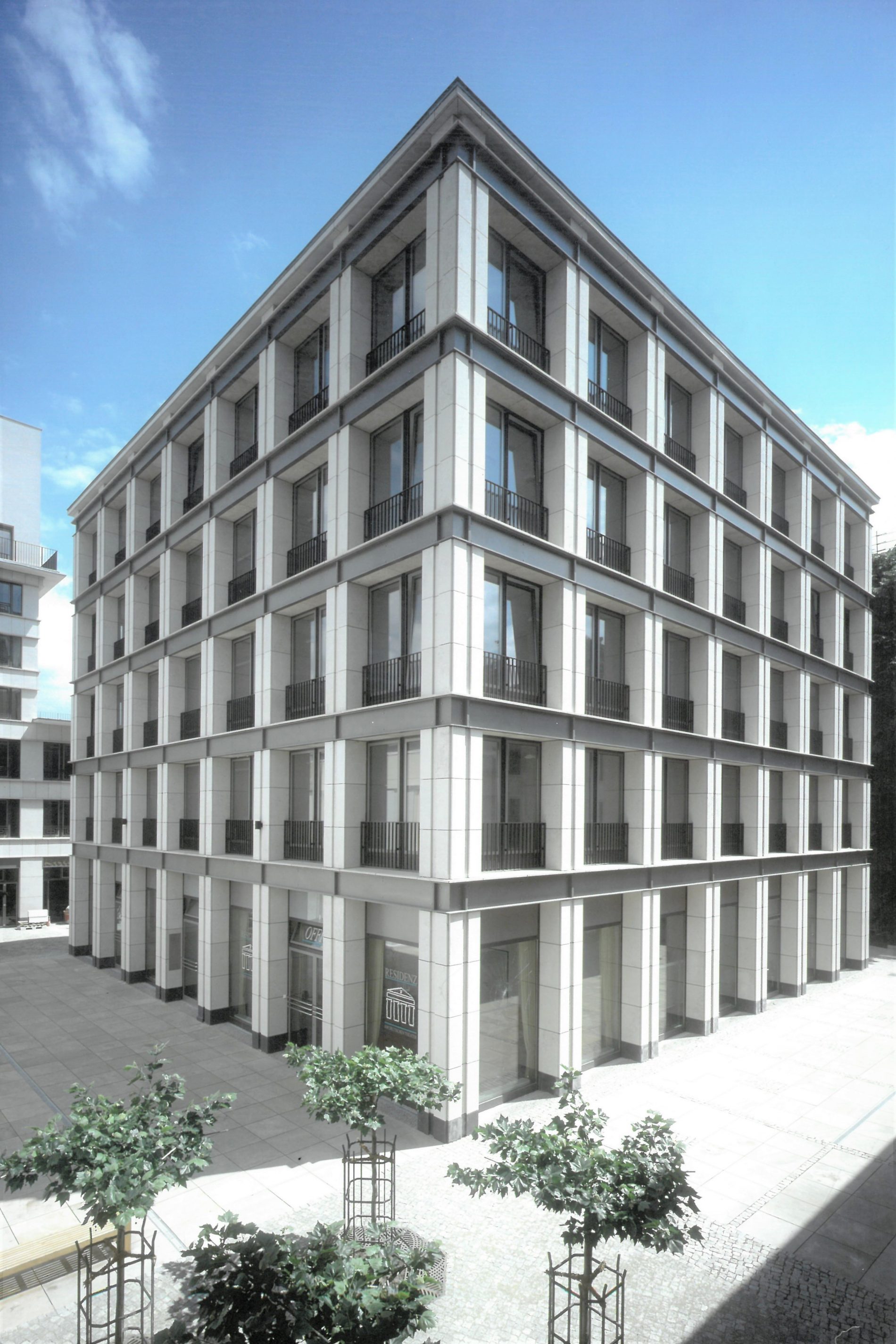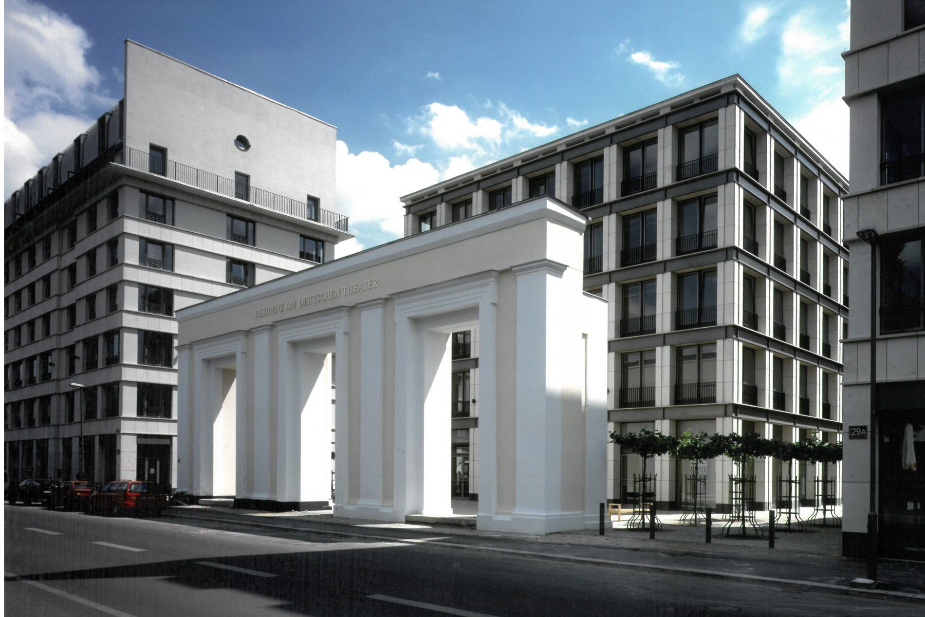 Das im Konzept restaurierte, unter Denkmalschutz stehende Portal einer im Zweiten Weltkrieg zerstörten Reithalle eines Schülers von Carl Friedrich Schinkel öffnet den durch die drei Neubauten begrenzten kleinen Stadtplatz zur Reinhardtstraße. Der dadurch entstehende öffentliche Raum ist Entree und Aufenthaltsbereich. Das Portal schirmt zugleich den Platz zum Straßenraum ab. Die solitären Gebäude arrondieren den historischen Block, ohne die städtebauliche Ursprungsform zu kopieren.