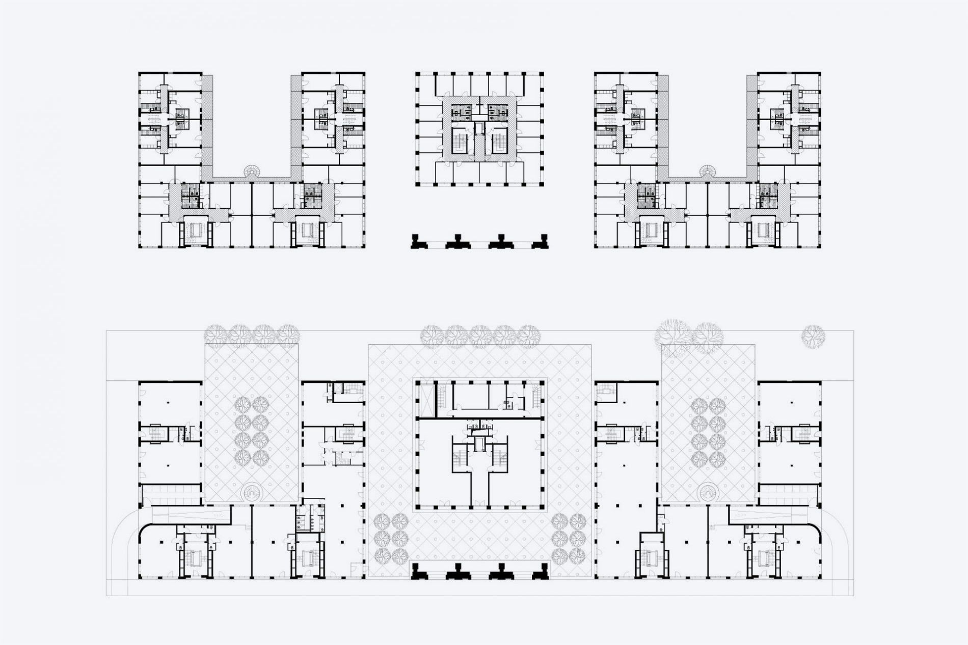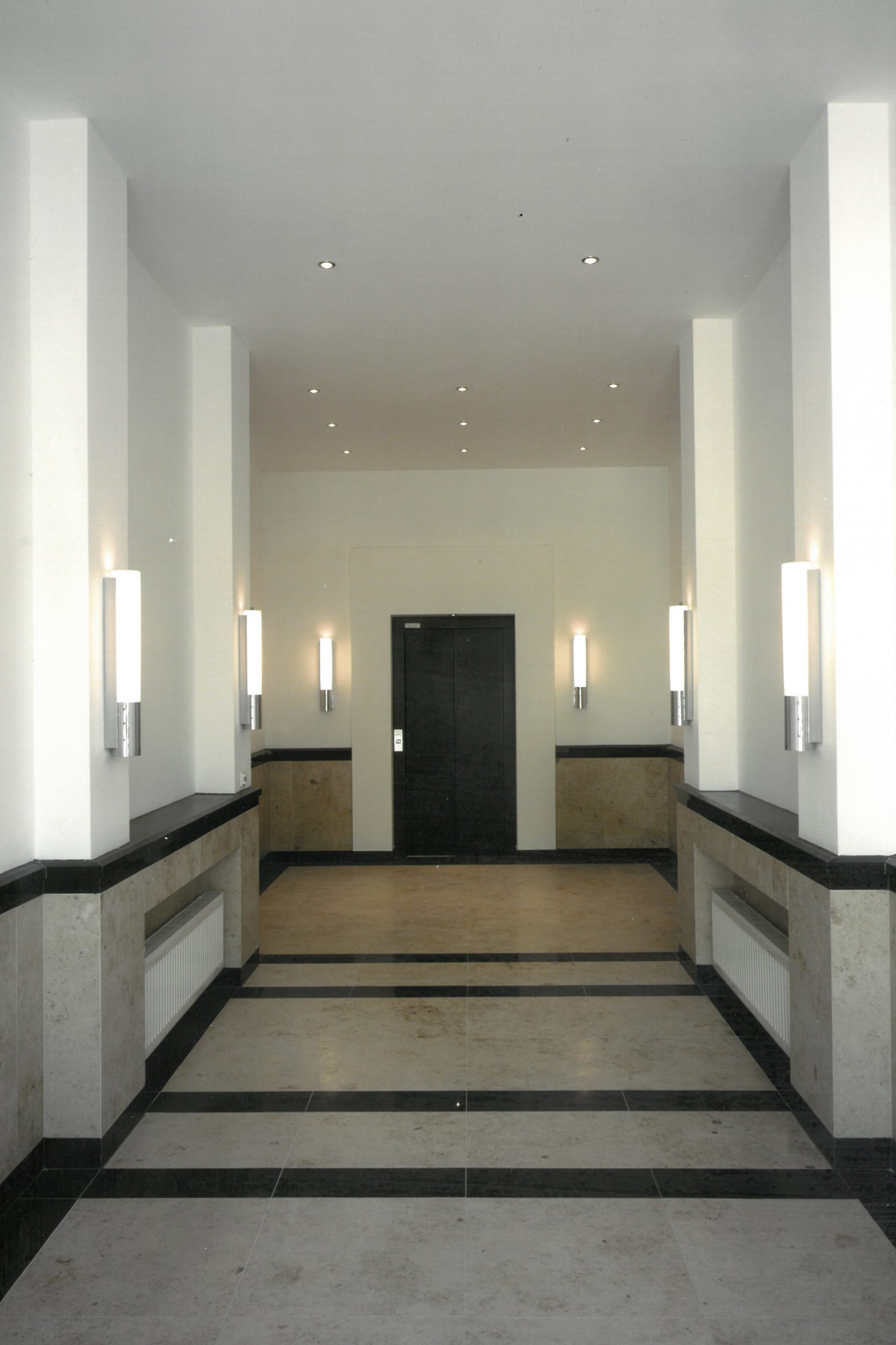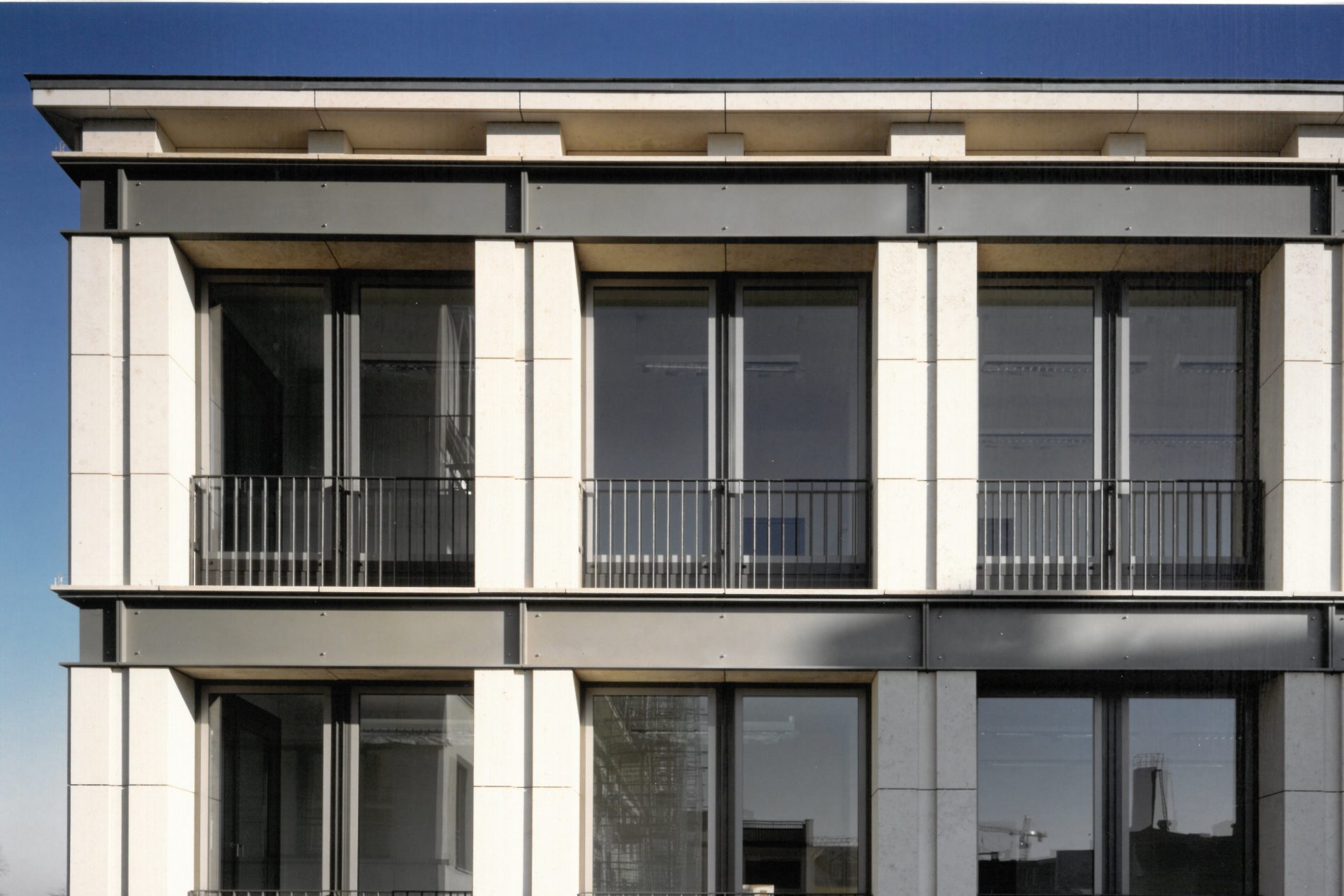 Das im Konzept restaurierte, unter Denkmalschutz stehende Portal einer im Zweiten Weltkrieg zerstörten Reithalle eines Schülers von Carl Friedrich Schinkel öffnet den durch die drei Neubauten begrenzten kleinen Stadtplatz zur Reinhardtstraße. Der dadurch entstehende öffentliche Raum ist Entree und Aufenthaltsbereich. Das Portal schirmt zugleich den Platz zum Straßenraum ab. Die solitären Gebäude arrondieren den historischen Block, ohne die städtebauliche Ursprungsform zu kopieren.