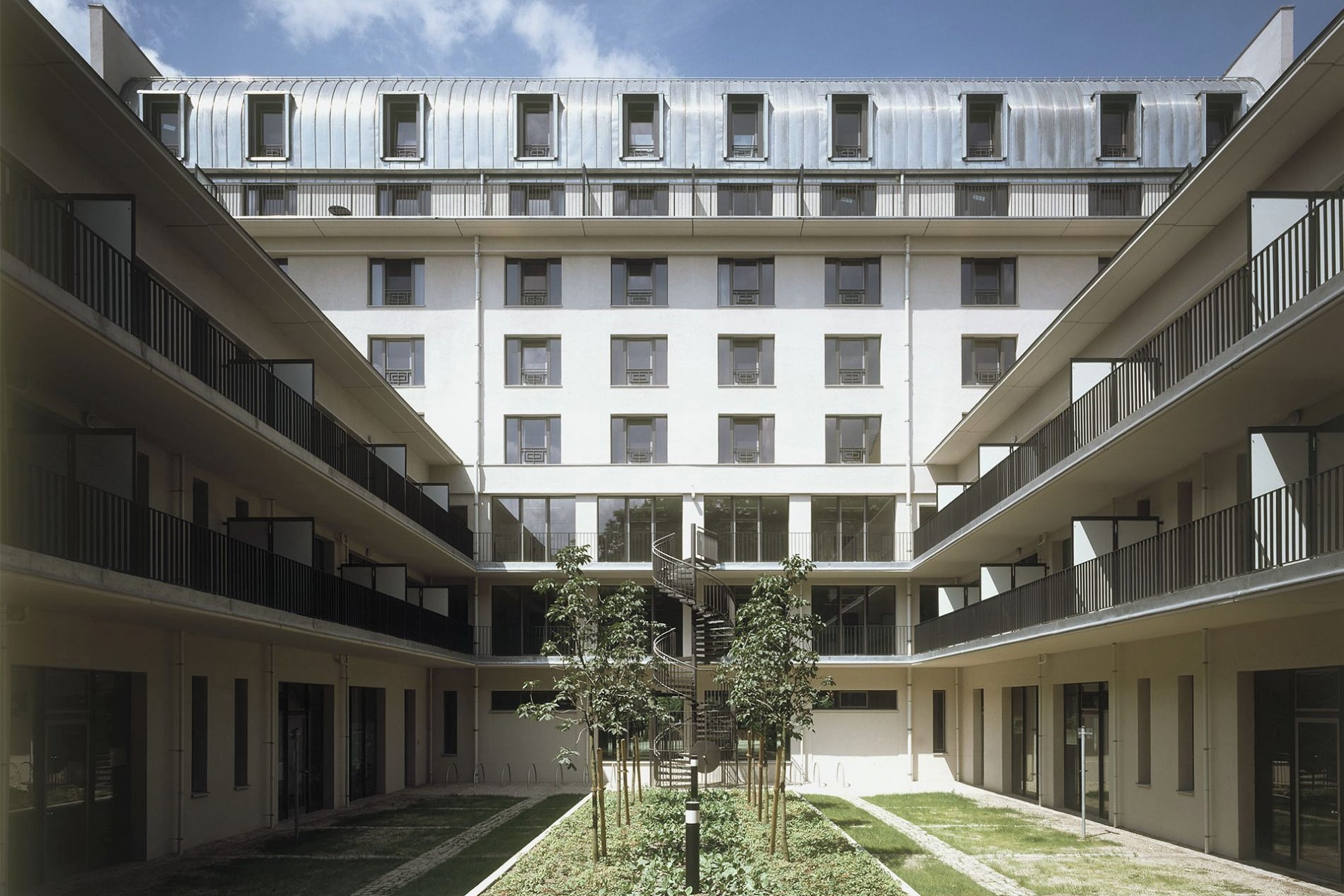 Auf dem Grundstück waren nach dem Zweiten Weltkrieg in provisorischen Gebäuden die Probebühne des Deutschen Theaters sowie die Werkstätten des Theaterplastikers Eduard Fischer untergebracht. Die Probebühne des Deutschen Theaters wurde in den Untergeschossen des quadratischen Gebäudes im Zentrum des eingeschossigen neuen Ensembles integriert. Der Kubus ist Sinnbild einer typologisch rationalen Urform. Diese Urform wird durch die horizontale und vertikale Gliederung der Fassade in eine architektonisch lesbare Semantik transferiert. Der Haupteingang des Kubus steht in der Achse des historischen Portals und verleiht ihm über den Platzraum hinweg neue Bedeutung.