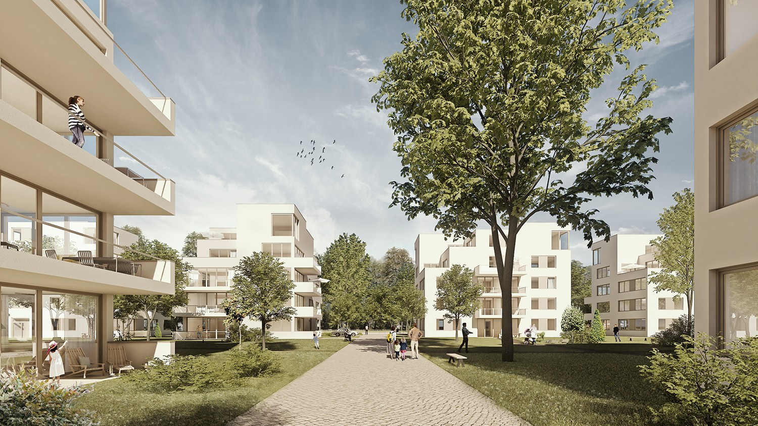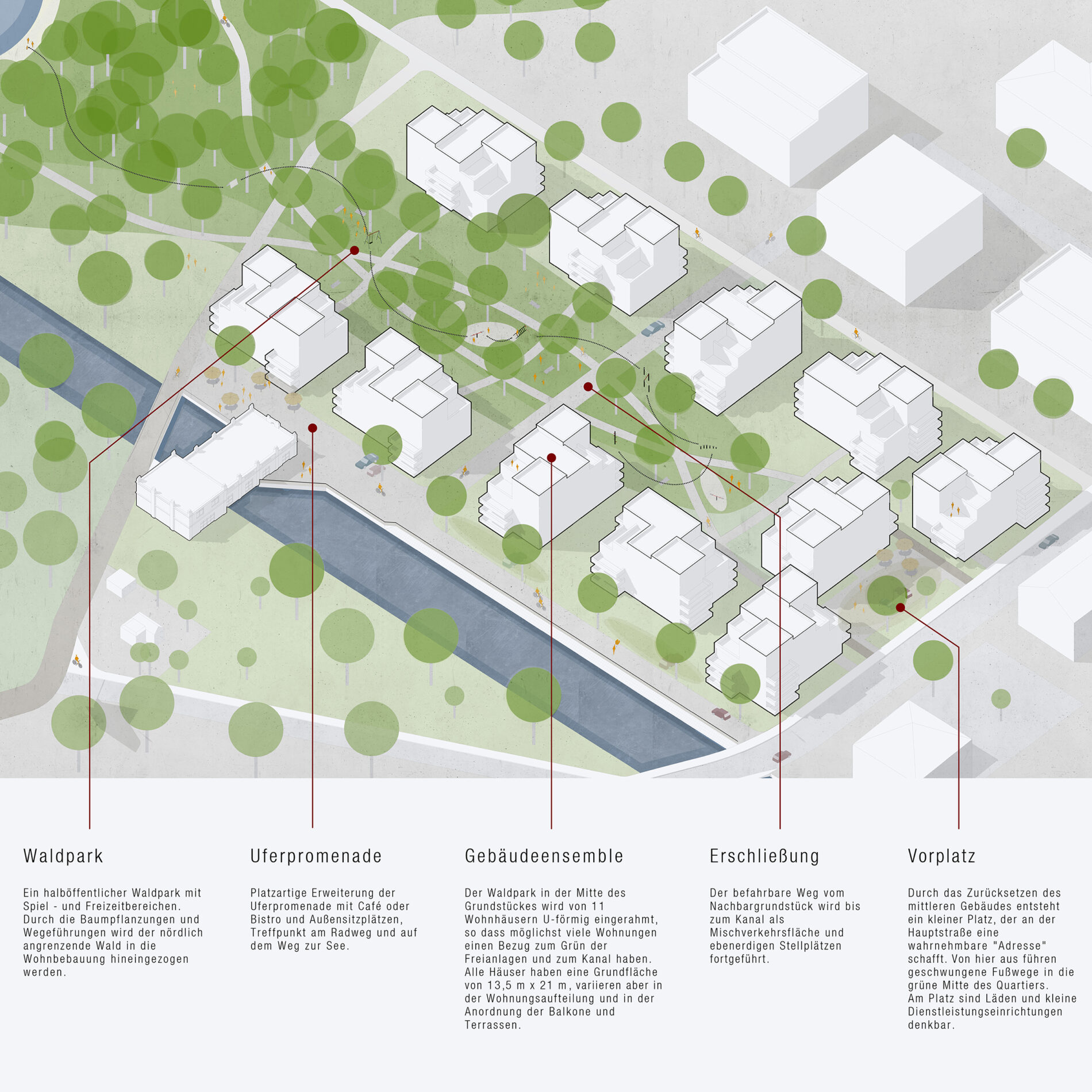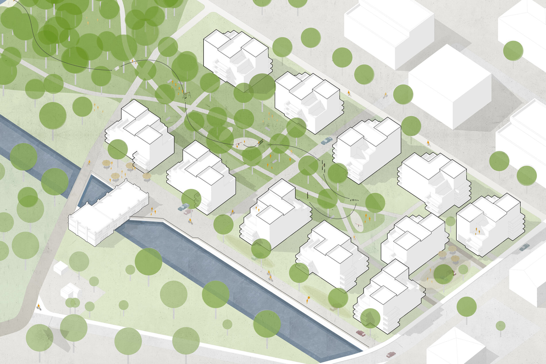 Der Entwurf von KSV überzeugt in der städtebaulichen „Ideenwerkstatt zur Quartiersentwicklung der ehemaligen Spinnerei“. KSV entwickelte ein attraktives und nachhaltiges Bebauungskonzept mit einer offenen villenförmigen Bebauung aus fünfgeschossigen Häusern. Die Gebäudevolumen staffeln sich über Terrassen im 4. und 5. OG zurück, so dass die Häuser geschickt zoniert werden. Ein großer Park in der Mitte des Areals verbindet das Quartier zu den benachbarten Stadtteilen und der Landschaft.